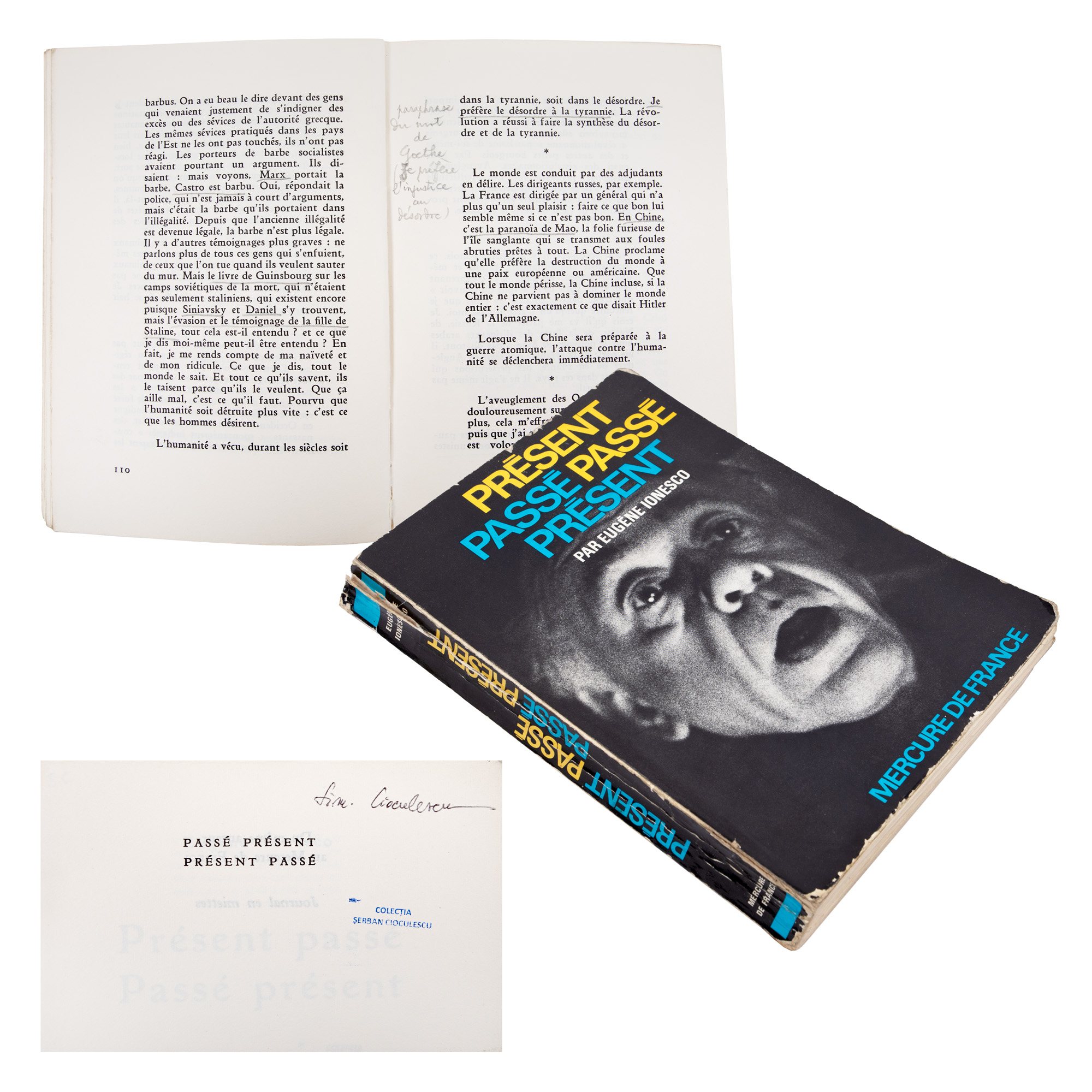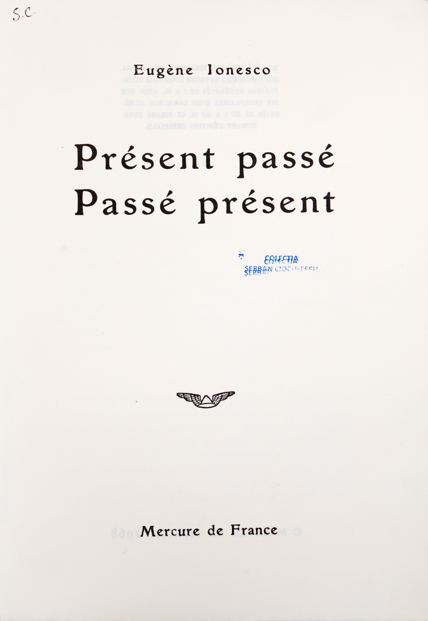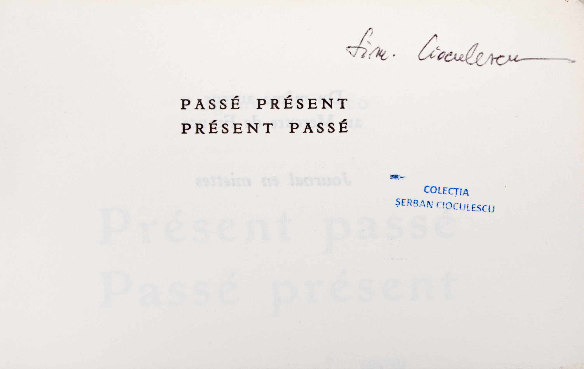 169. "Présent passé passé présent", de Eugen Ionescu, în limba franceză, Alençon, 1968, cu ex-libris Simona Cioculescu, provine din colecția criticului literar Șerban Cioculescu