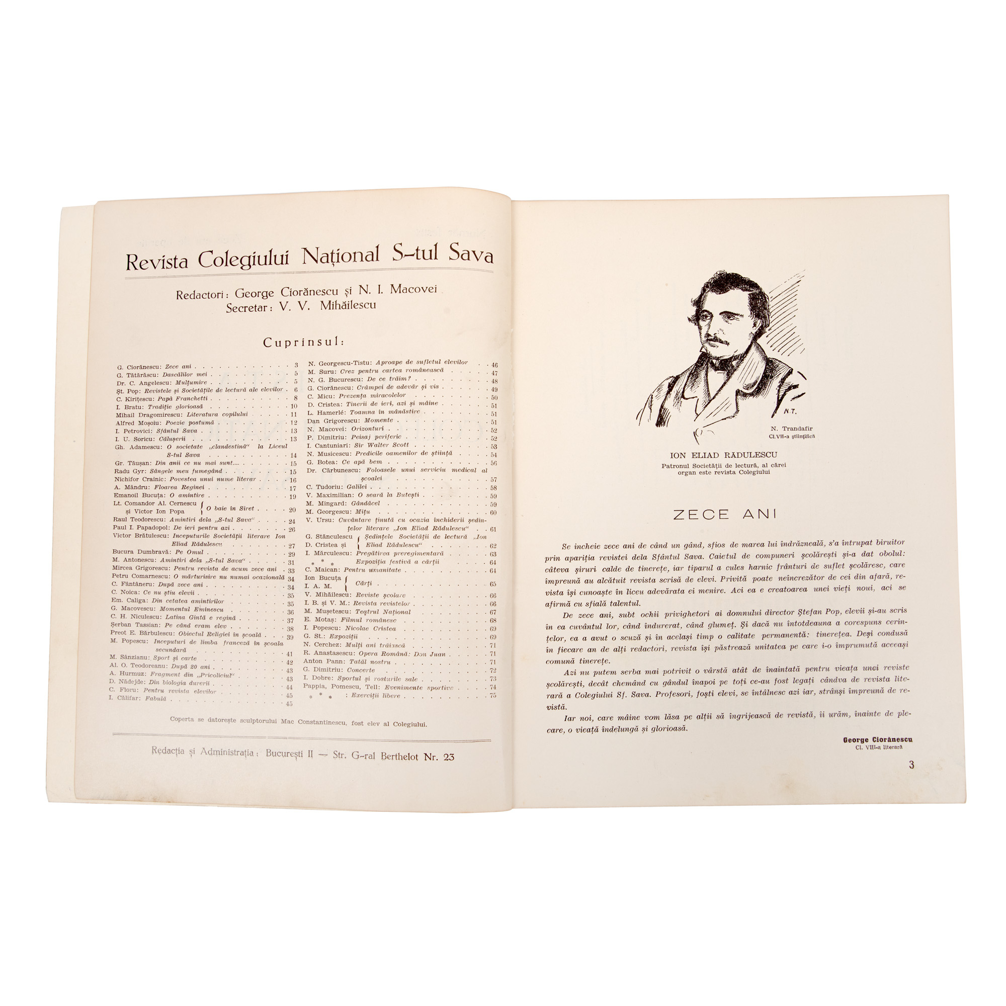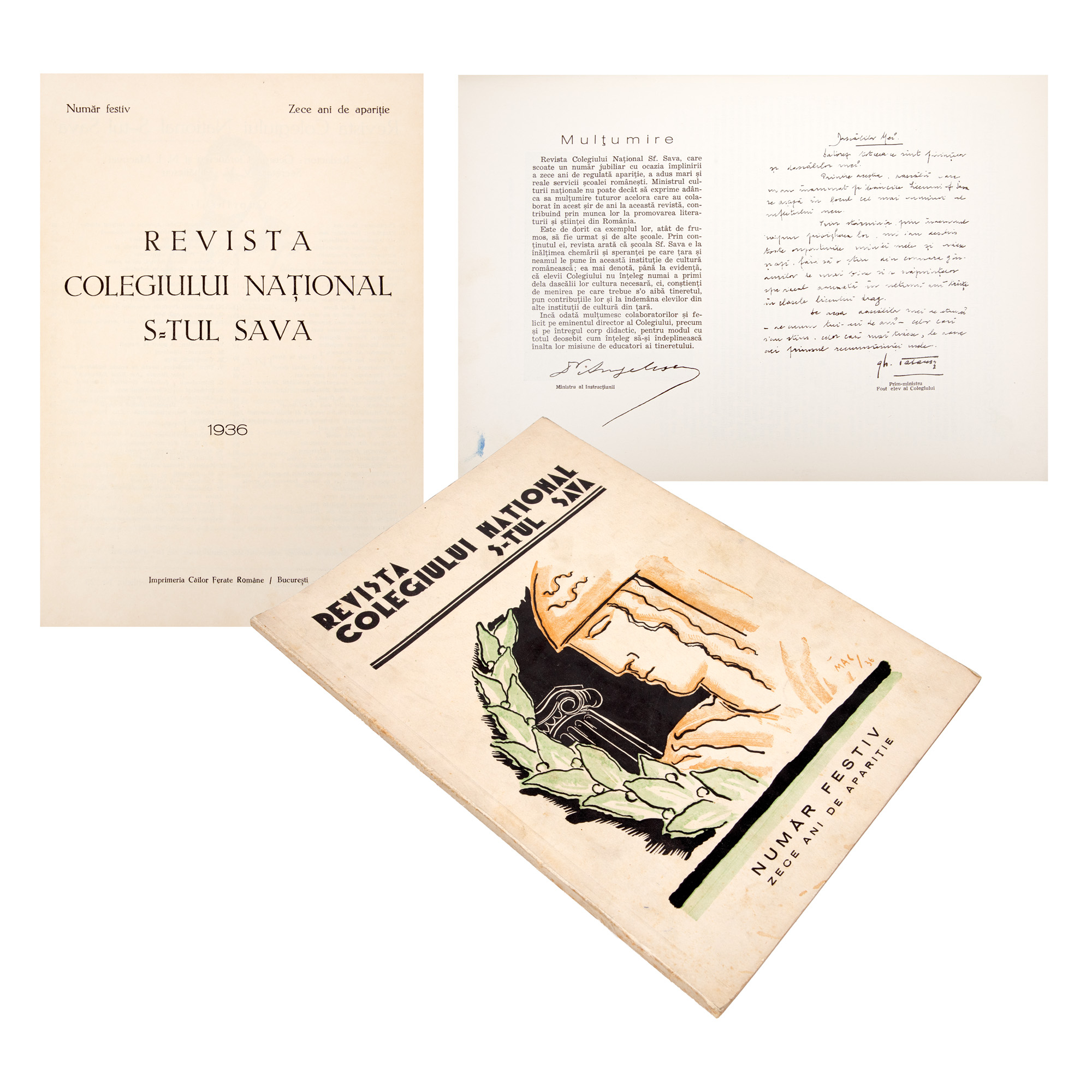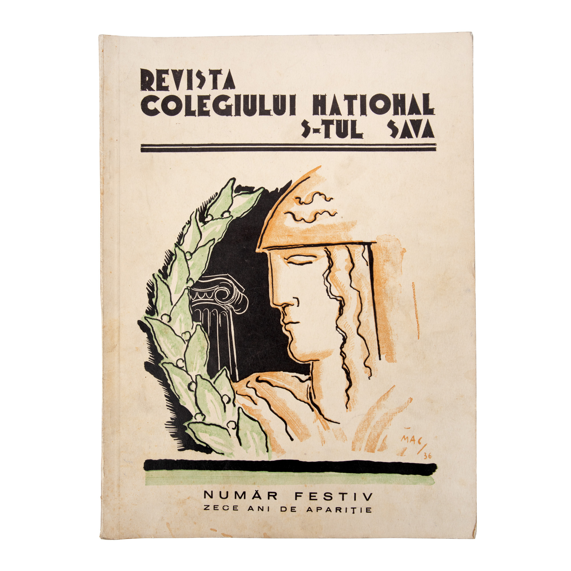 110. ”Revista Colegiului Național Sfântul Sava”, ilustrat de Mac Constantinescu, număr festiv la zece ani de apariție, București, 1936, provine din arhiva fostului ministru de externe George Macovescu