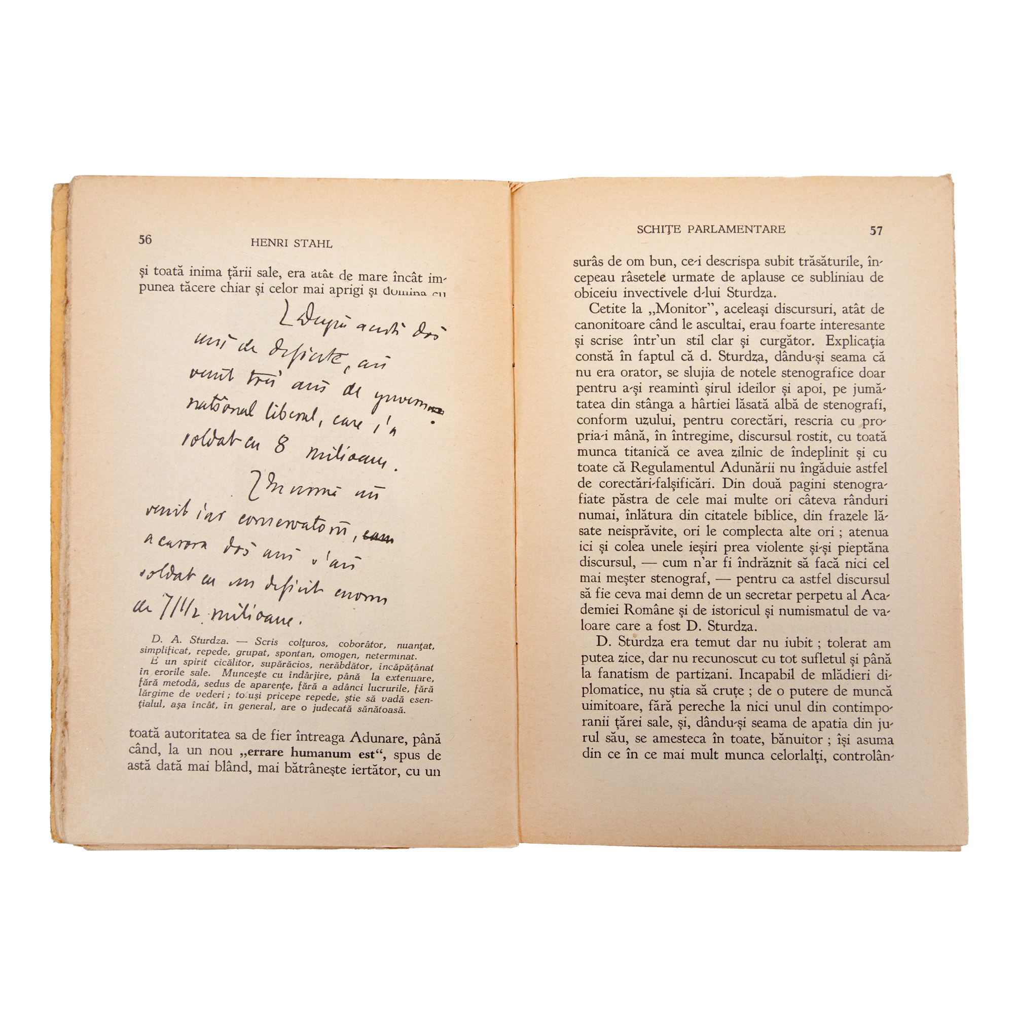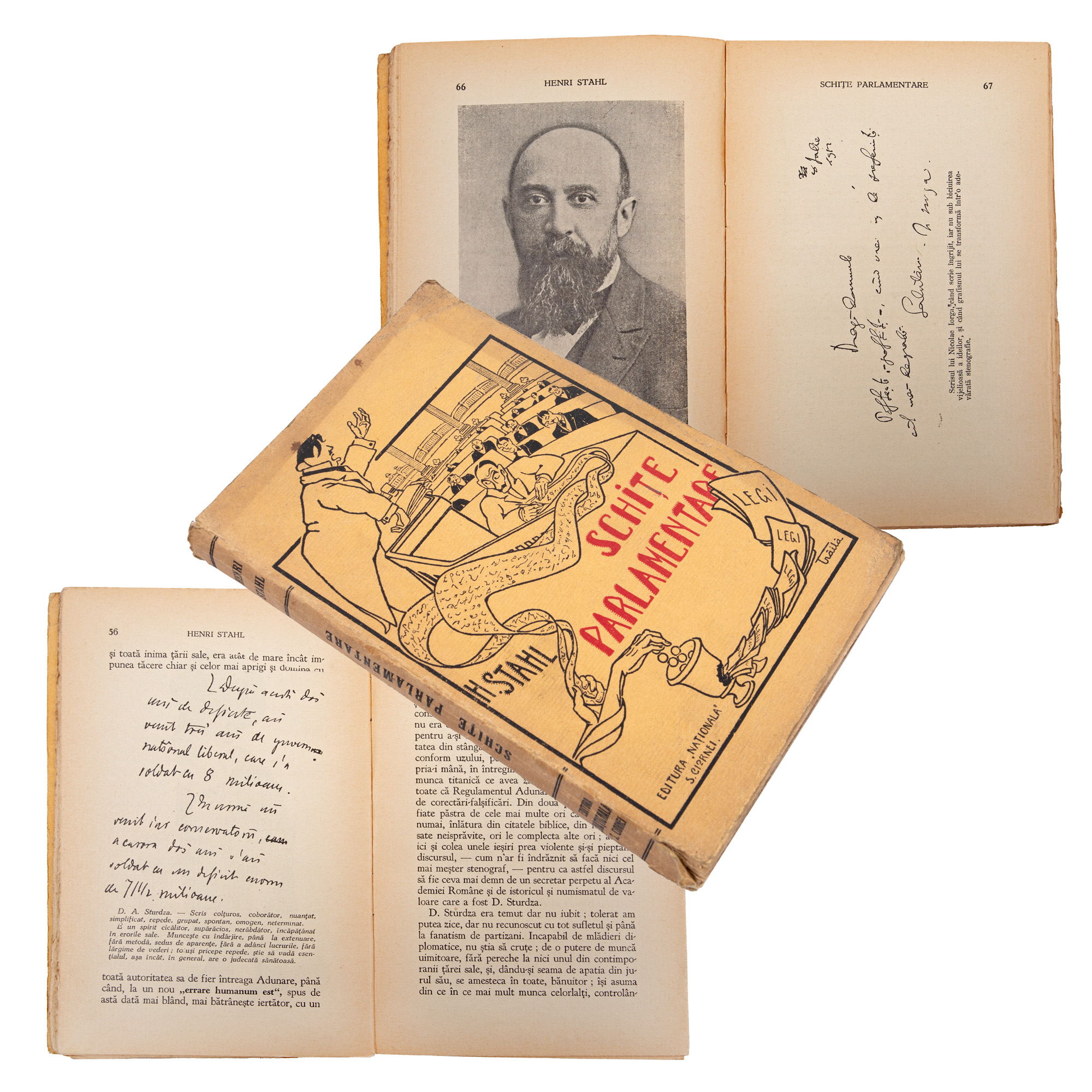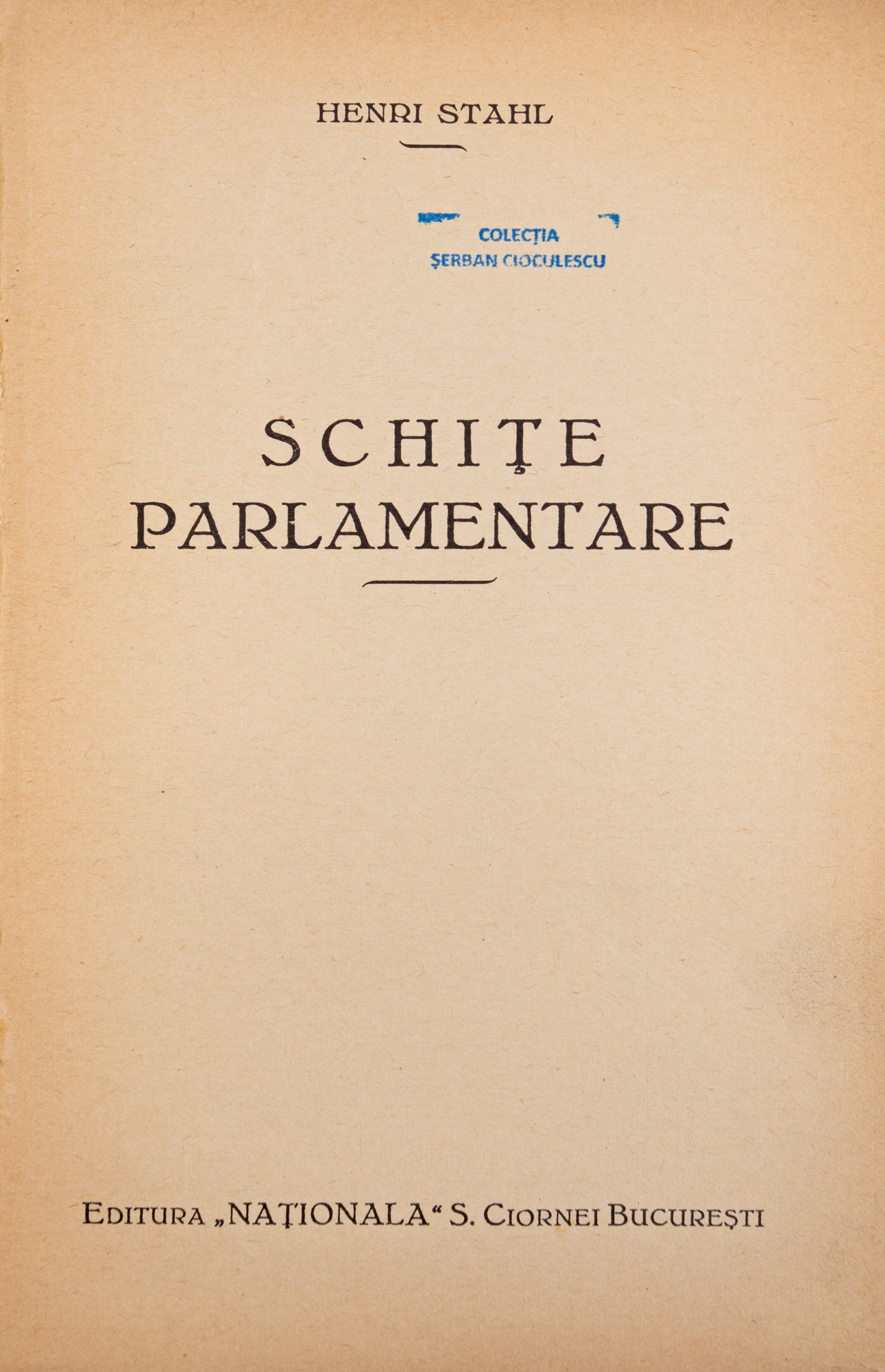 196. "Schițe parlamentare", de Henri Stahl, București, 1918, cu ex-libris, provine din colecția criticului literar Șerban Cioculescu
