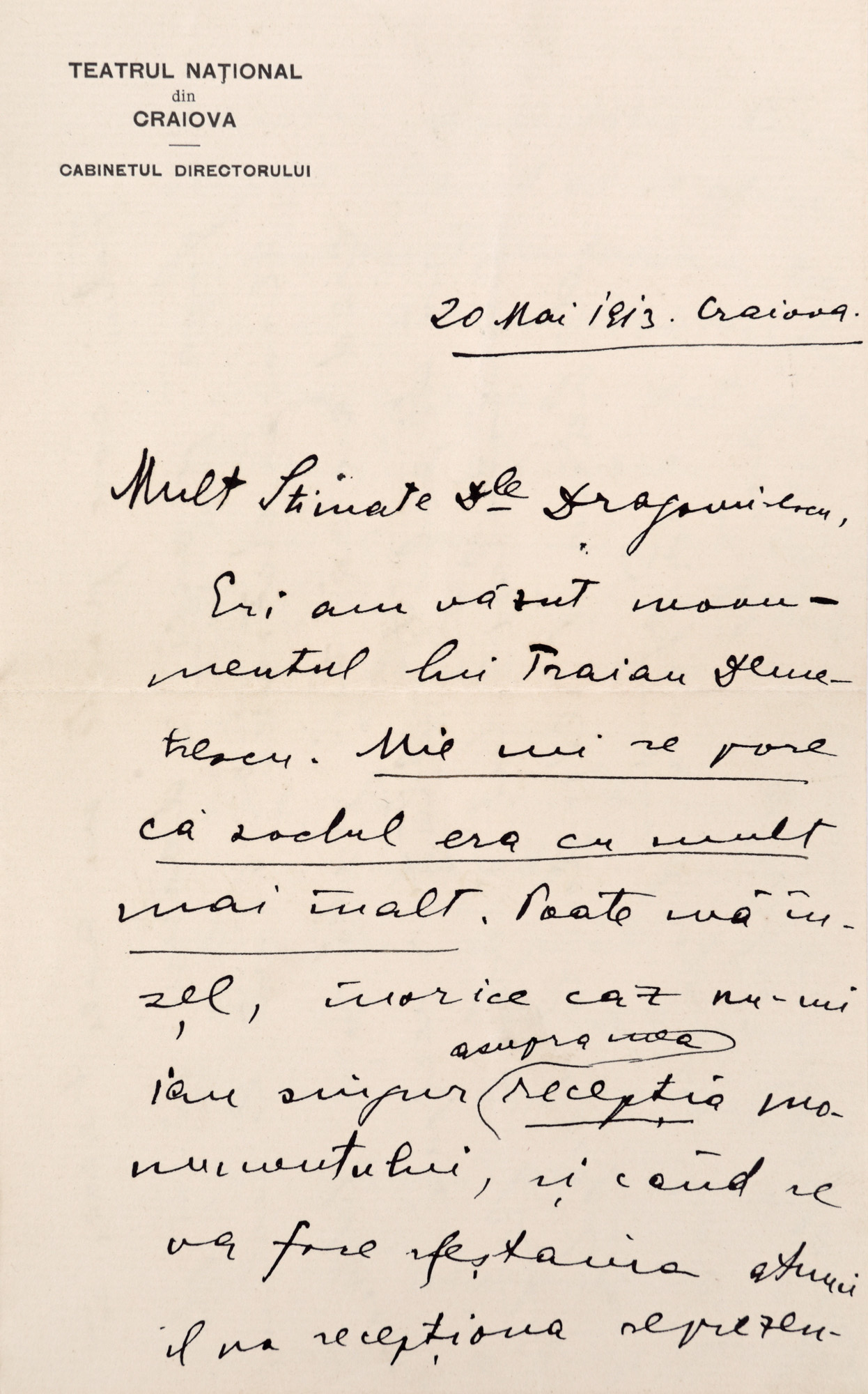 116. Scrisoare trimisă de Emil Gârleanu către Mihail Dragomirescu, Craiova, 1913, cu antetul Teatrului Național din Craiova și semnătura olografă a autorului