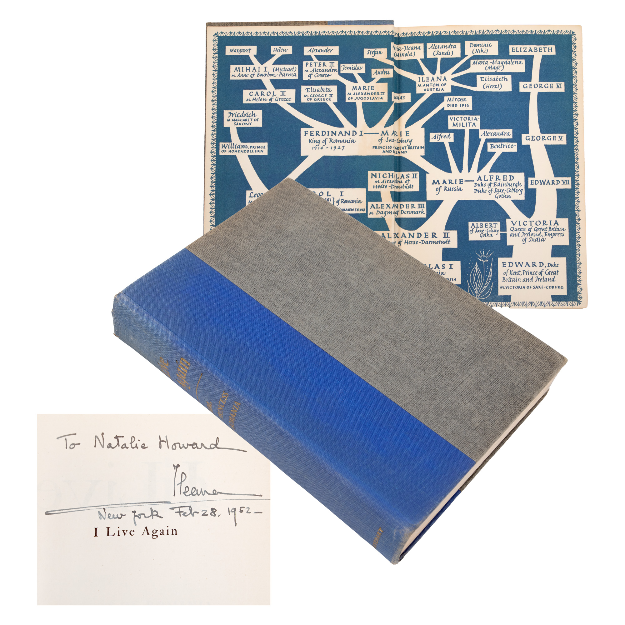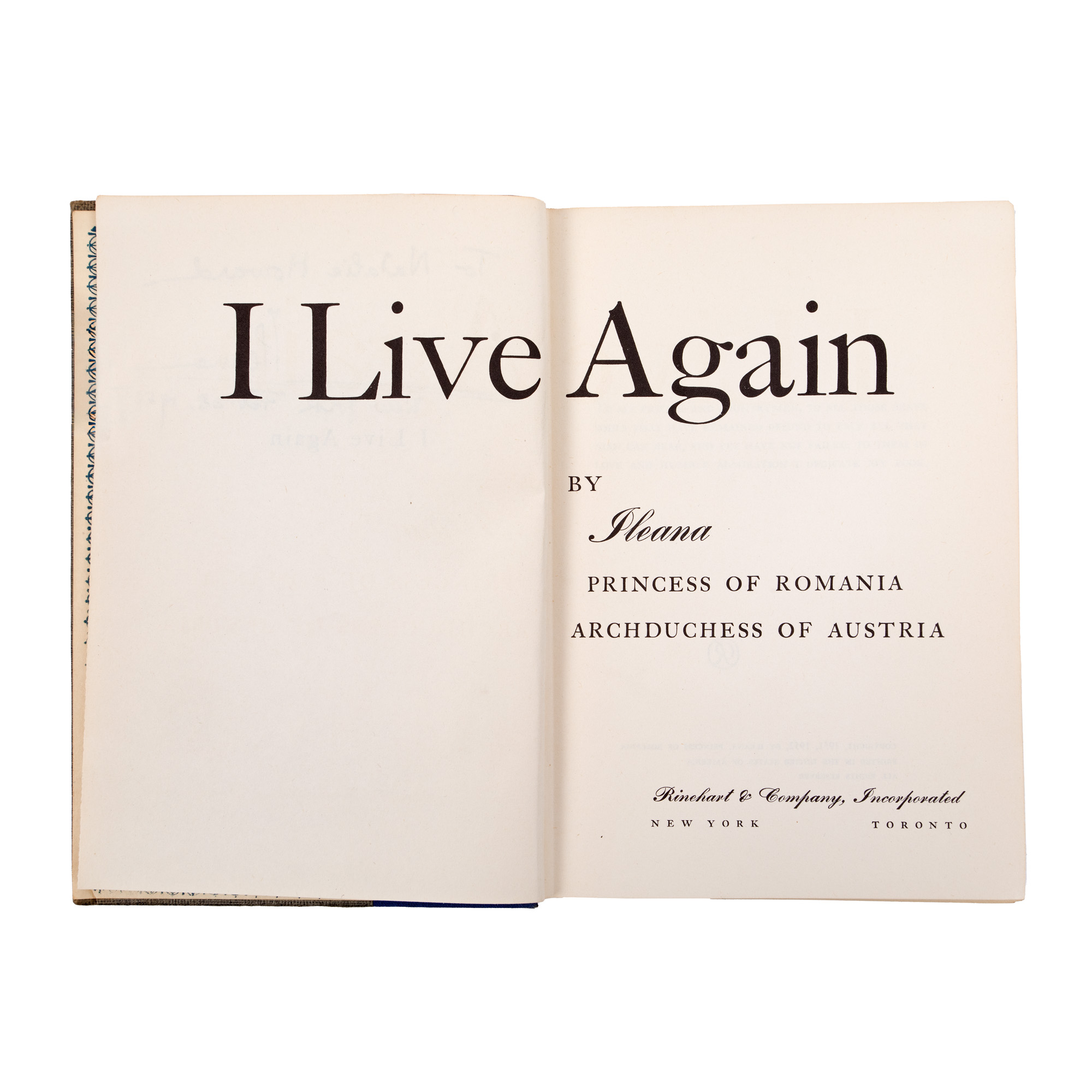 47. ”Trăiesc din nou”, de Principesa Ileana a României, New York, 1952, cu dedicația și semnătura olografă a autoarei