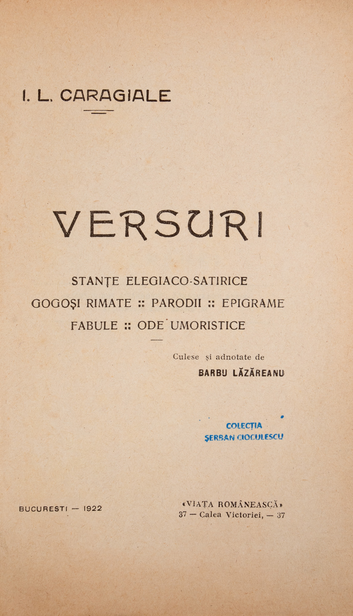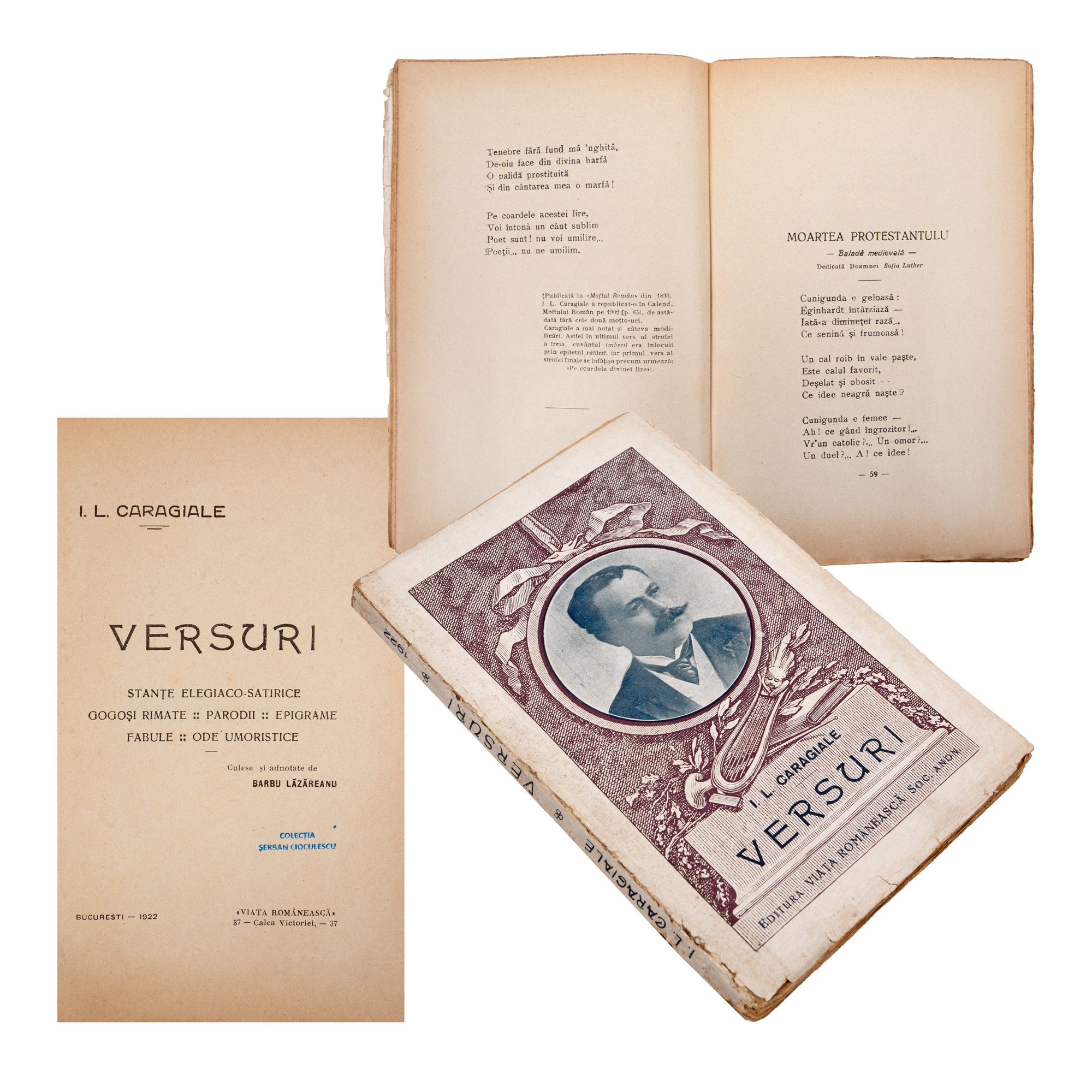 180. "Versuri", de I.L. Caragiale, ediție de Barbu Lăzăreanu, București, 1922, provine din colecția criticului literar Șerban Cioculescu