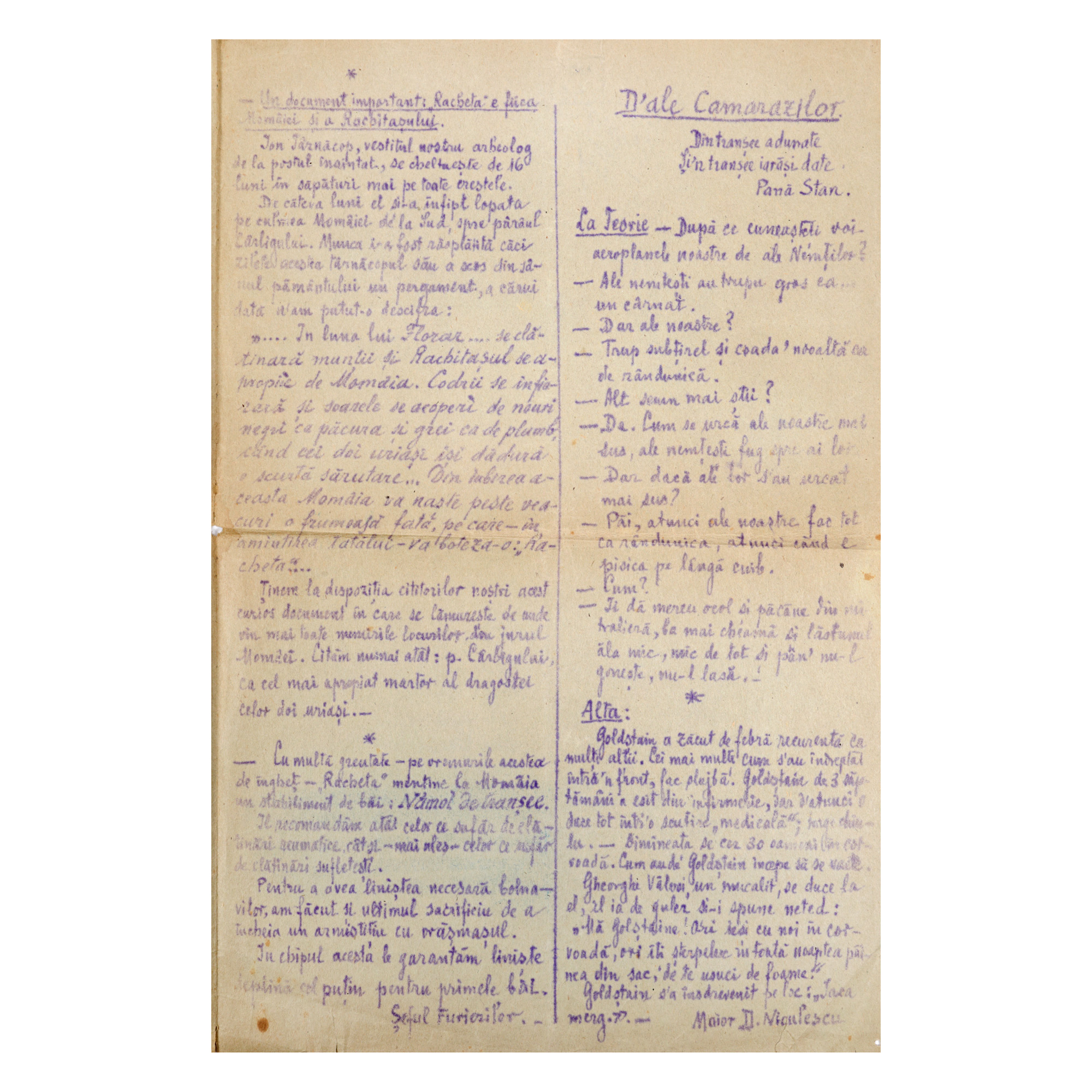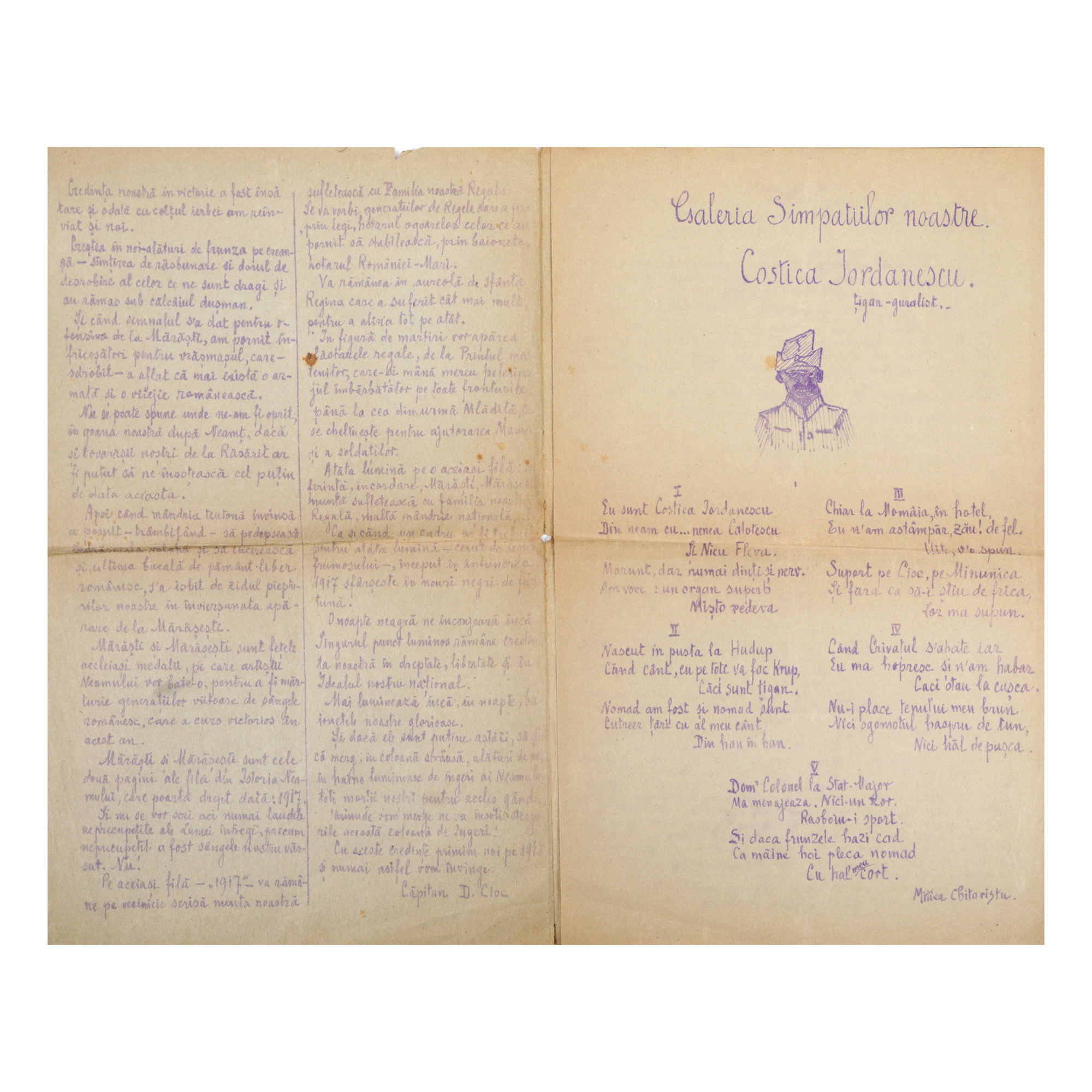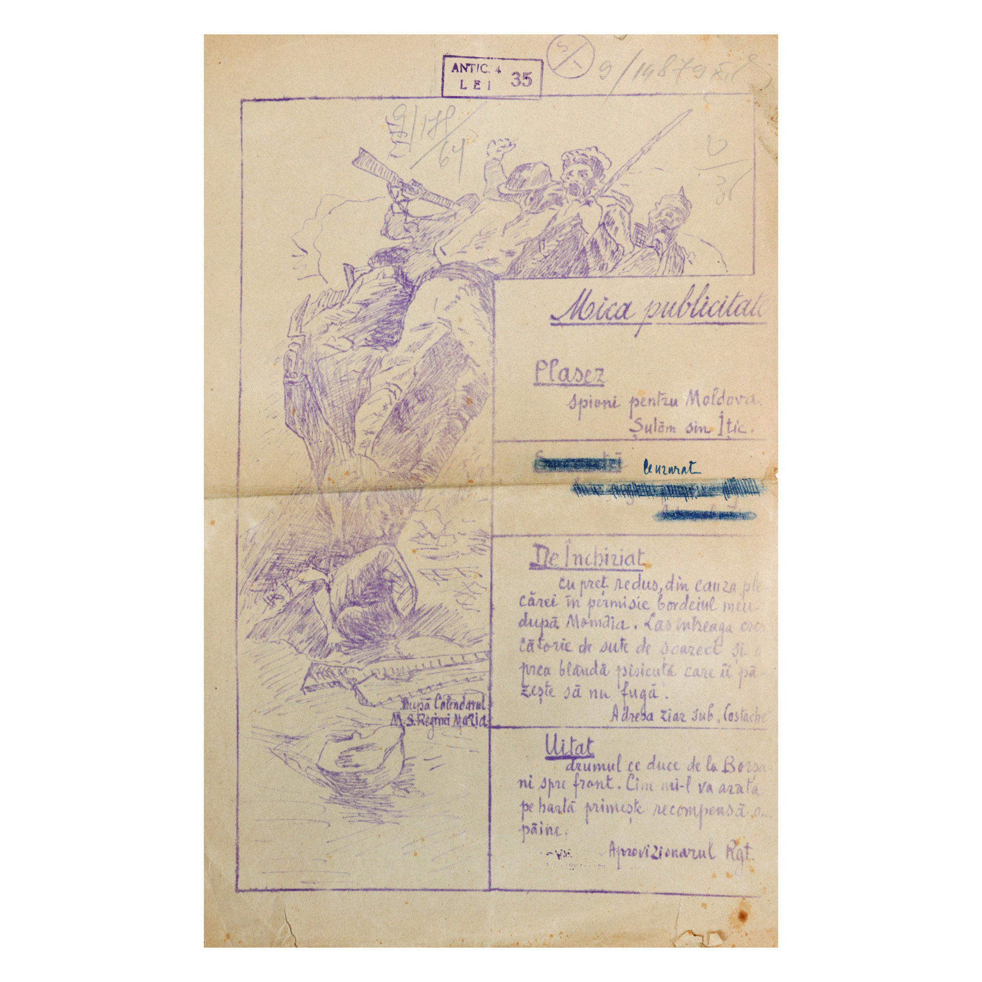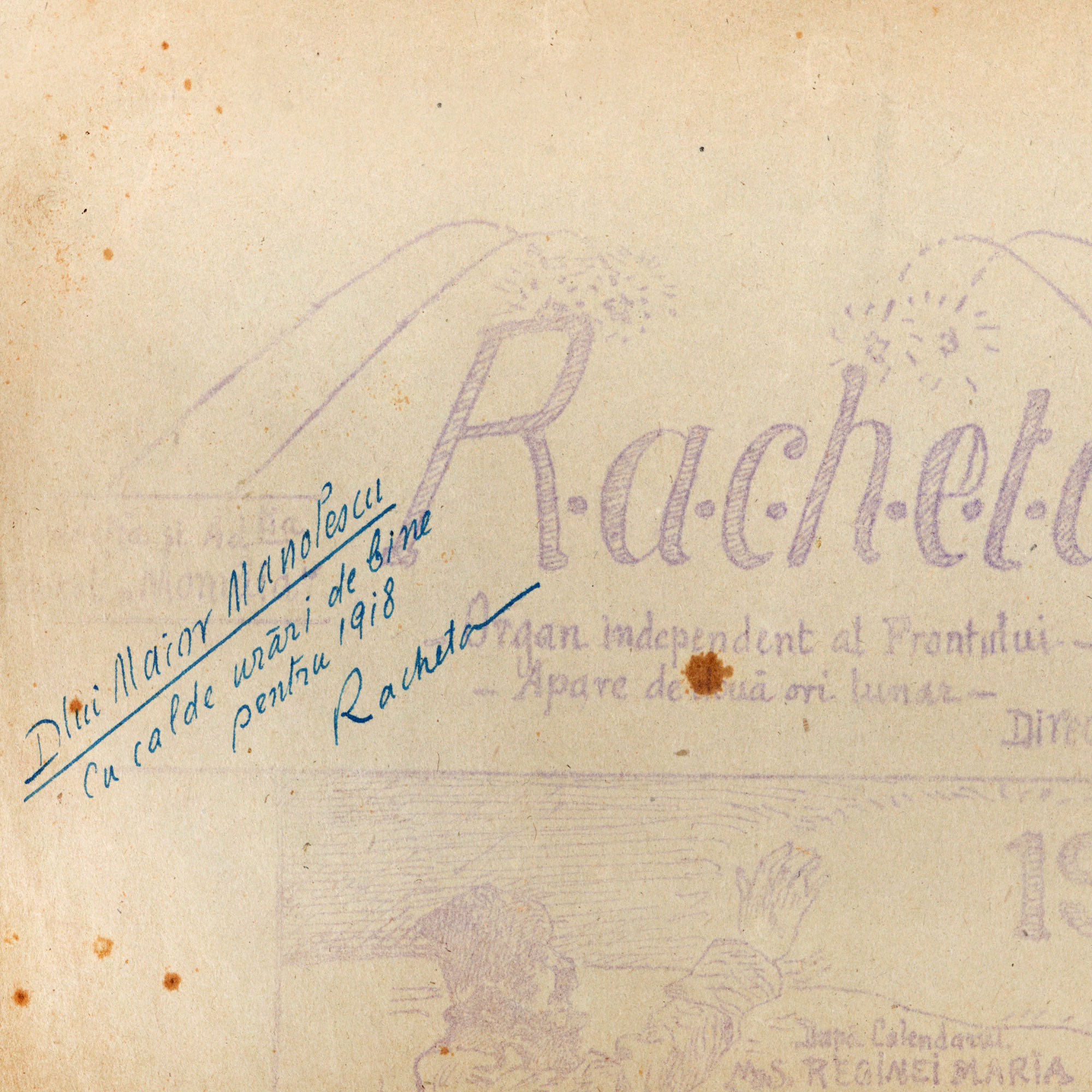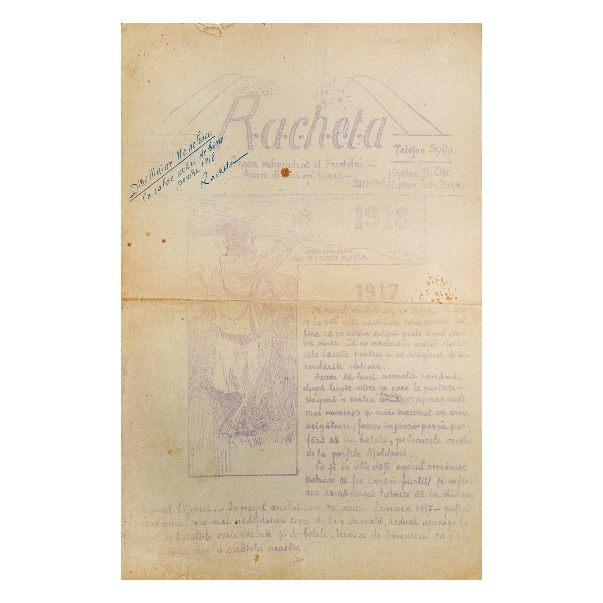 Ziarul "Racheta" era tipărit pe frontul românesc în timpul Primului Război Mondial și distribuit în zonele de operații militare în care luptau cei care îl redactau. Redacția era alcătuită din ofițeri și era condusă de căpitanii D. Cioc și Iuliu Dunca. Ziarul cuprindea articole de propagandă dar și materiale umoristice sau preluări din alte publicații, precum, în cazul de față, din Calendarele editate de regina Maria pentru soldații de pe front în 1917 și 1918. Exemplarul din licitație a suportat intervențiile cenzurii militare care a tăiat anumite articole. "Racheta" era scrisă și ilustrată integral de mână, olograf, pe o hârtie foarte ietfină, disponibilă în zona frontului. După scriere, se imprimau la șapirograf câteva exemplare care circulau în linia întâi. Exemplarul poartă o dedicație olografă a redacției către maiorul Manolescu, probabil ofițerul comandant alcelor doi căpitani redactori-șefi. Piesa este una deosebită, rară, deoarece s-au păstrat foarte puține exemplare dintr-un tiraj oricum foarte redus. Deși prezintă semne ale trecerii timpului, exemplarul se păstrează într-o bună stare de conservare.