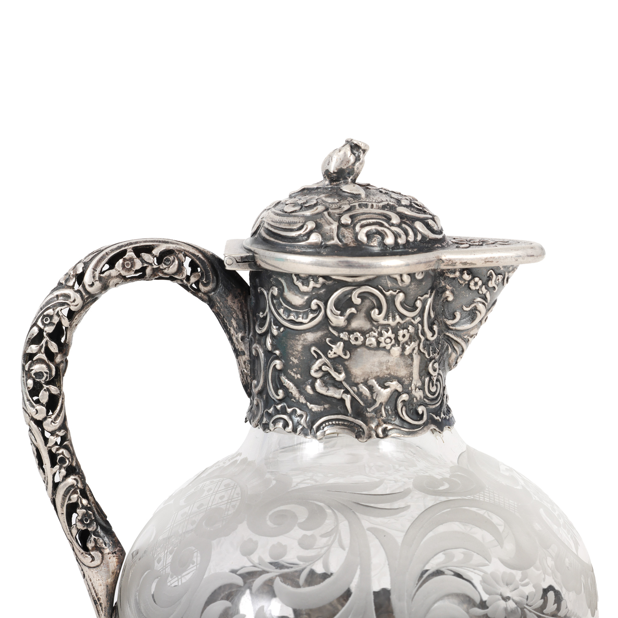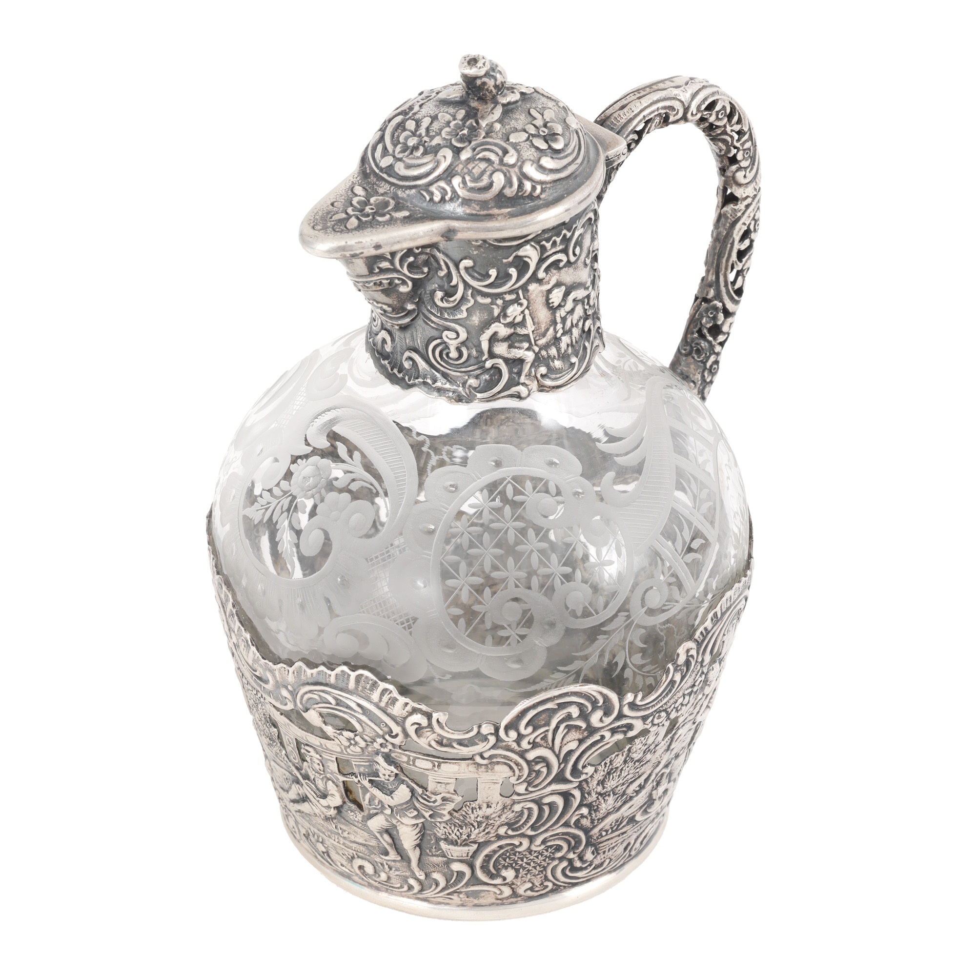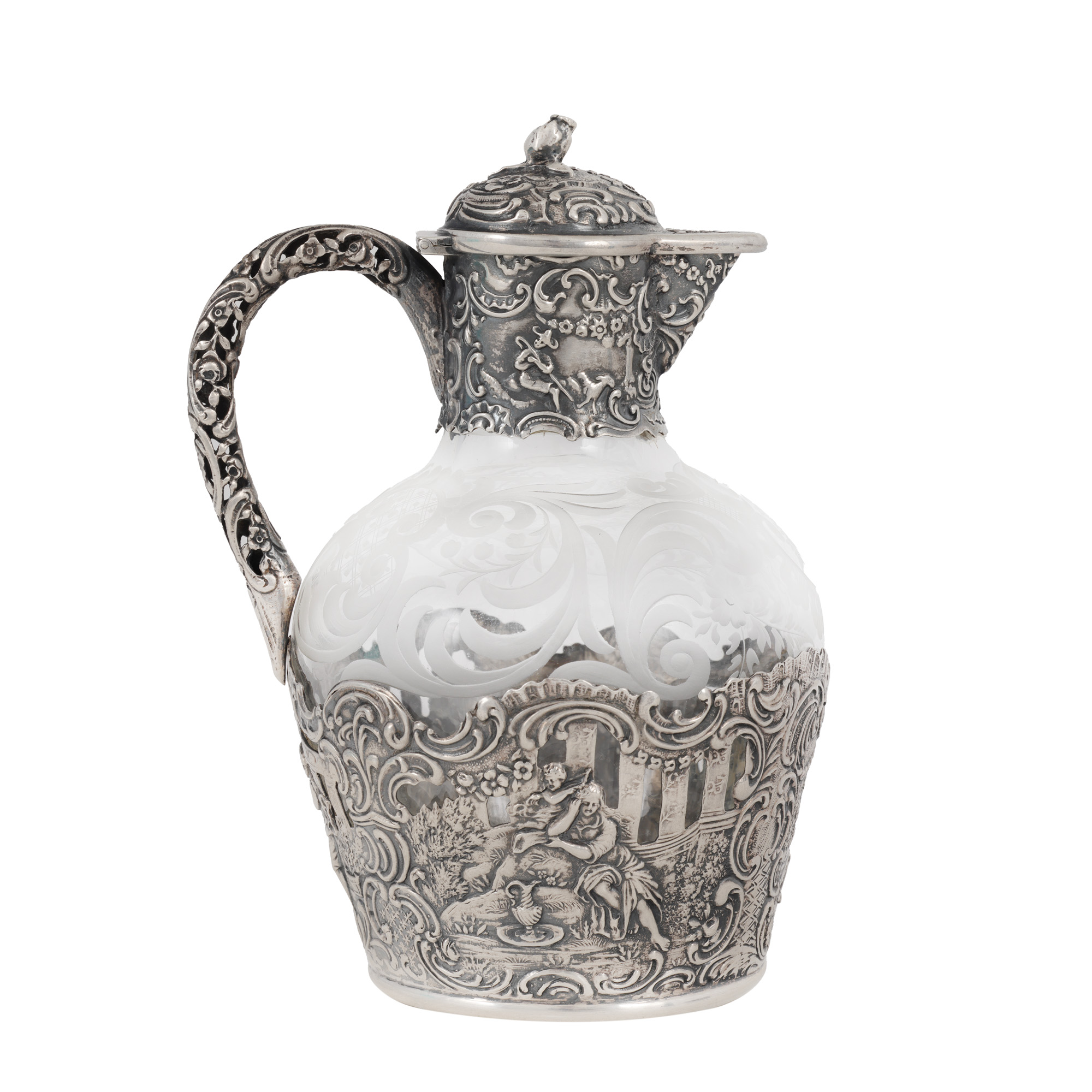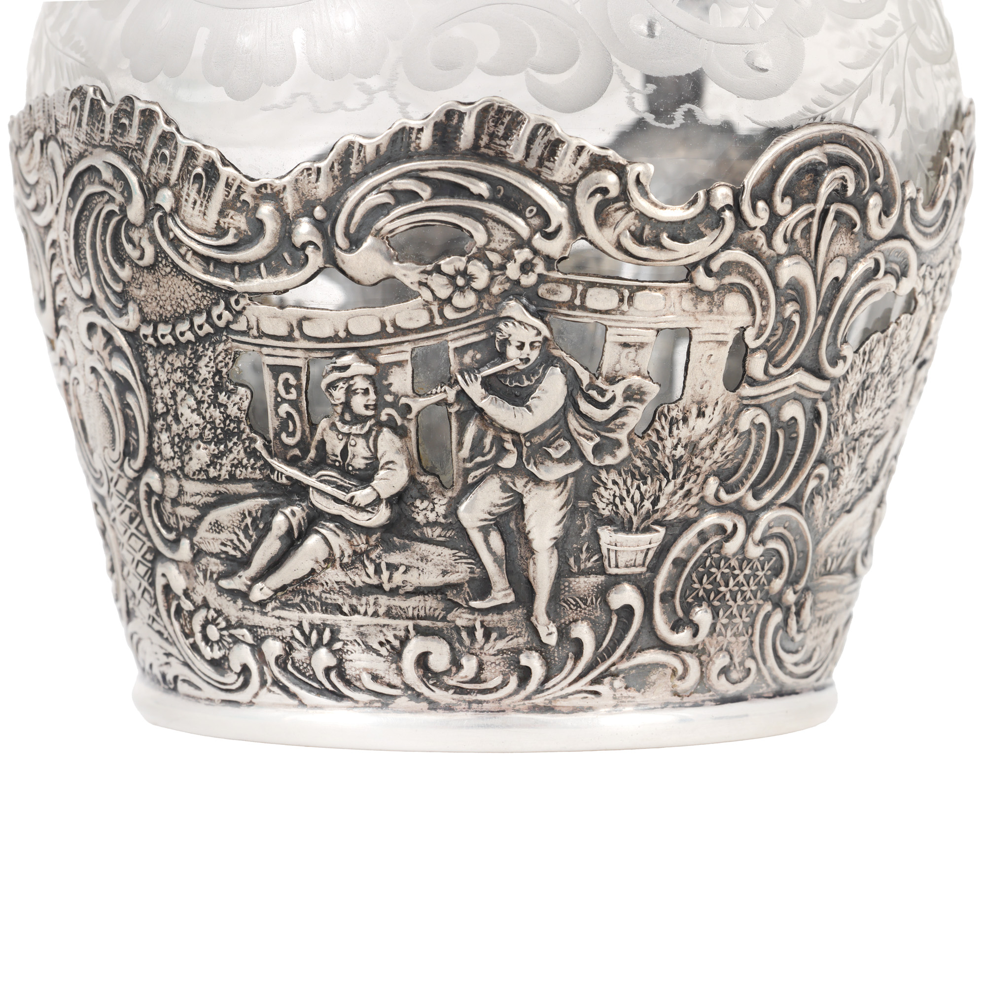 16. Cană din sticlă, cu montură din argint Hanau, începutul sec. XX