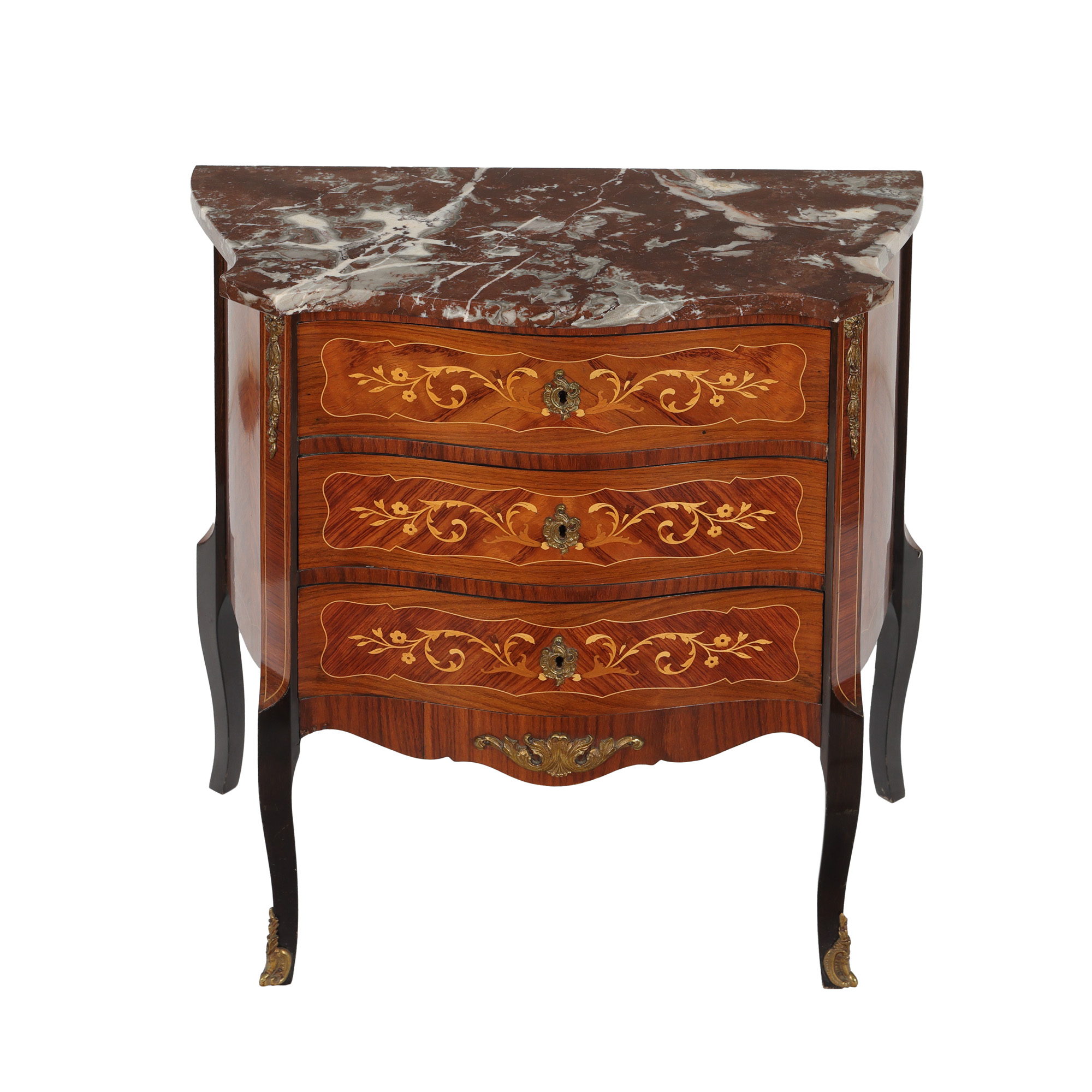 107. Comoda Louis XV, ornată cu intarsii și marmură de Siena, începutul sec. XX