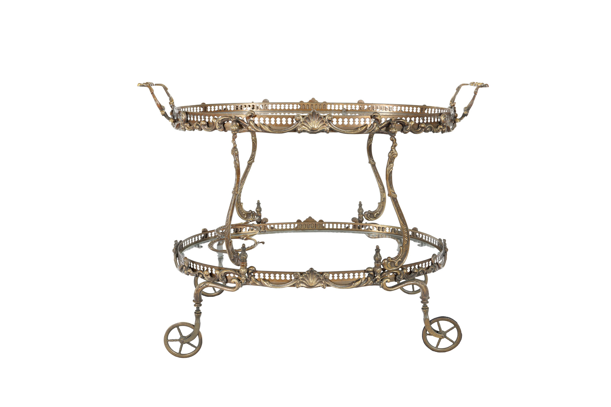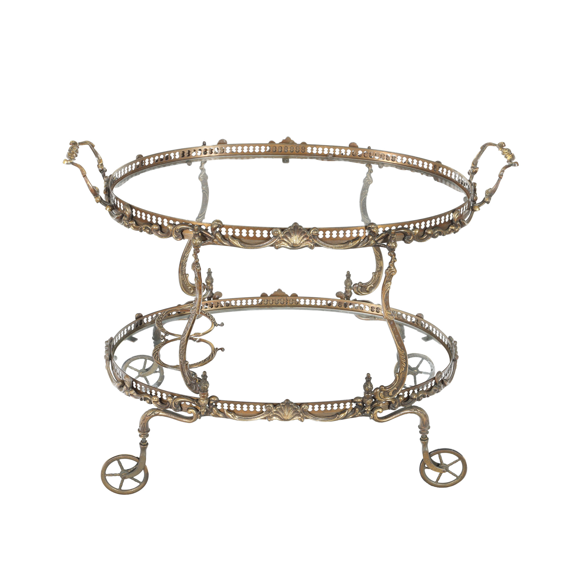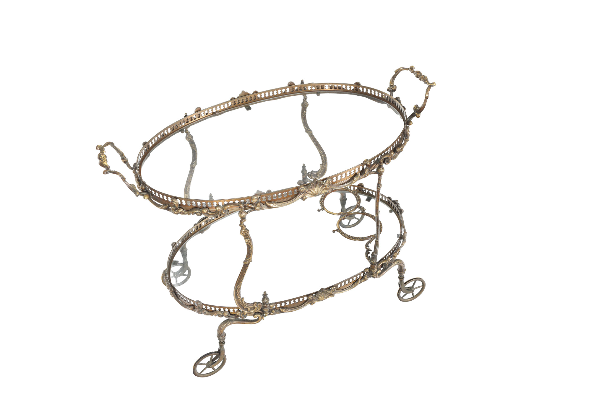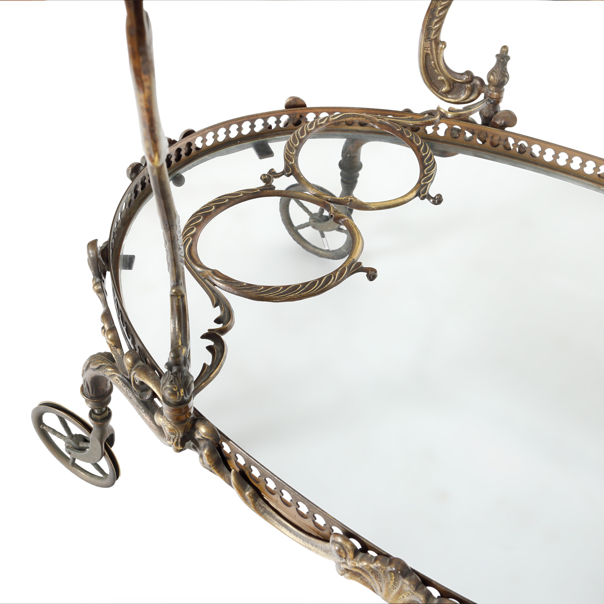 85. Gheridon mobil din alamă, decorat cu elemente Rocaille, cu lăcașuri pentru sticle, cca. 1920
