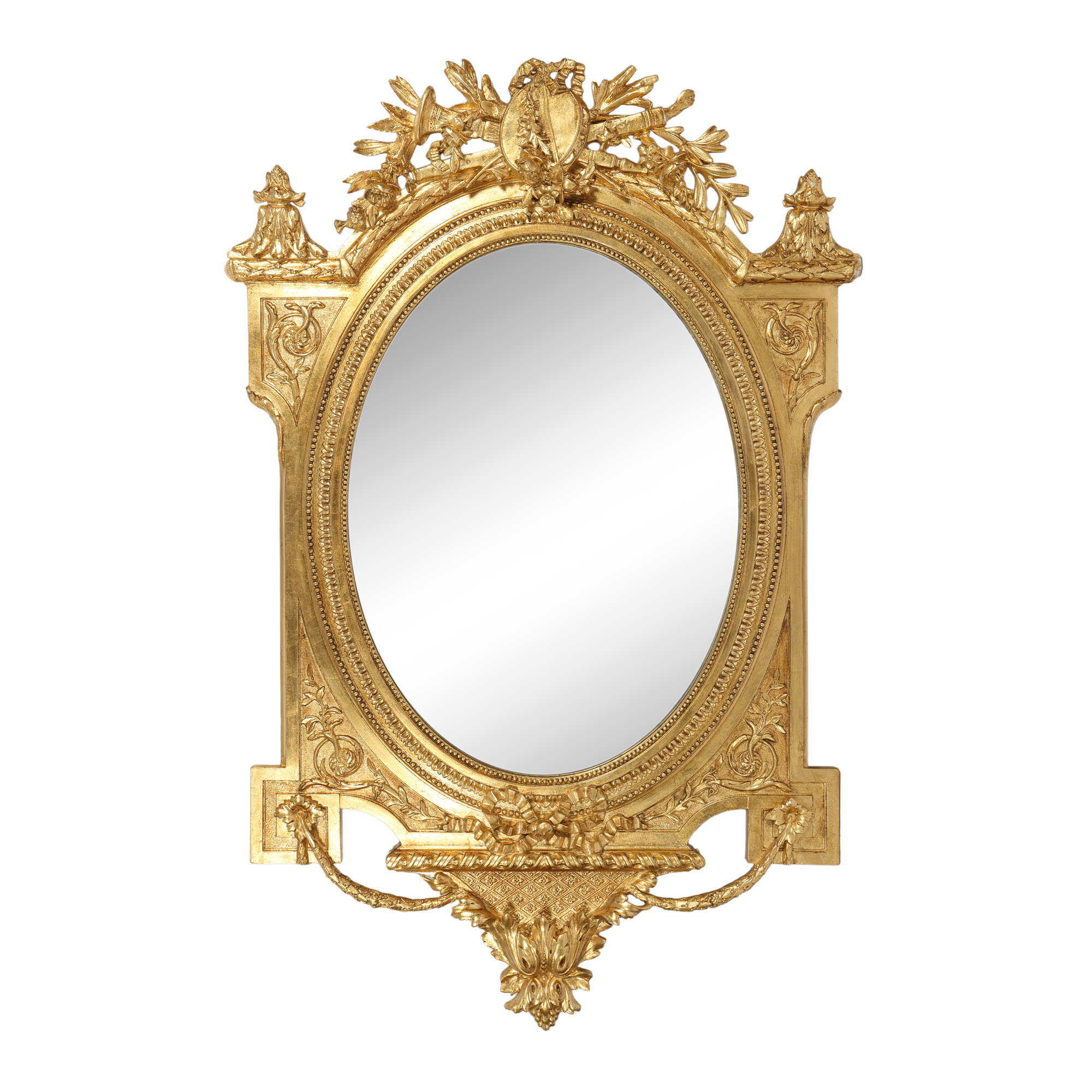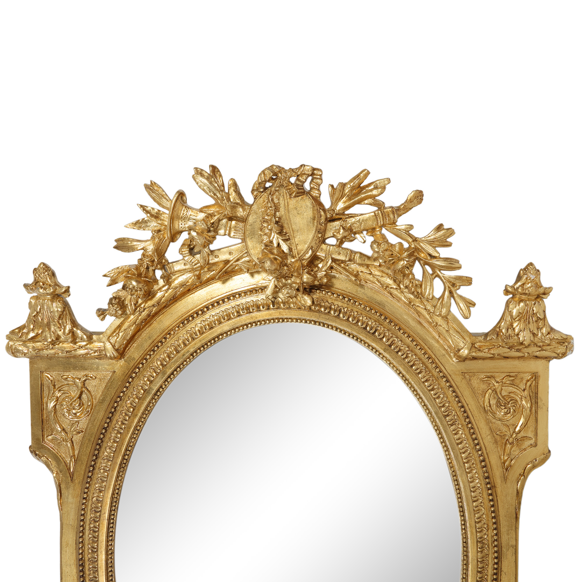 115. Oglindă în manieră Barocă, din lemn aurit, ornată cu atribute muzicale și de vânătoare, sfârșitul sec. XIX