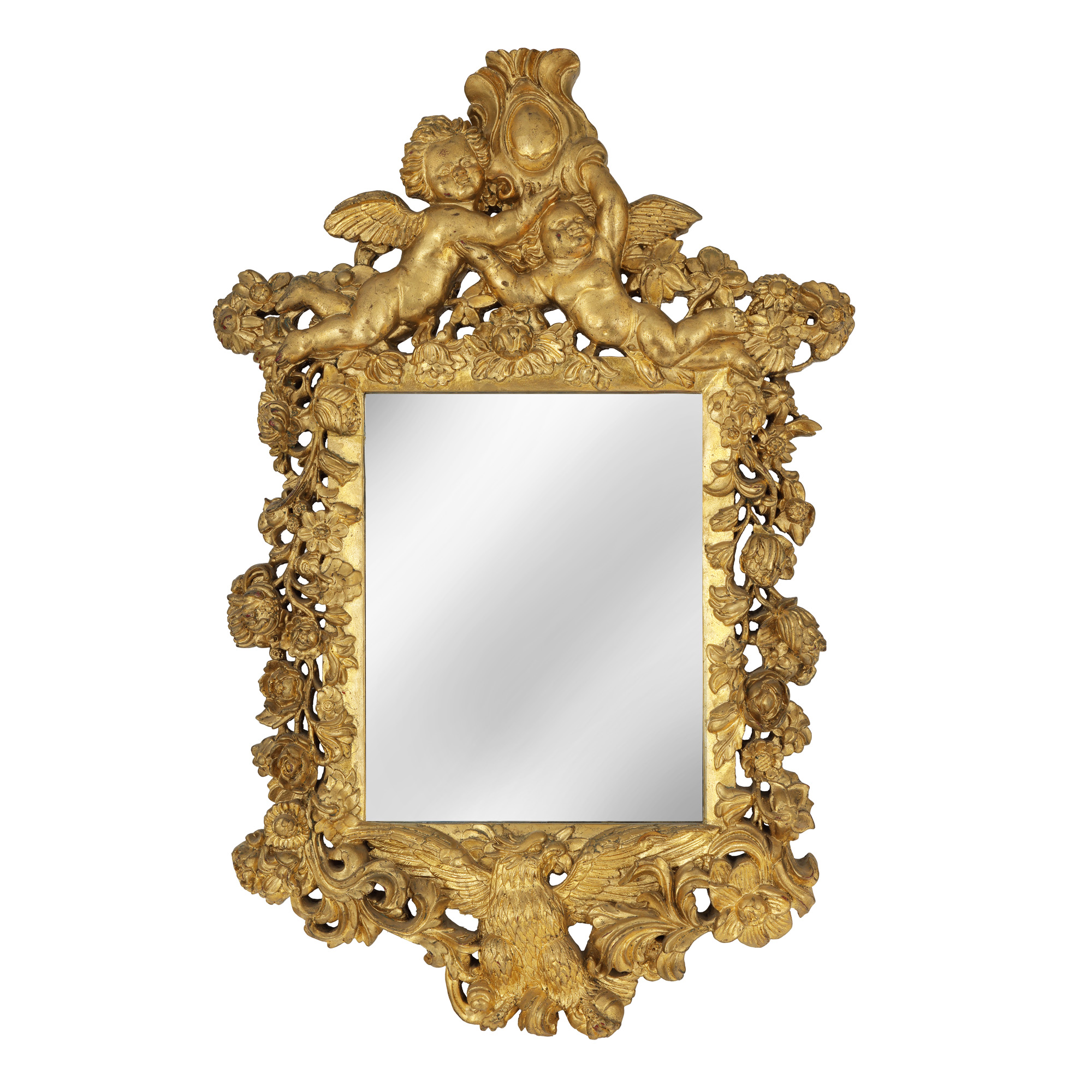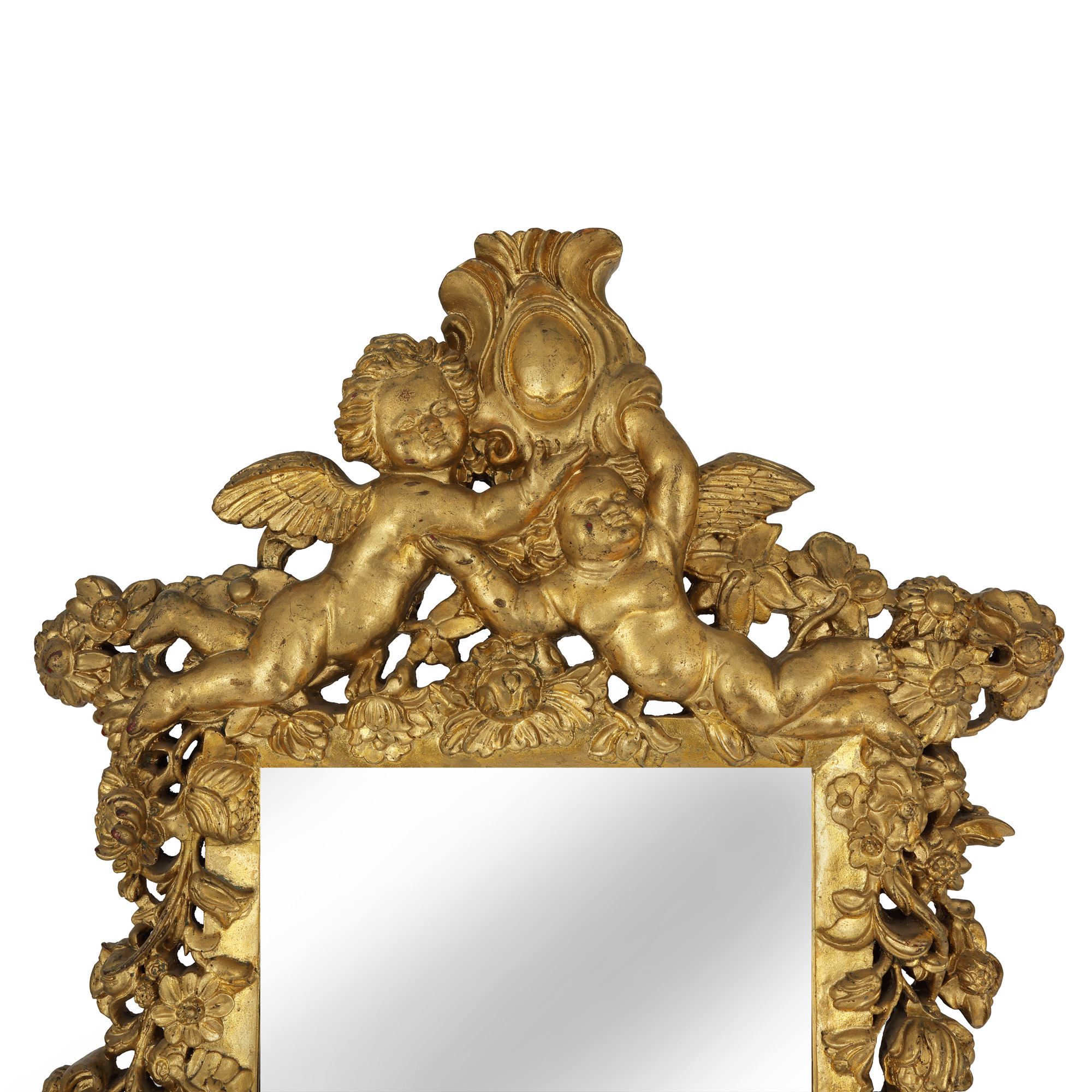 80. Oglindă în manieră Neo-Barocă, bogat decorată cu ghirlande de flori și putti