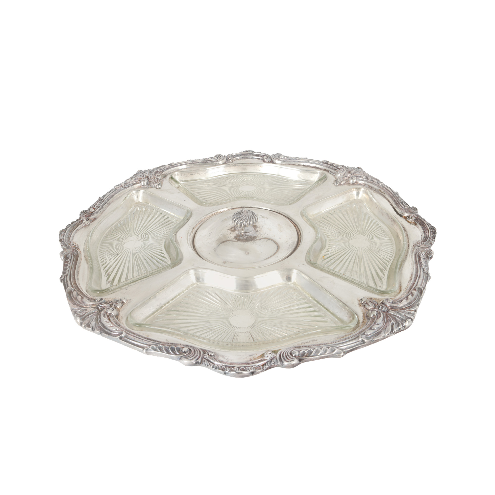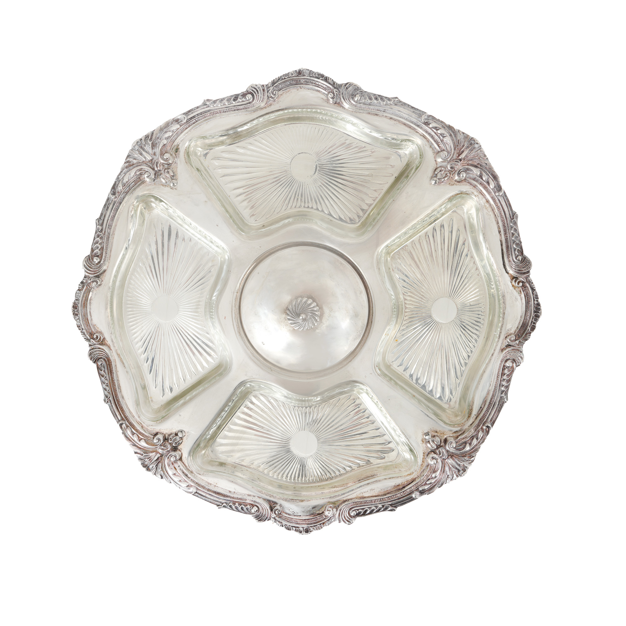 45. Platou rotativ pentru aperitive, ornat cu motive Rocaille, capac central și patru recipiente din cristal [cca. 1960]