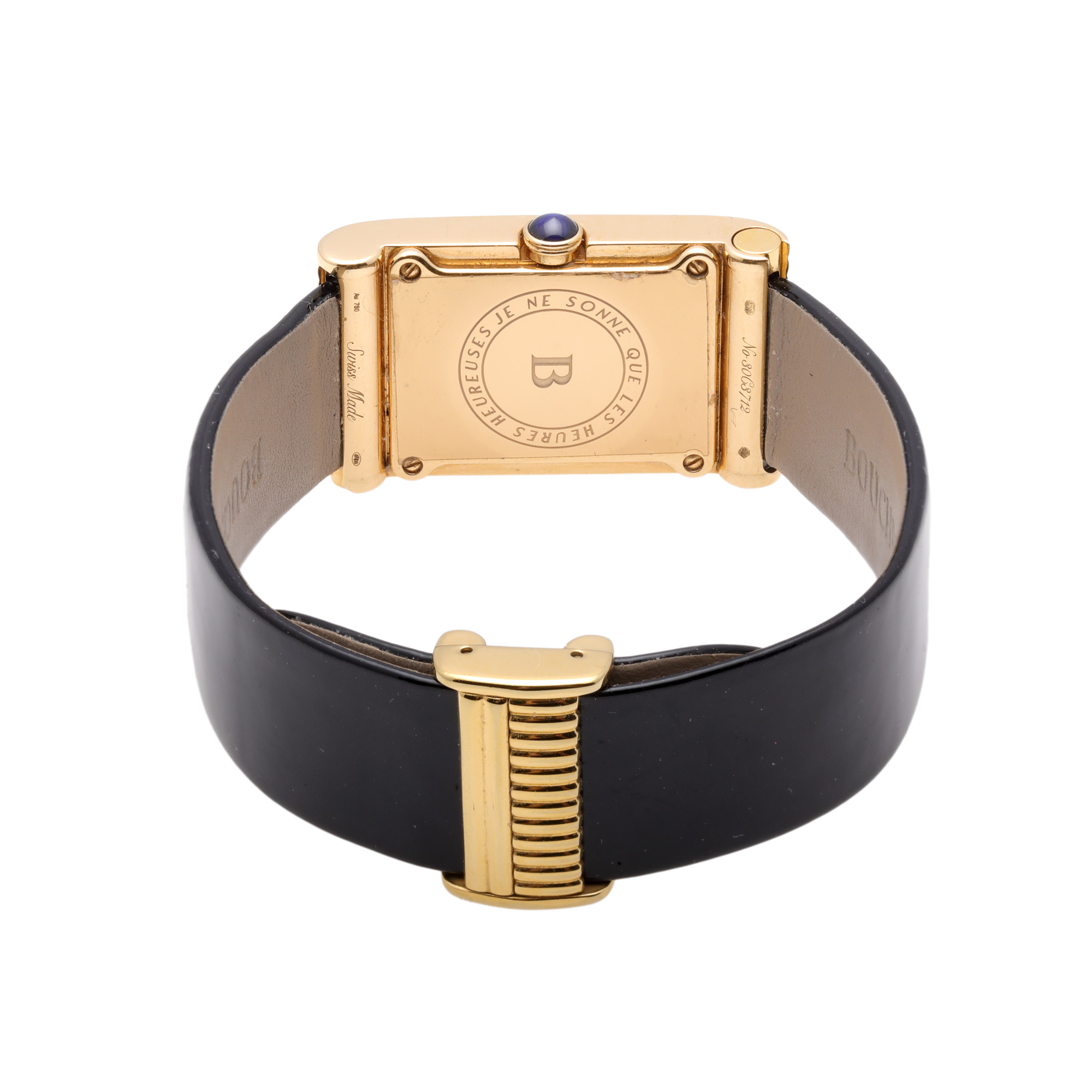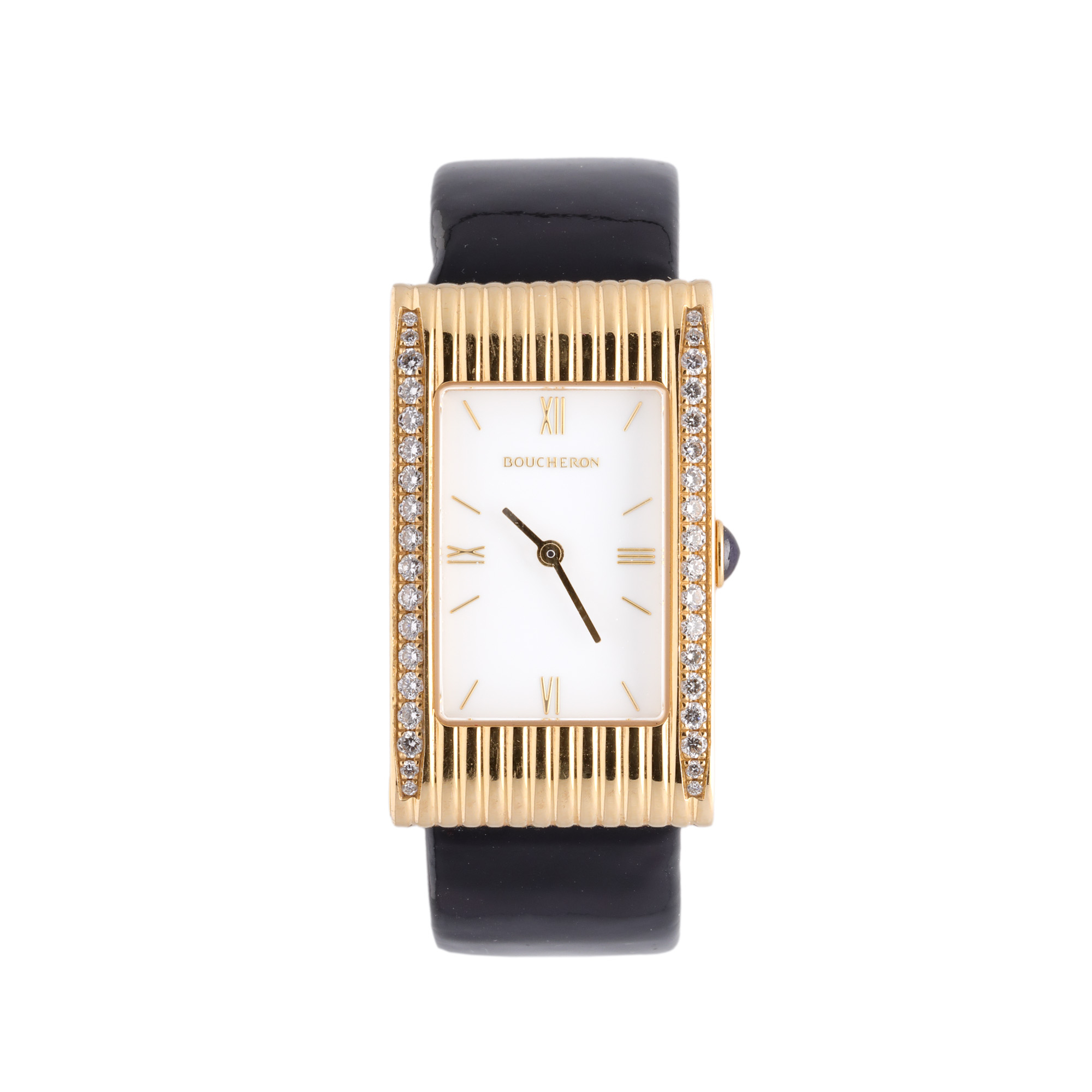 Ceas Boucheron Reflet Medium, din aur cu diamante, de mână, de damă, referință WA030407. Mecanism quartz, indici cu numerale romane pentru orele 12, 3, 6 și 9, indici liniari pentru restul orelor. Curea originală, din piele, de culoare neagră, lăcuită, cu sistem de închidere de tip deployant. Accesorii: certificat de autenticitate și broșură.