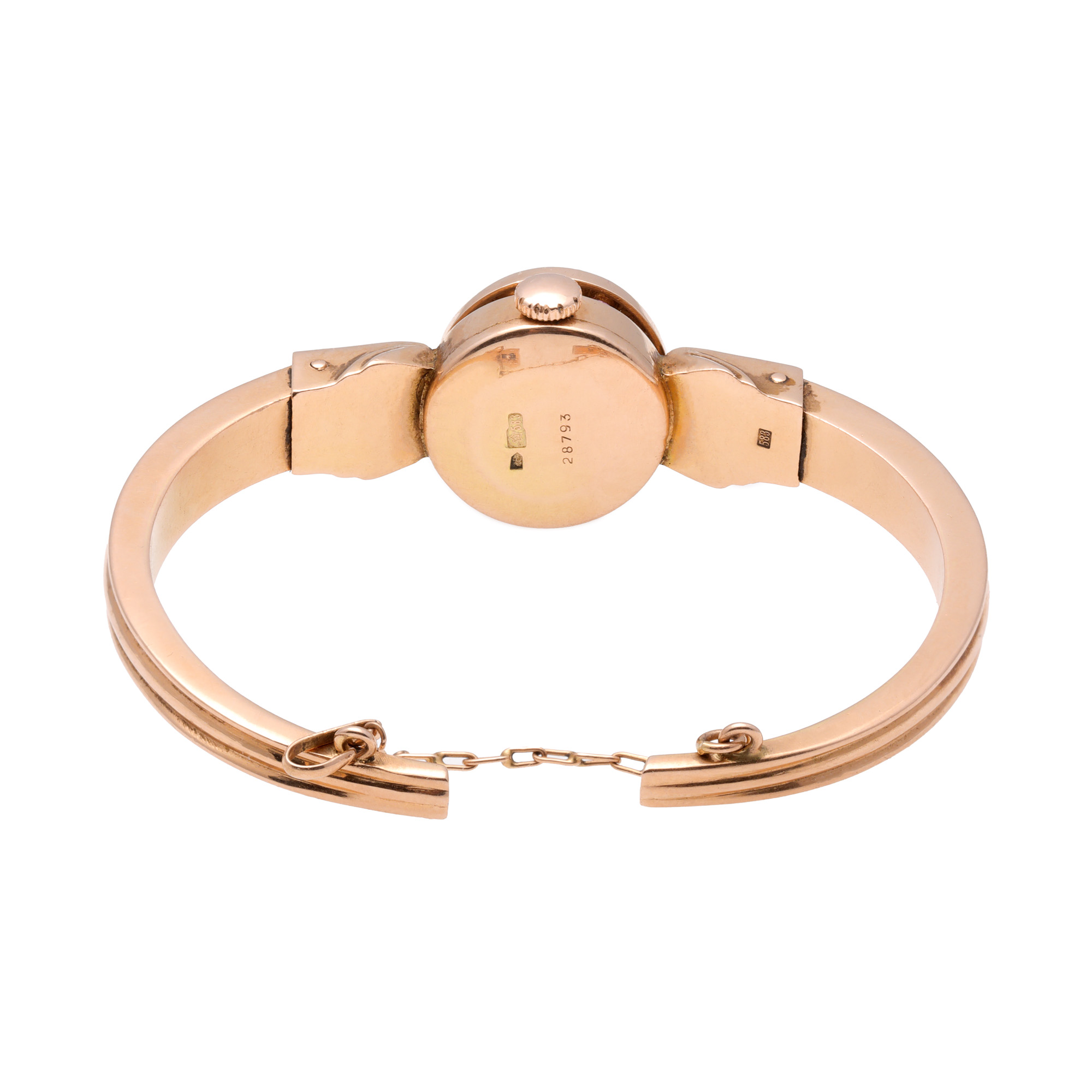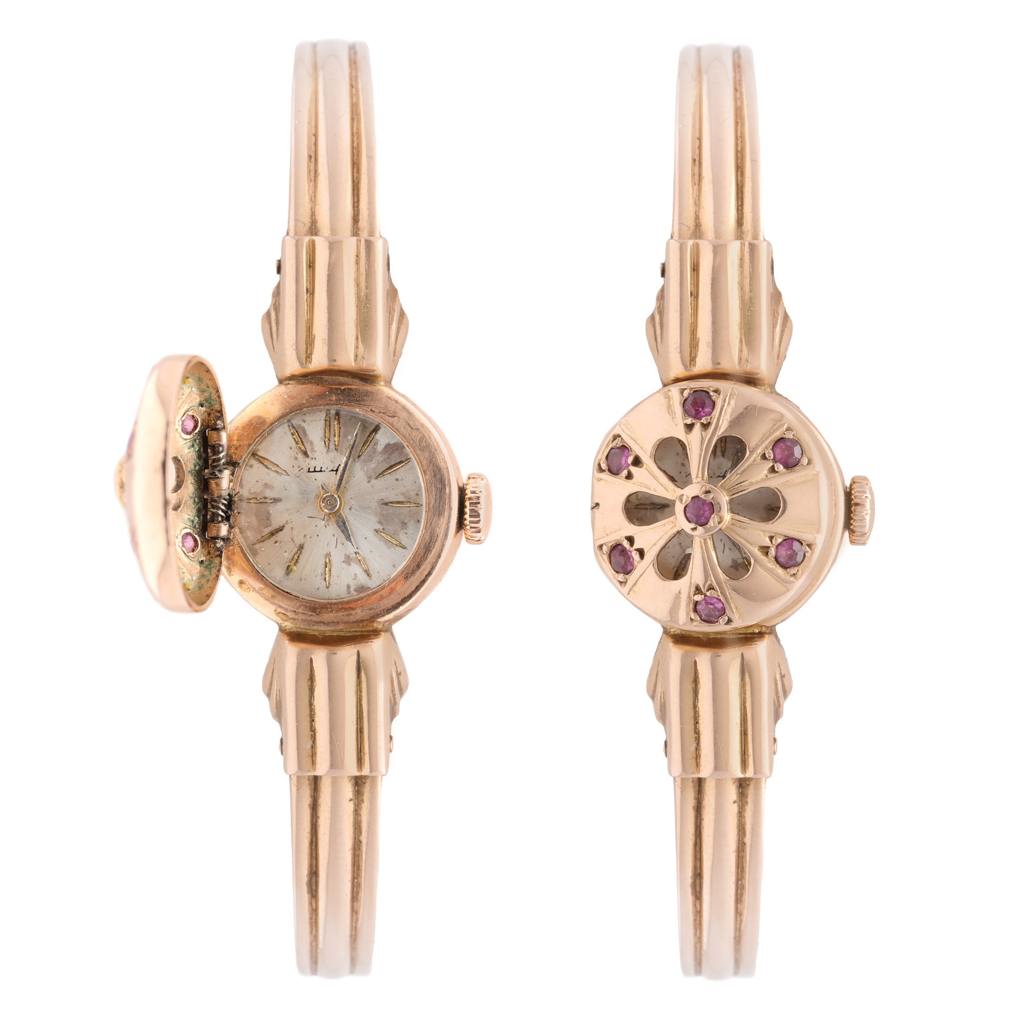 Ceas-brățară, din aur, decorat cu rubine, de mână, de damă. Mecanism cu armare manuală. cadran acoperit de un capac din aur. Brățară, originală, fixă, din aur.