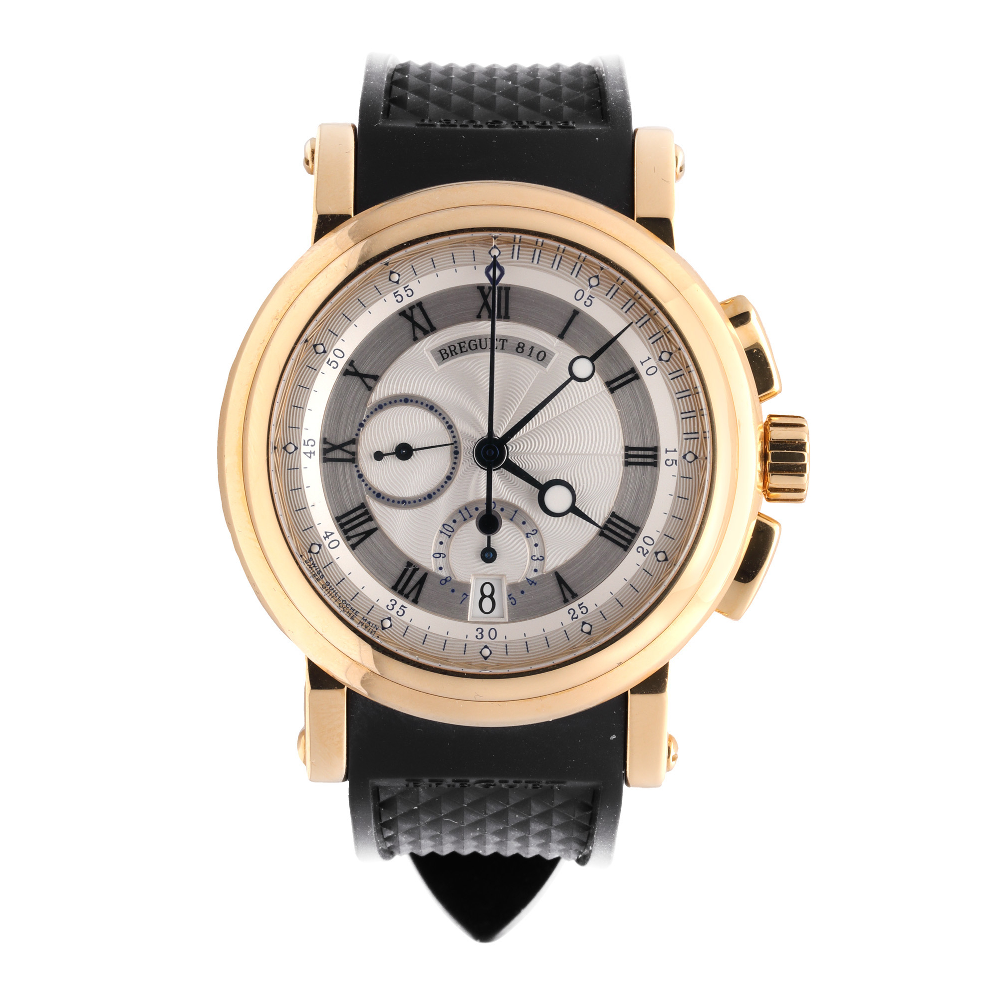 Ceas Breguet Marine Chronograph, din aur, de mână, bărbătesc, referință 5827. Mecanism automatic, cu funcție de chronograph, anterior vitrat. Cadran de culoare gri, executat în tehnică guilloche, indici numerale romane pentru ore și numerale arabe pentru minute, registru dublu pentru dată și funcția de chronograph în dreptul orei 6, registru pentru secundar în dreptul orei 9. Curea originală, din cauciuc, de culoare neagră, cu sistem de închidere de tip deployant, original din aur.