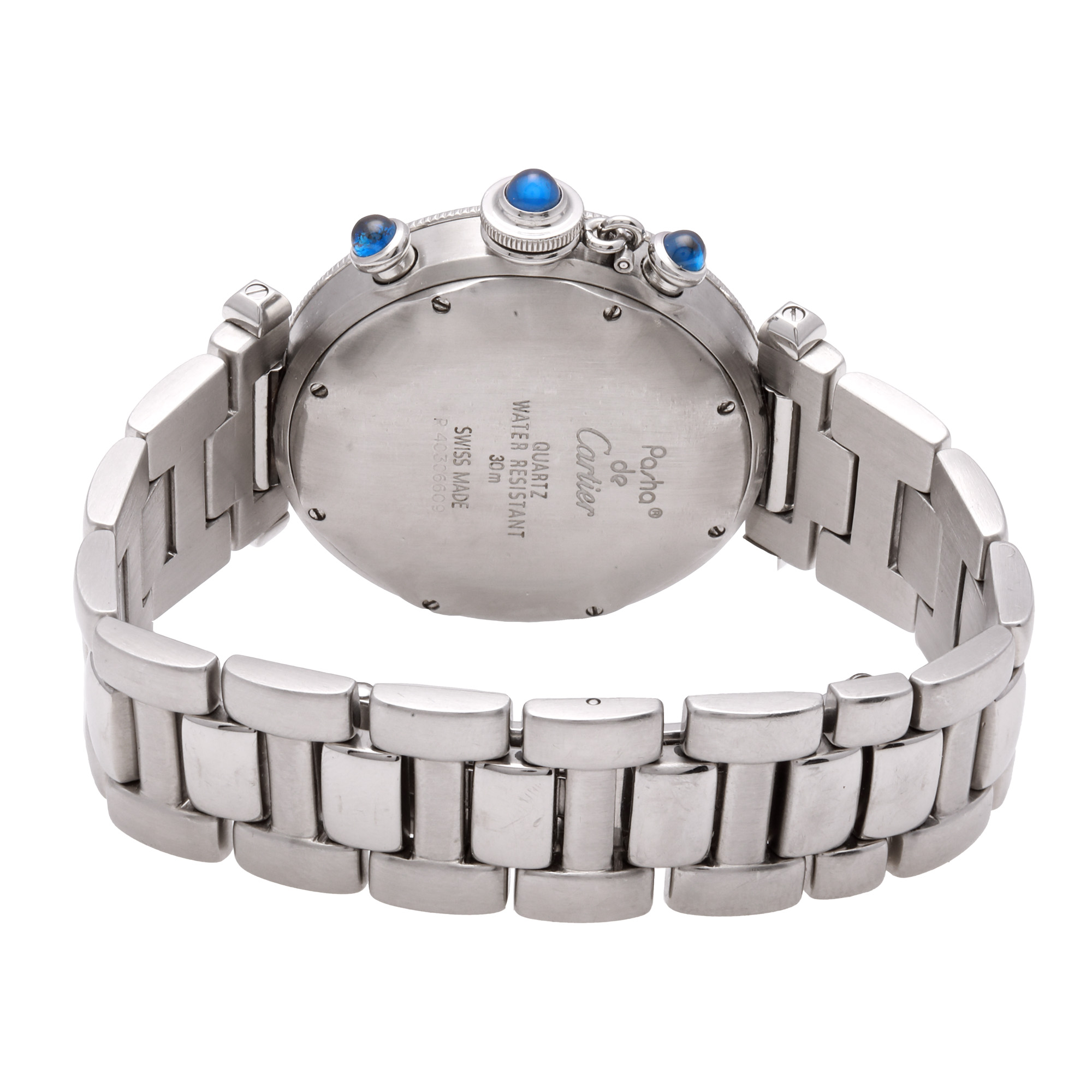 Ceas Cartier Pasha Chronograph, de mână, unisex, referință 1050. Mecanism quartz, cu funcție de chronograph. Cadran de culoare bej, indici puncte, cu un registru pentru secundar în dreptul orei 6 și două registre pentru funcția de chronograph în dreptul orelor 3 și 9. Brățară originală, din oțel inoxidabil, cu sistem de închidere de tip deployant.