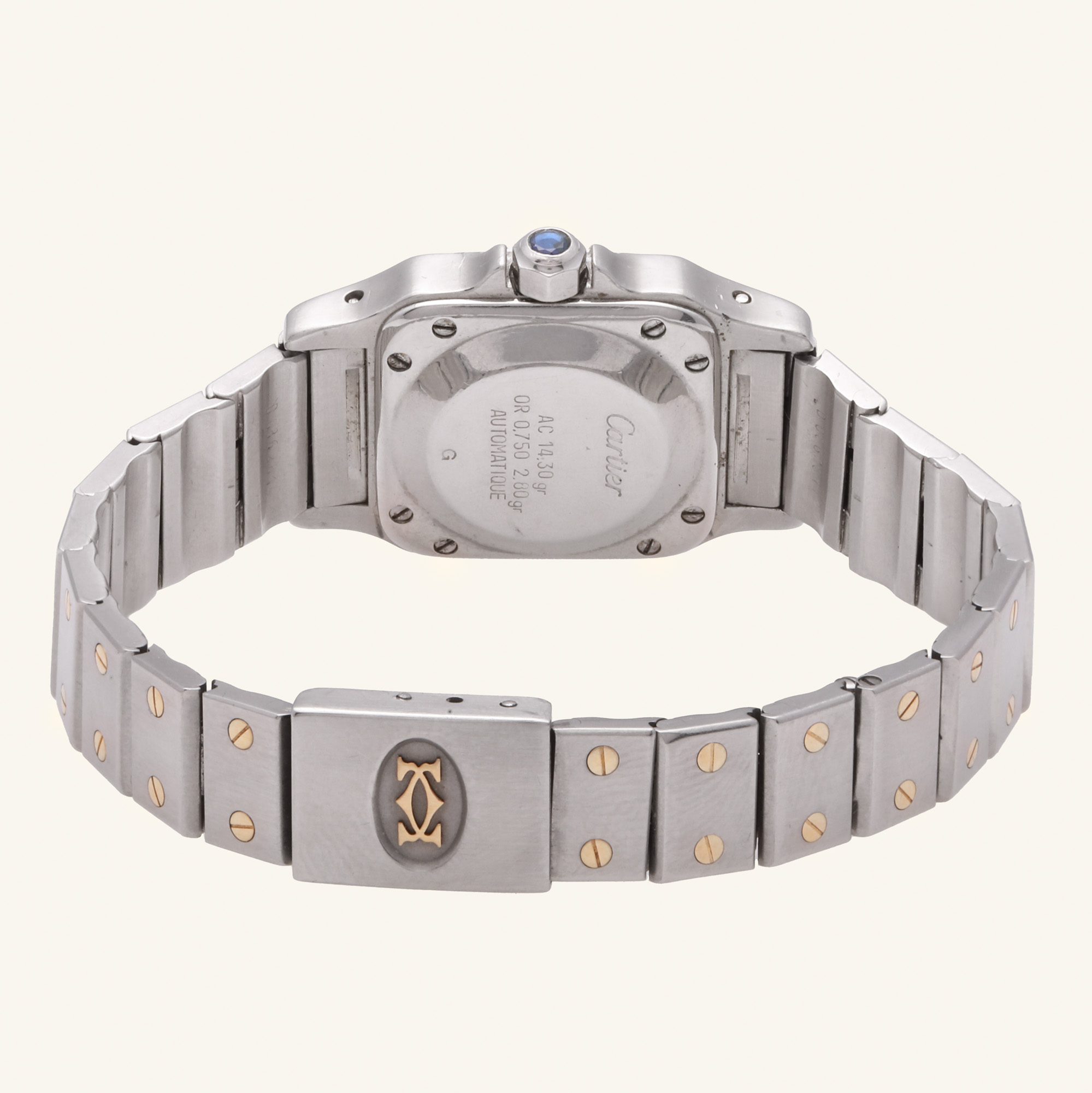 Ceas Cartier Santos Galbee, din aur și oțel, de mână, de damă, referință 187901. Mecanism automatic, calibrul CARTIER 76. Cadran de culoare alb, indici cu numerale romane. Brățară originală, din oțel inoxidabil, cu un sistem de închidere de tip deployant.