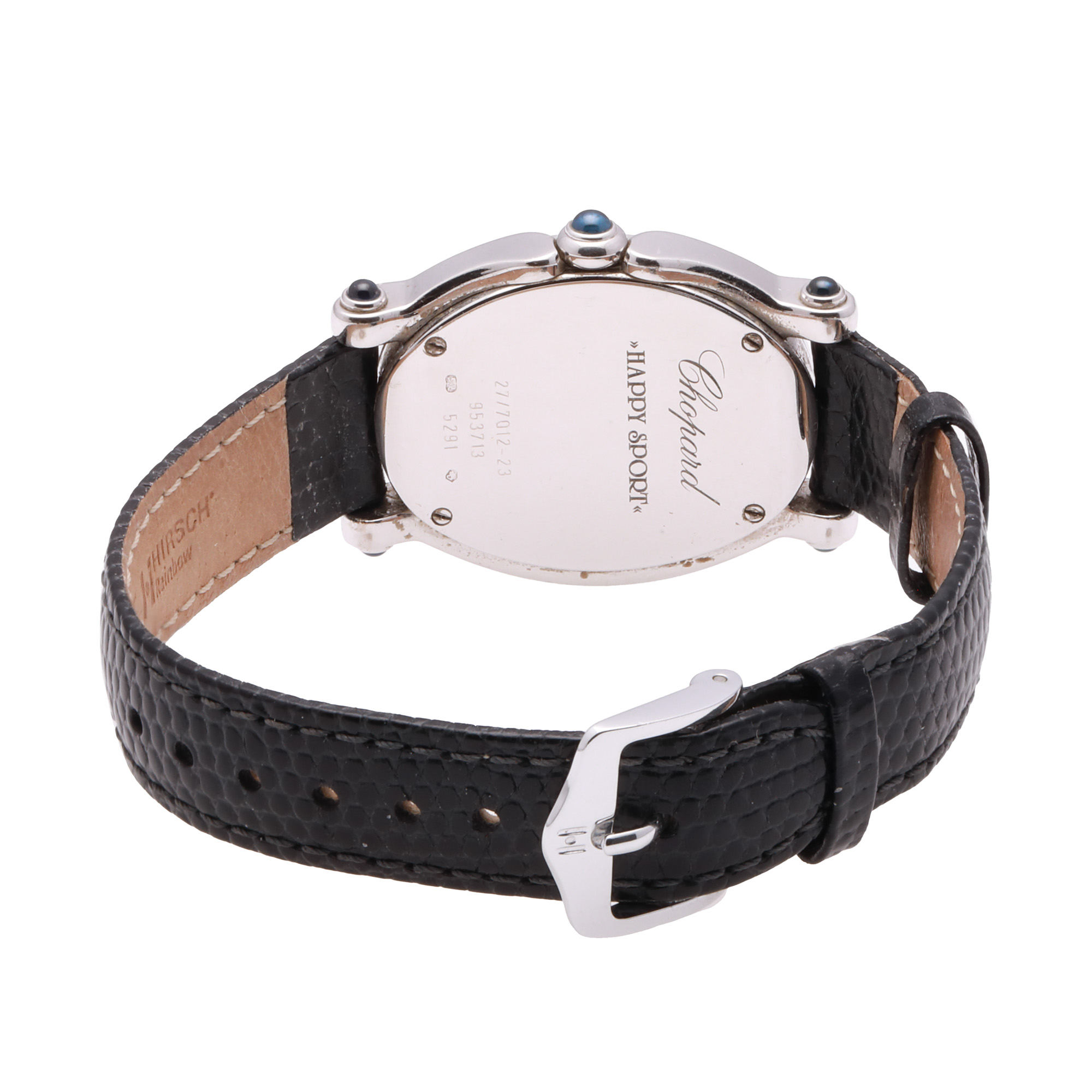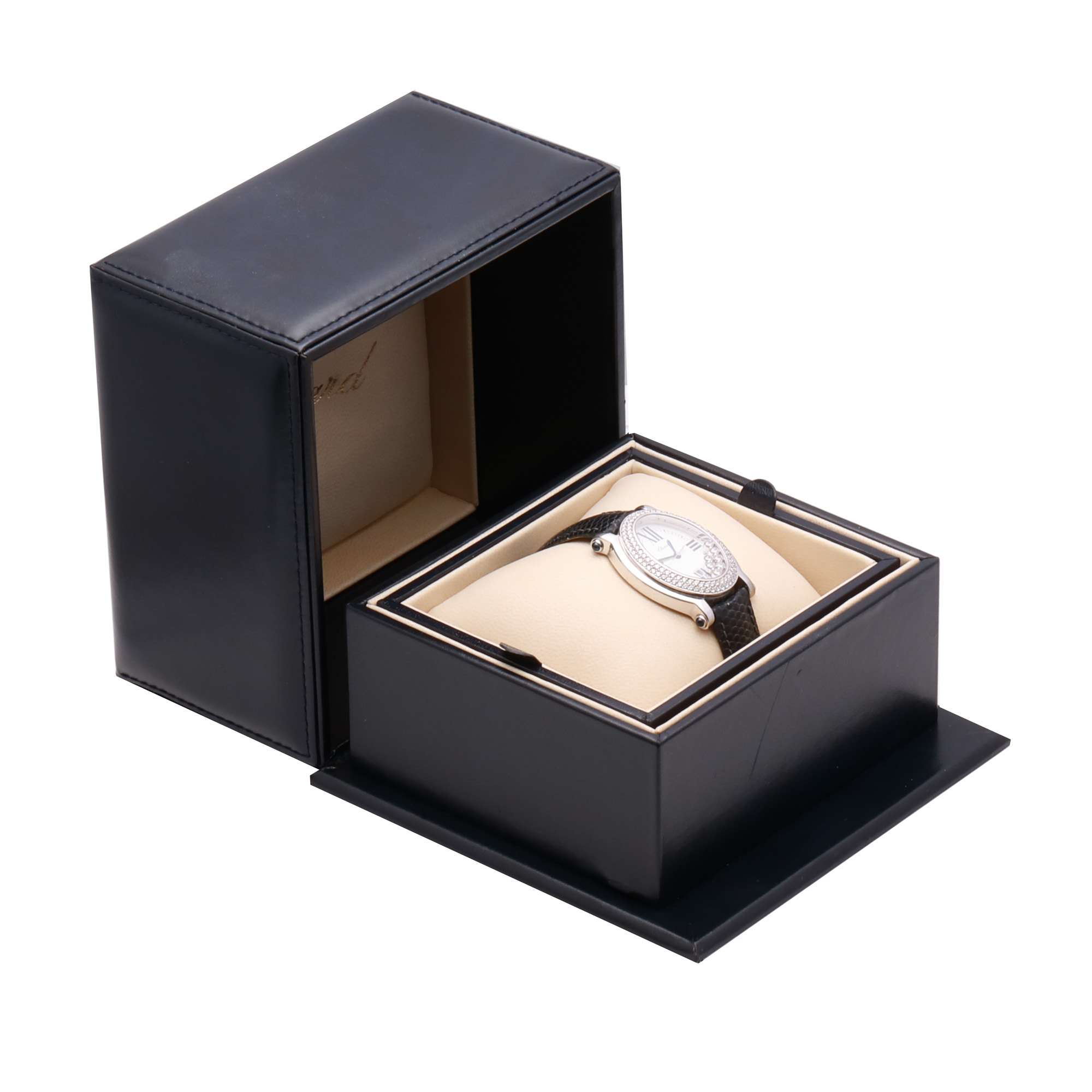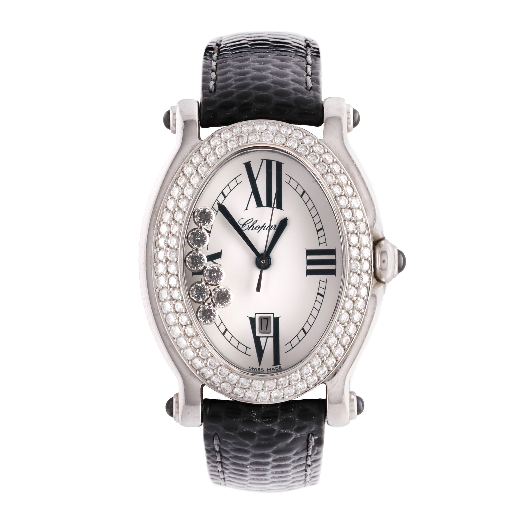 Ceas Chopard Happy Sport, cu diamante, de mână de damă, referință 27/7012-23. Mecanism quartz, bezel decorat integral cu diamante. Cadran de culoare crem, decorat cu diamante mobile, indici numerale romane pentru orele cardinale, registru pentru dată în dreptul orei 6. Curea adăugată aftermarket, din piele, de culoare neagră, cu sistem de închidere clasic cu cataramă. Accesorii: cutia originală.