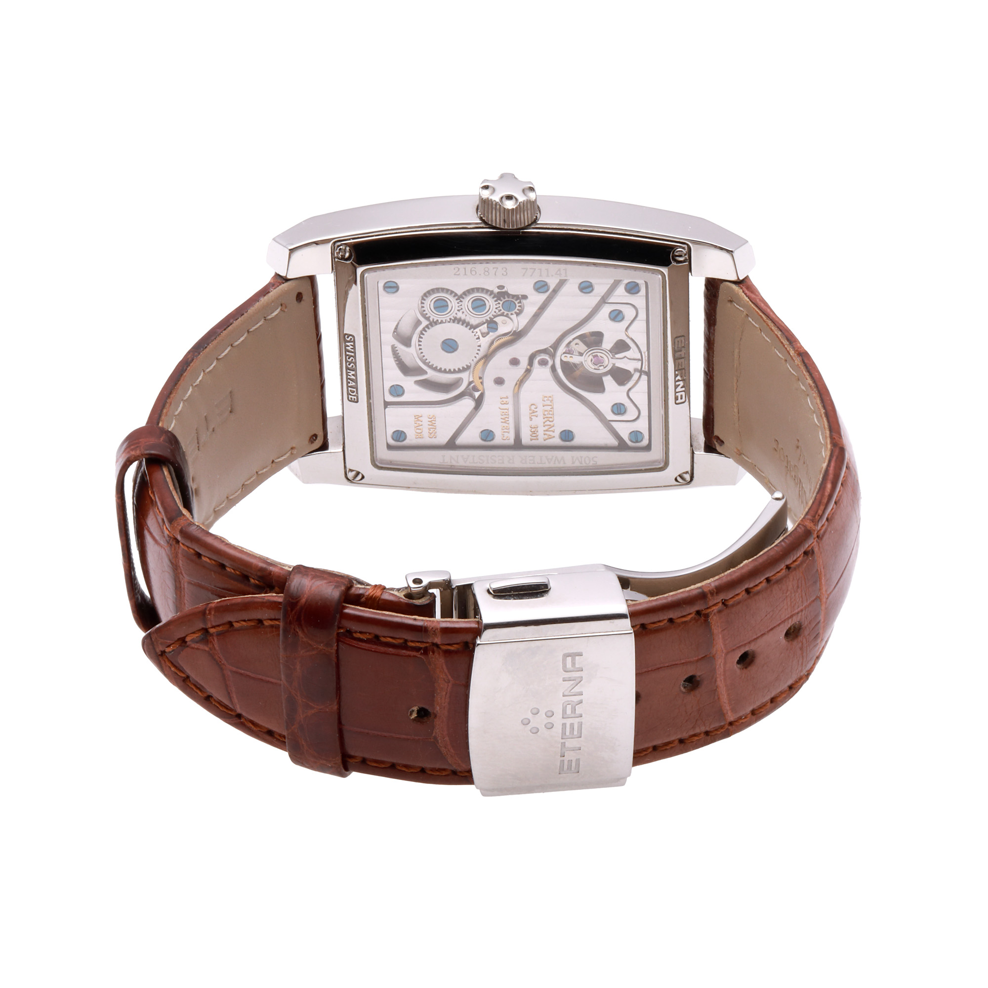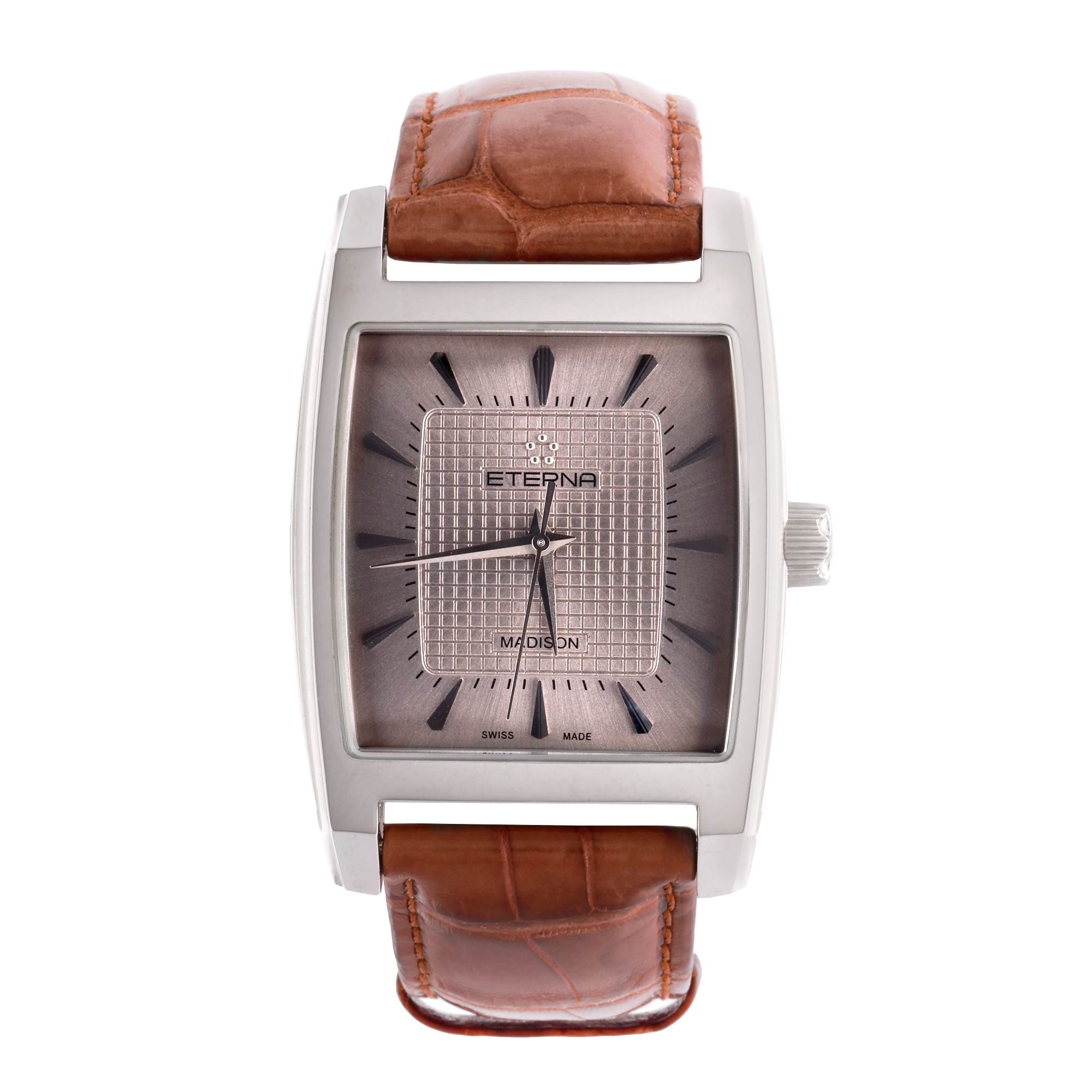 Ceas Eterna Maddison, de mână, bărbătesc, referință 7711.41.31.1178. Mecanism cu armare manuală, calibrul 3505. Cadran de culoare argintiu, indici baghetă. Curea din piele, de culoare maro, cu sistem de închidere de tip deployant. Accesorii: cutia originală.