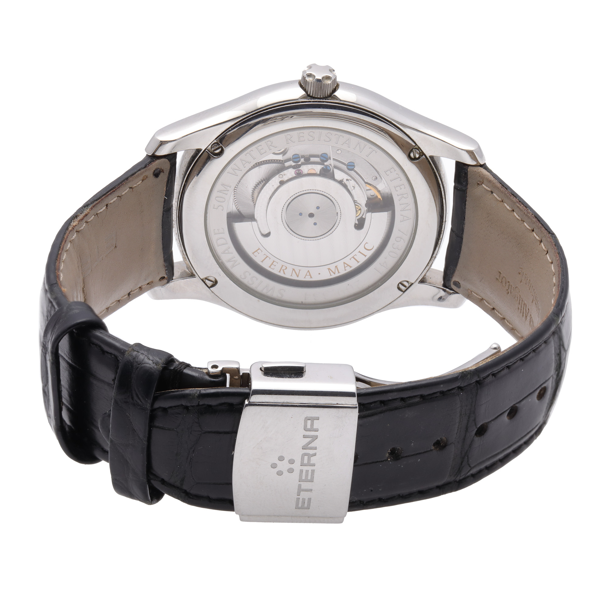 Ceas Eterna Vaughan Big Date, de mână, bărbătesc, referință 7630.41. Mecanism automatic, calibrul Eterna 3030, anterior vitrat. Cadran de culoare argintiu, indici baghetă, registru pentru dată în dreptul orei 3. Curea originală, din piele, de culoare neagră, cu sistem de închidere de tip deployant. Accesorii: cutia originală.
