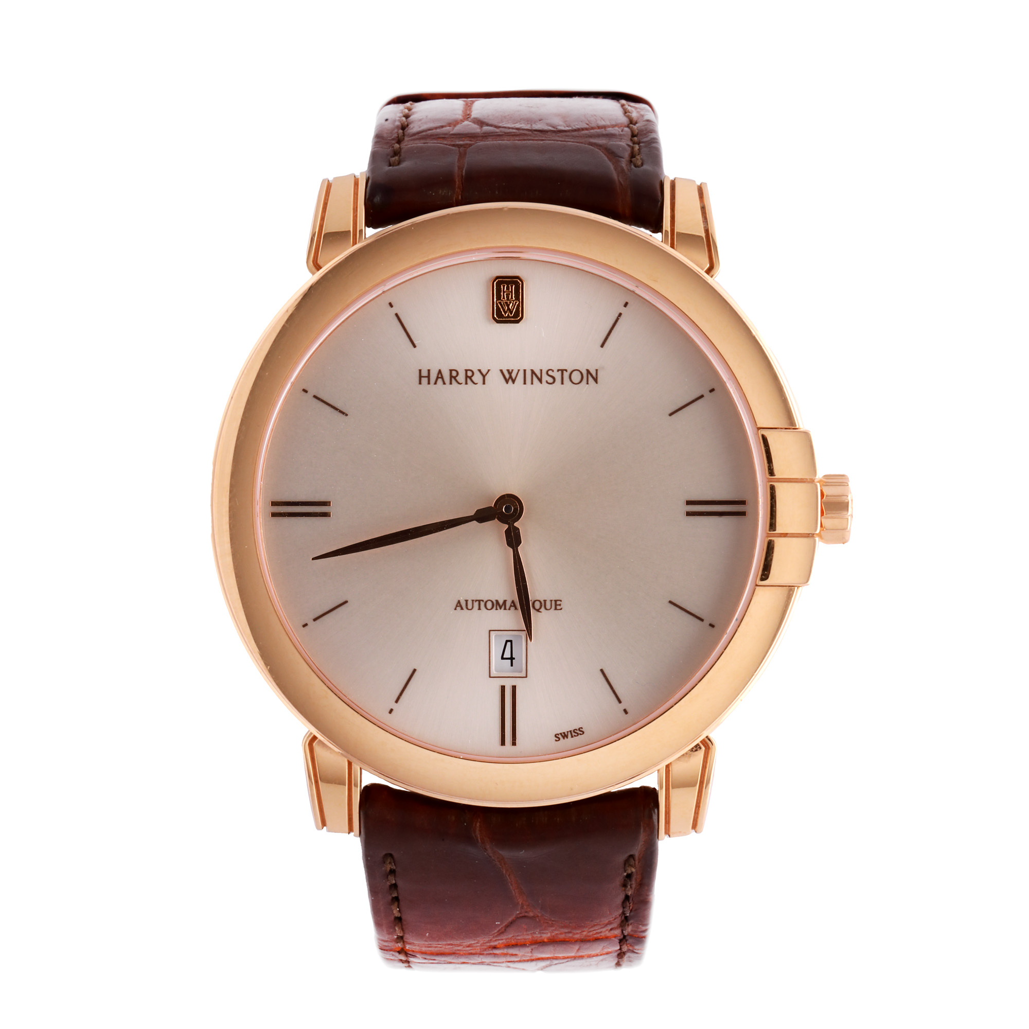 Ceas Harry Winston Midnight, din aur, de mână, bărbătesc, referință 450/MA42RL.W1. Mecanism automatic, calibrul HW3306. Cadran de culoare champagne, indici baghetă aplicați, cu un registru pentru dată în dreptul orei 6. Curea originală, din piele, de culoare maro, cu sistem de închidere de tip clasic. Accesorii: cutia originală și broșură de garanție