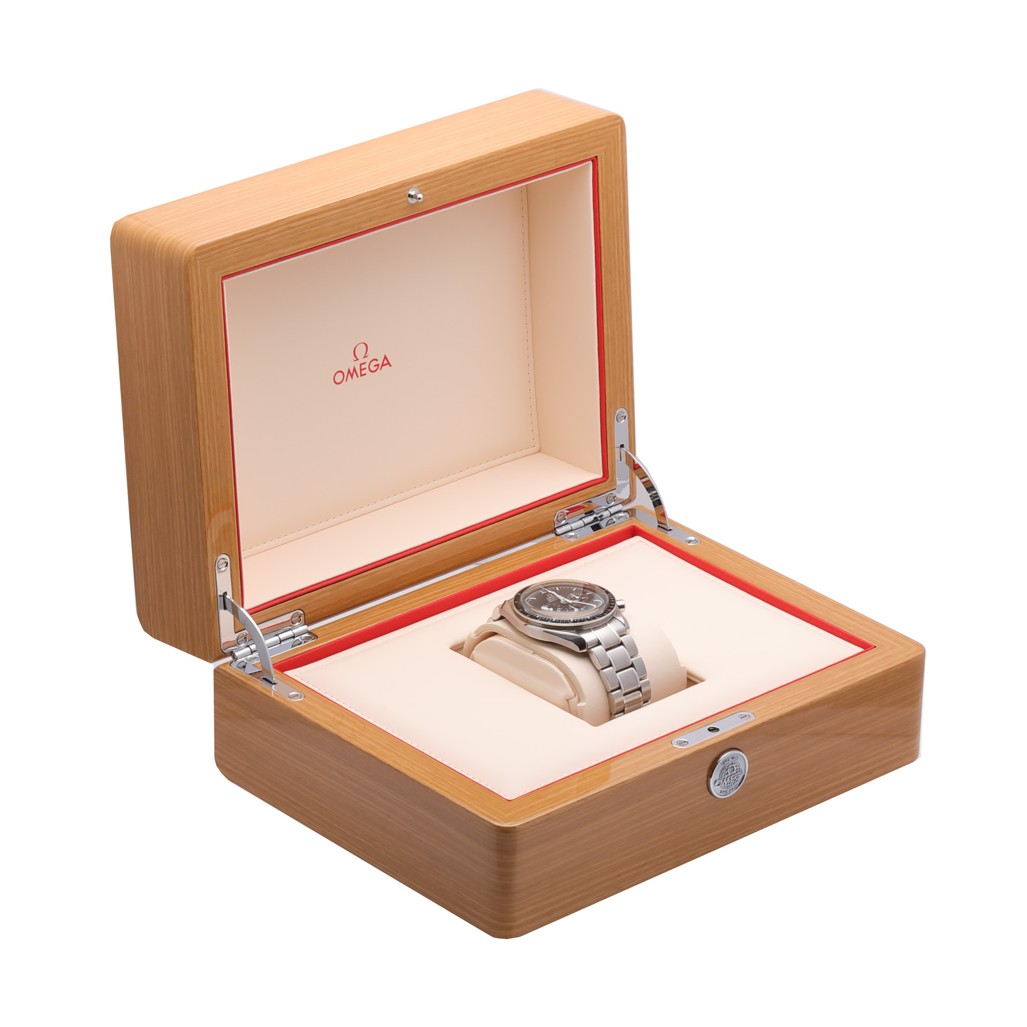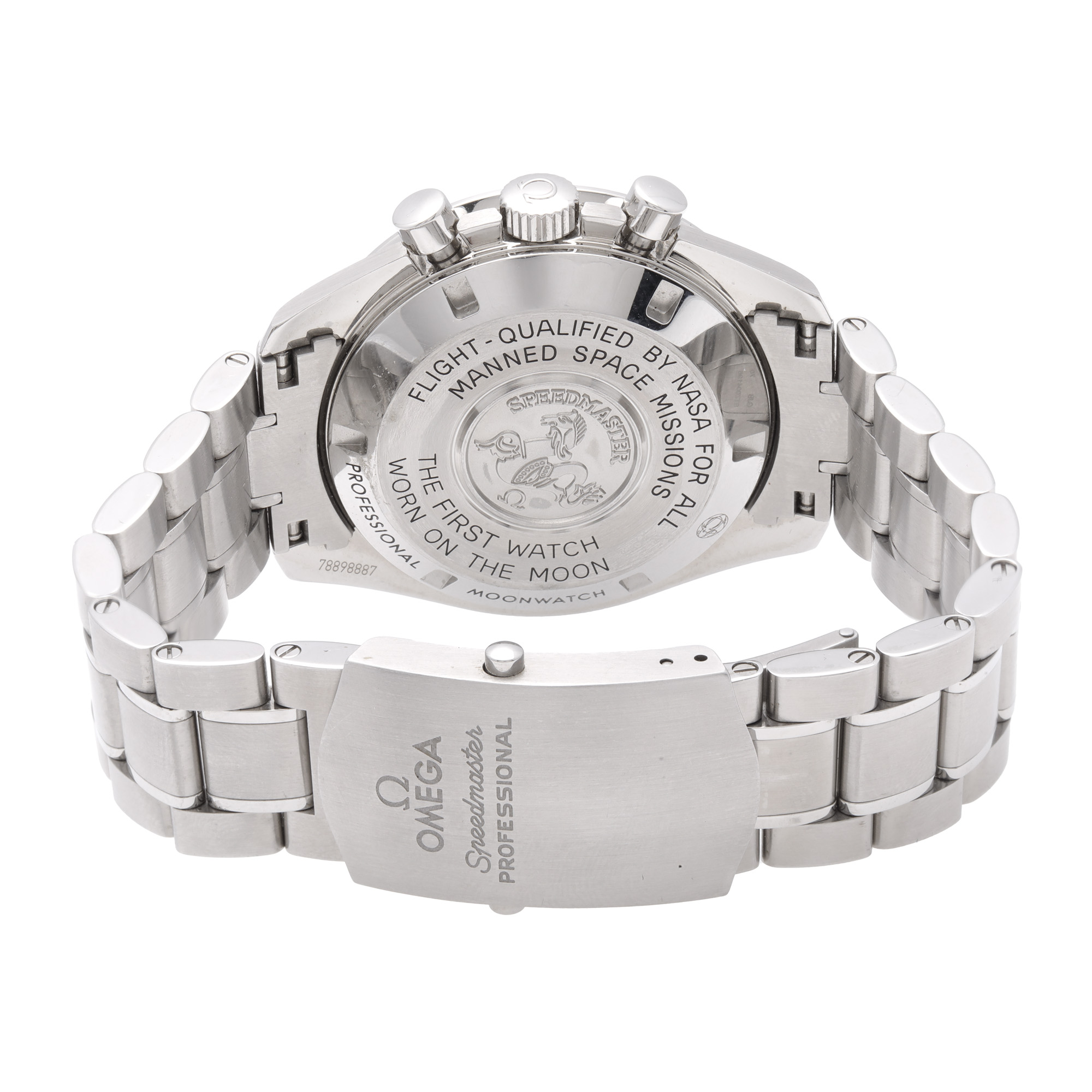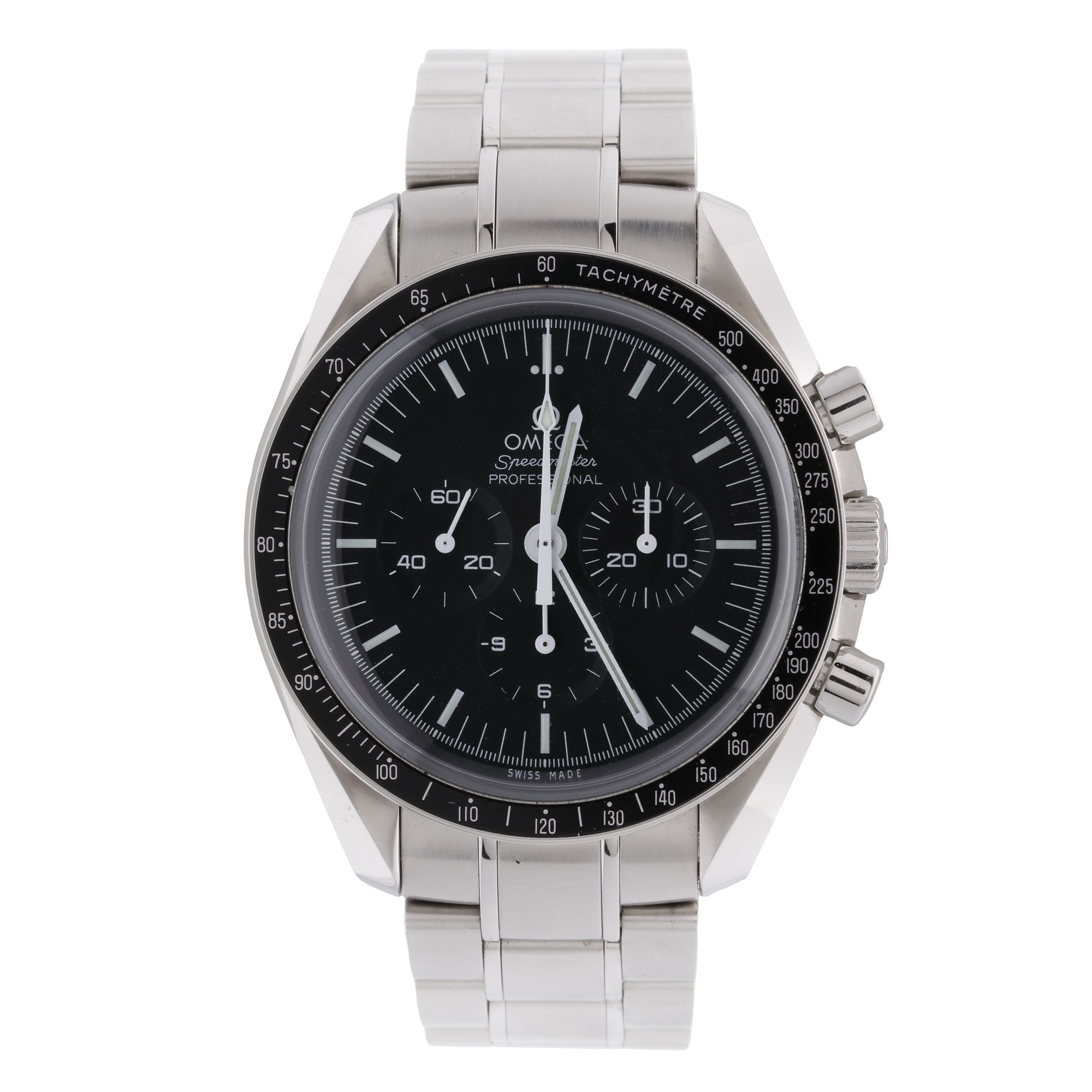 Ceas Omega Speedmaster Professional Moonwatch, de mână, bărbătesc, referință 31130423001005. Mecanism cu armare manuală, calibrul 1861, calibrul de bază Lemania 1873 cu funcție de chronograph. Cadran de culoare negru, indici baghete, registru pentru secundar în dreptul orei 9, două registre pentru funcția de chronograph în dreptul orelor 3 și 6. Brățară originală, din oțel, cu sistem de închidere de tip deployant. Accesorii: cutia originală, card de garanție, manual de instrucțiuni.