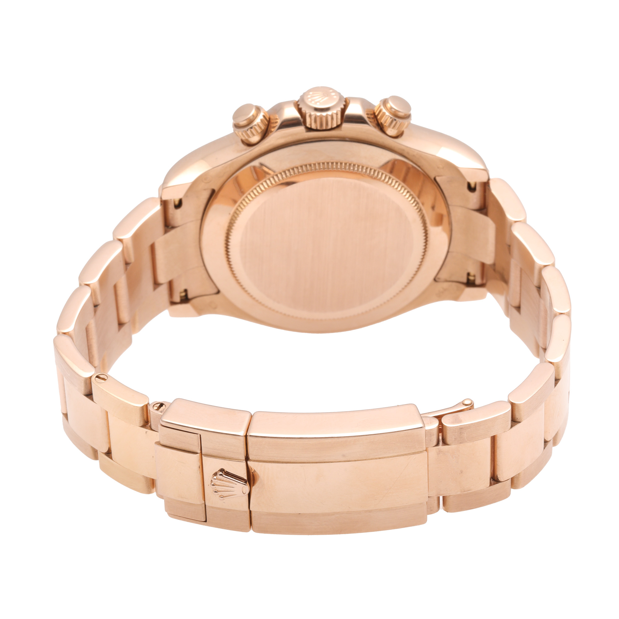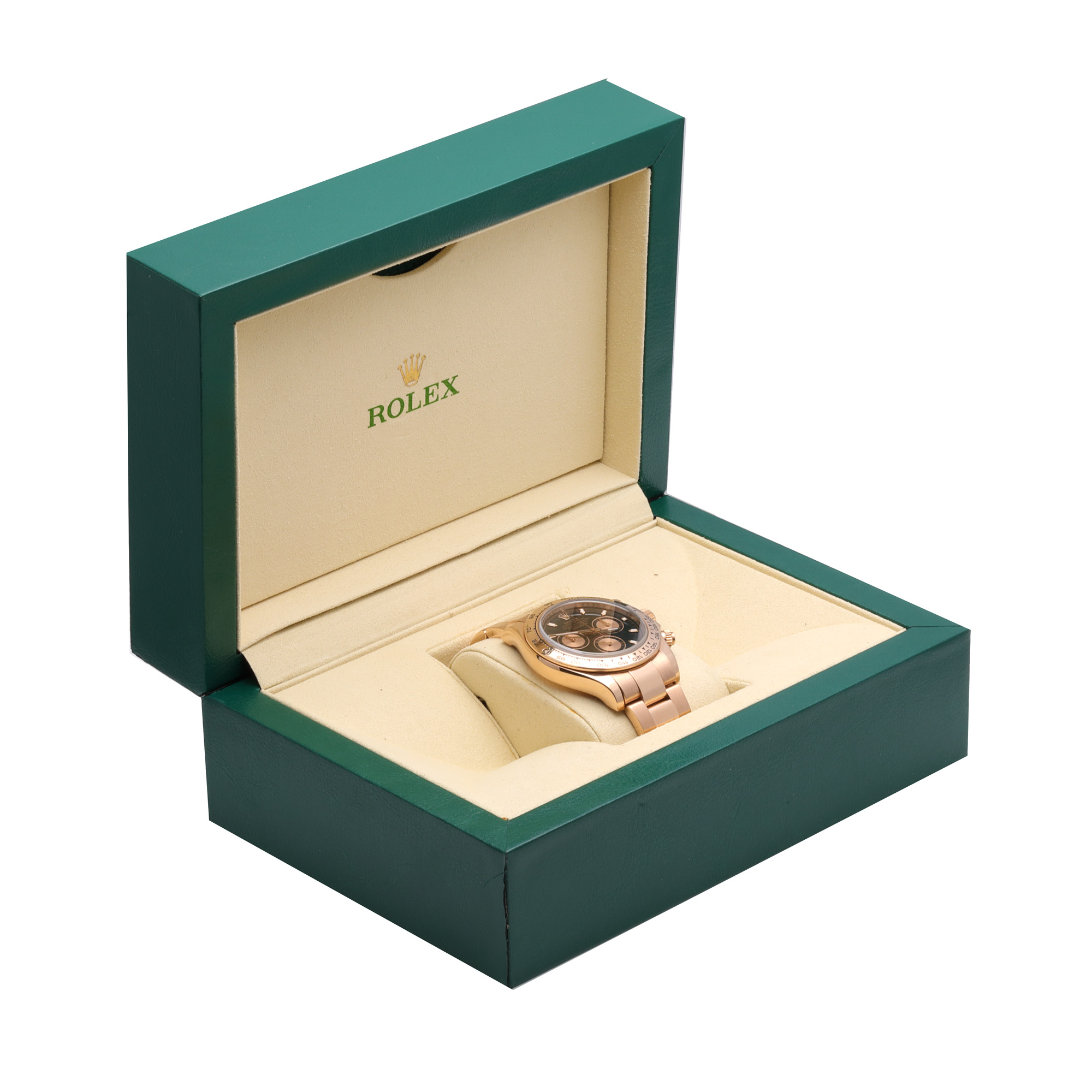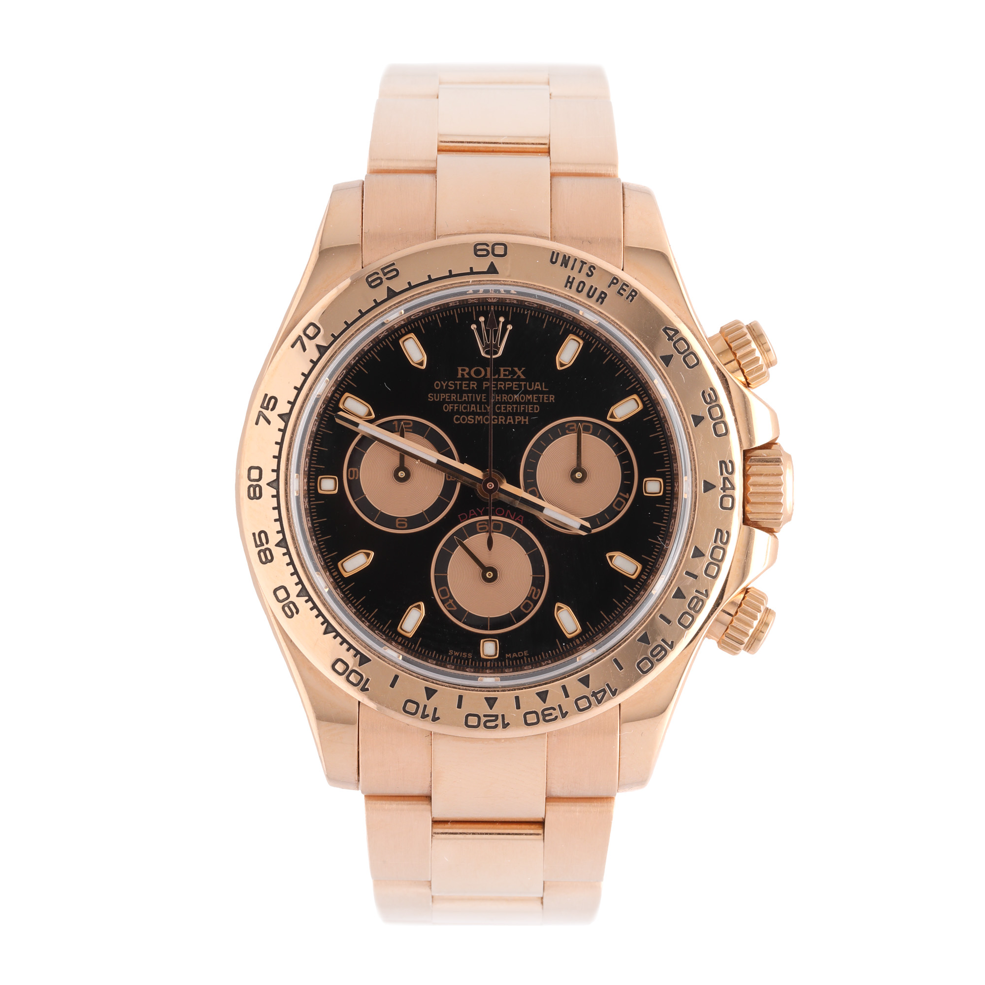 Ceas Rolex Daytona, din aur roz, de mână, bărbătesc, referință 116505. Mecanism automatic, calibrul 4130, cu funcție de chronograph. Cadran de culoare negru, indici baghetă, cu două registre pentru funcția de chronograph în dreptul orelor 3 și 9 și un registru pentru secundar în dreptul orei 6. Brățară originală, din aur roz, cu sistem de închidere de tip deployant. Accesorii: cutia originală și card de garanție.