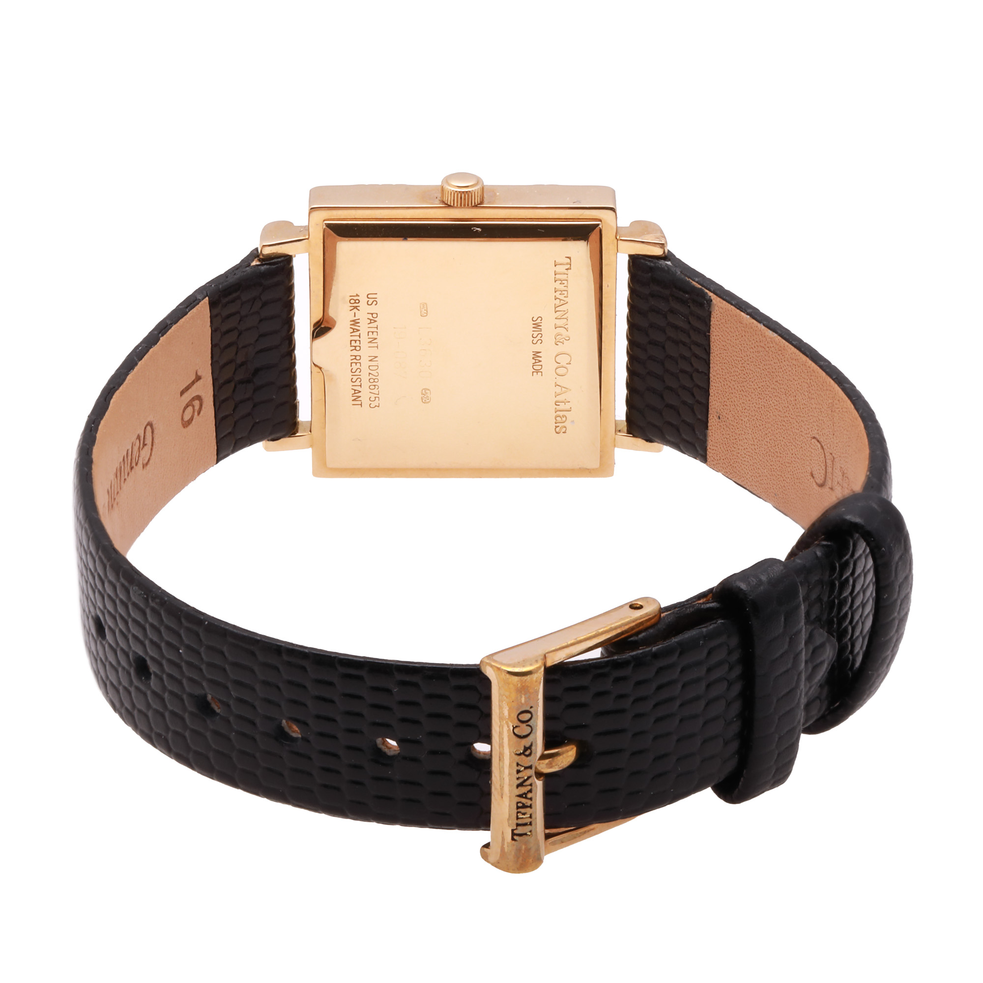 Ceas Tiffany&Co Gold Atlas, de mână, de damă, referință L3630. Mecanism quartz. Cadran de culoare crem, cu indici cifre romane pe bezel. Curea adăugată aftermarket, din piele, de culoare neagră, sistem de închidere clasic cu catarama originală.