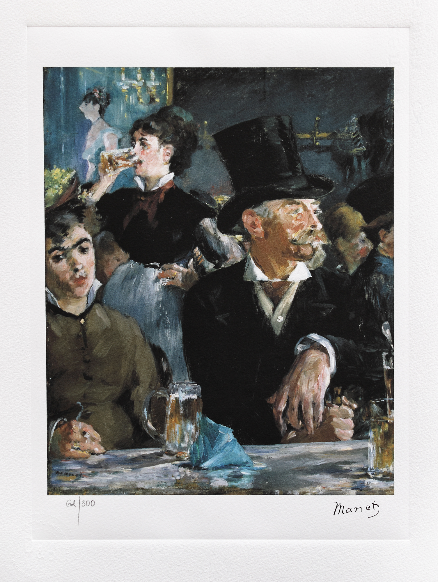 semnat dreapta jos, sub cadru, ”Manet”; numerotat stânga jos, sub cadru, în creion, ”62/300”; stânga jos, ștampila editurii, ”D&P CERTIFIED ARTS USA EUROPE SINCE 1997”