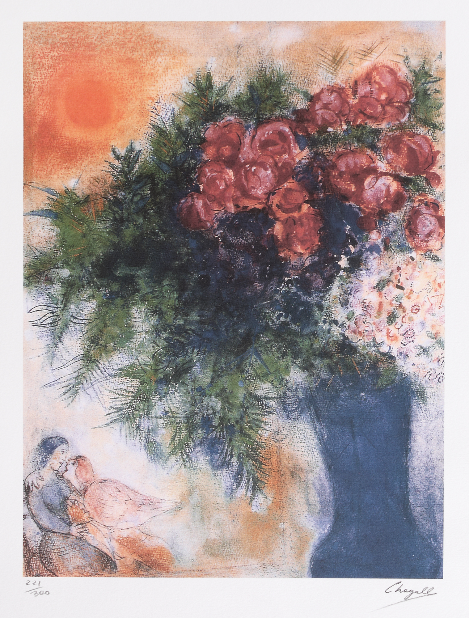 semnat dreapta jos, sub cadru, "Chagall"; numerotat stânga jos, sub cadru, "221/300"; stânga jos, ștampila editurii, "SPADEM Paris"