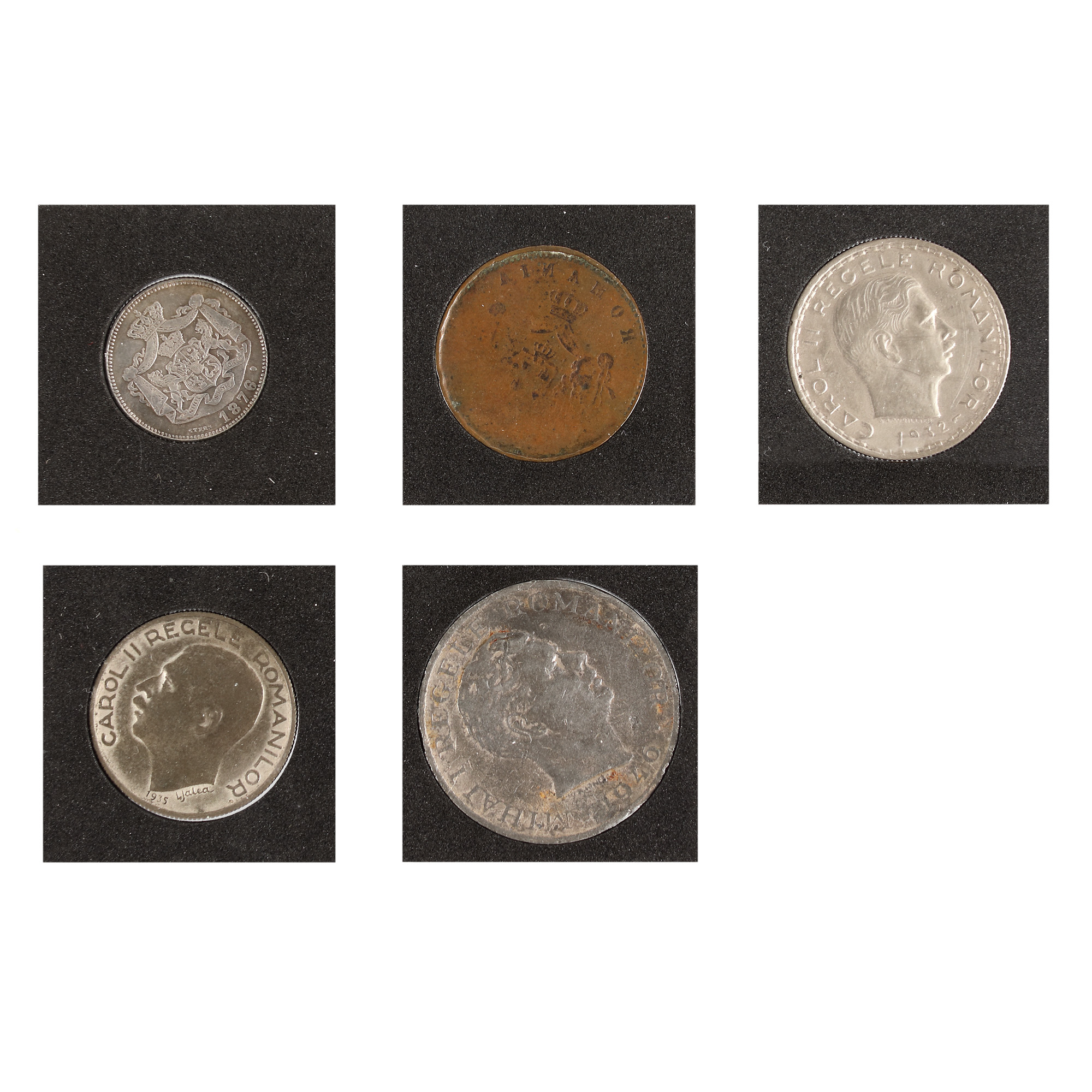 81. Interesant lot format din cinci falsuri de epocă, 10 Bani 1867, 1 Leu 1876, 100 Lei 1932, 250 Lei 1935 (din matrița originală) și 100000 Lei 1946