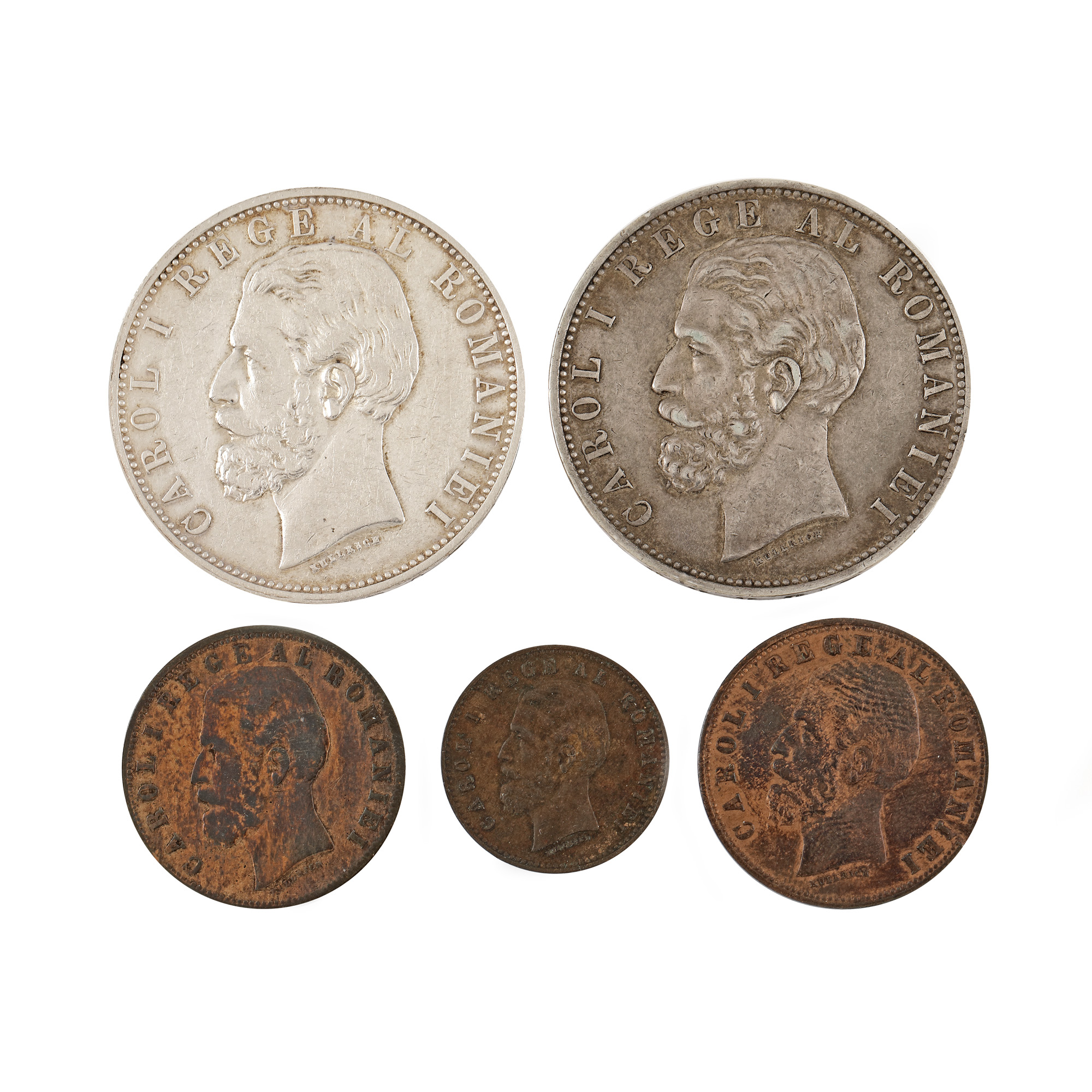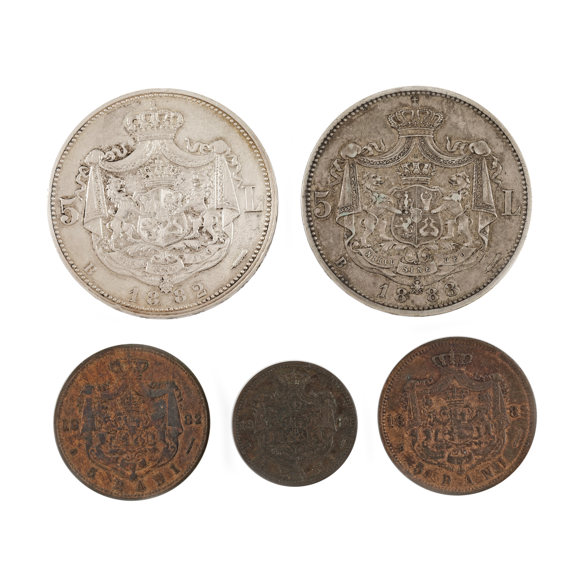 66. Lot format din cinci monede, 2 Bani, 5 Bani, 5 Lei 1882, 5 Bani, 5 Lei 1883