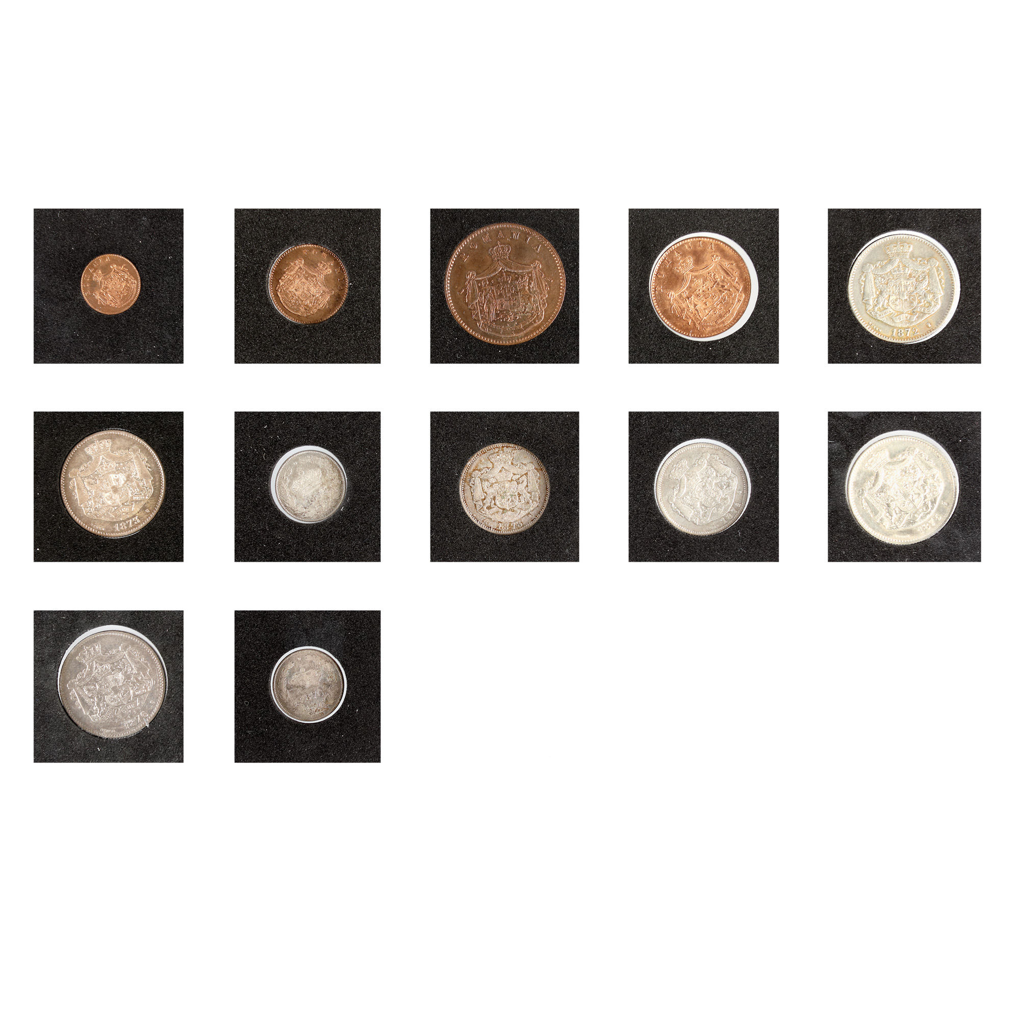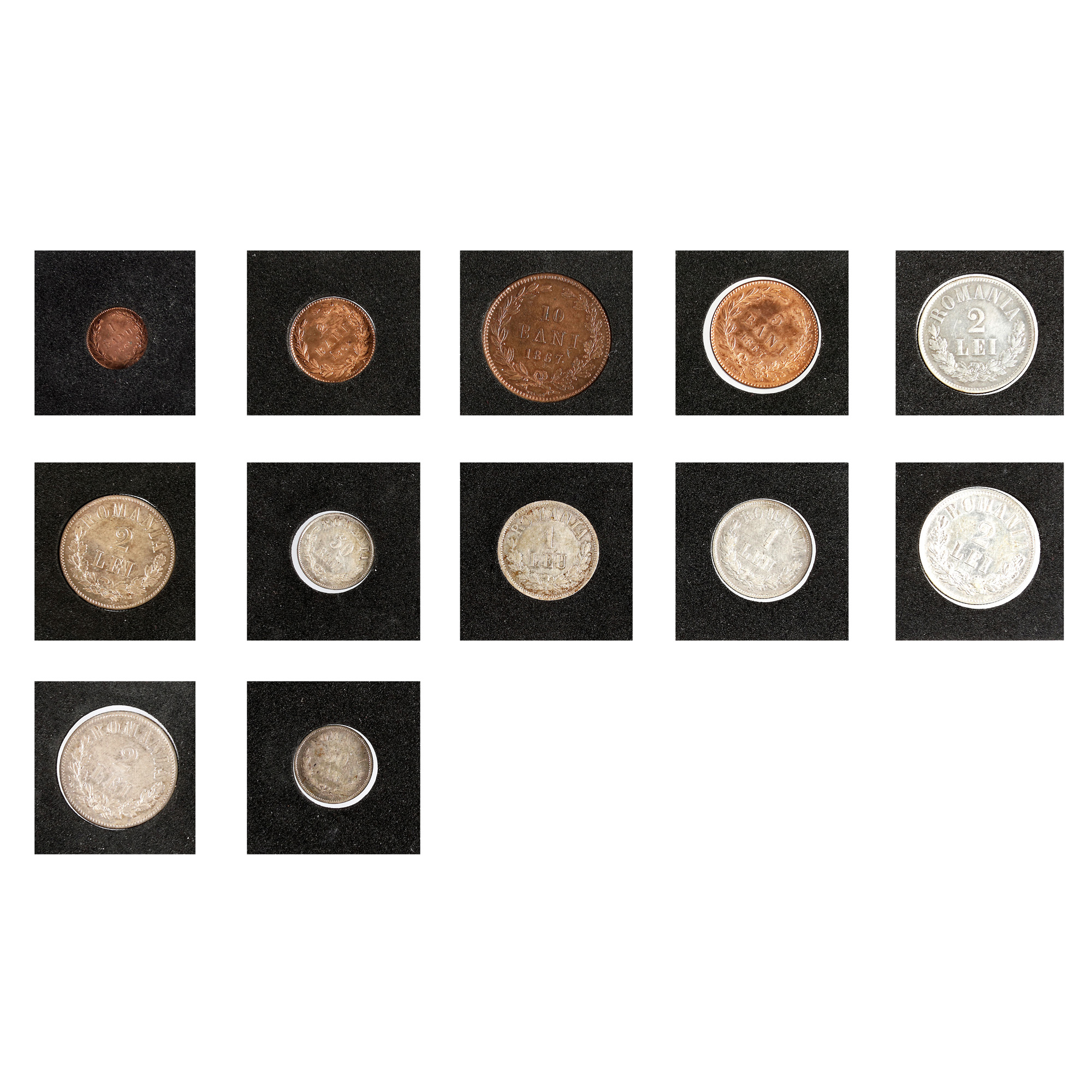 54. Lot format din douăsprezece monede, 1 Ban, 2 Bani, 5 Bani, 10 Bani 1867, 2 Lei 1872, 50 Bani, 1 Leu, 2 Lei 1873, 1 Leu 1874, 2 Lei 1875, 50 Bani, 2 Bani 1876