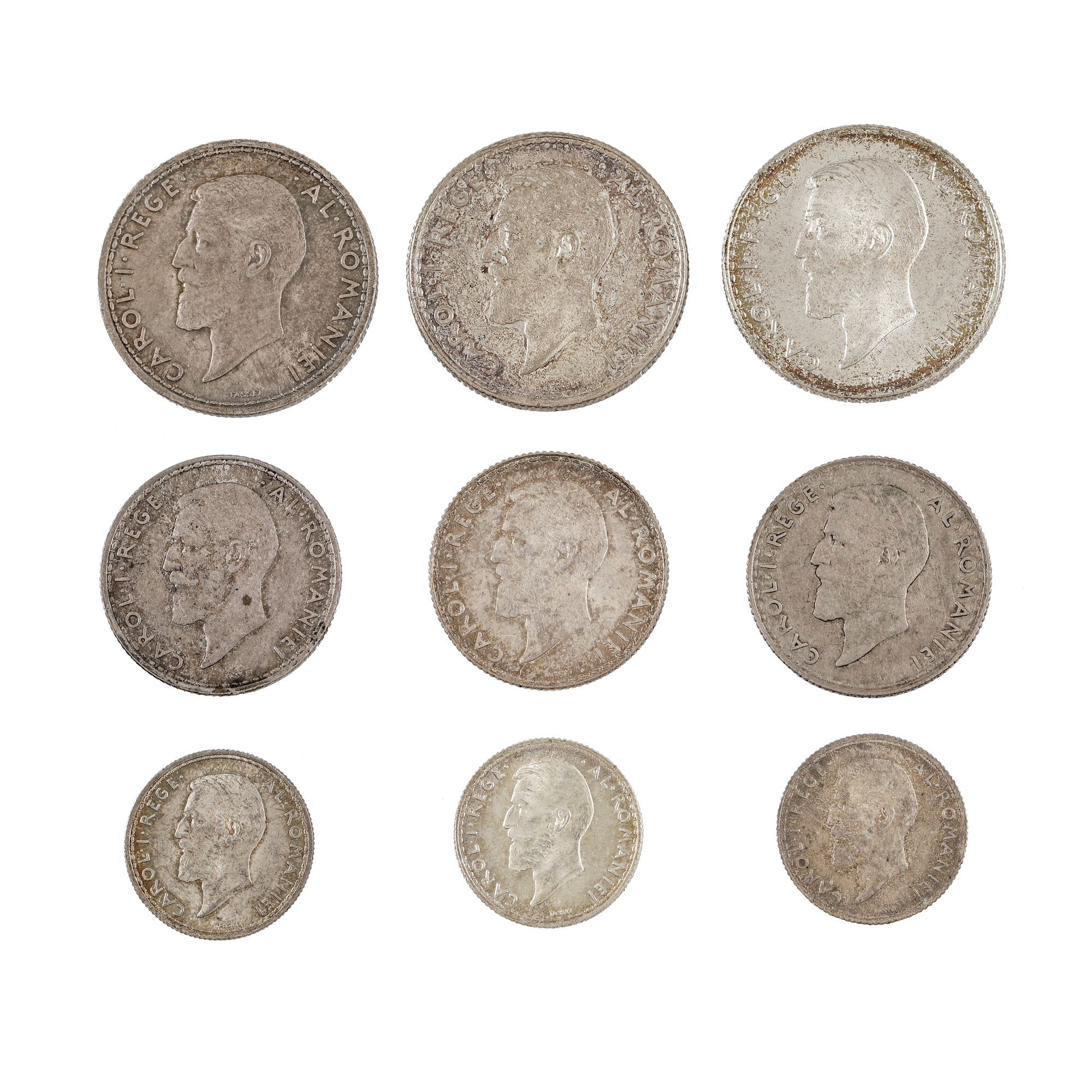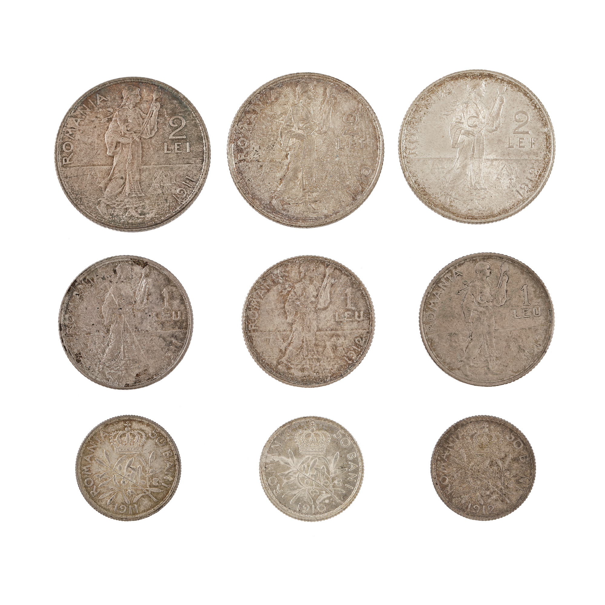 93. Lot format din nouă monede, 50 Bani, 1 Leu, 2 Lei 1910, 50 Bani, 1 Leu, 2 Lei 1911, 50 Bani, 1 Leu, 2 Lei 1912