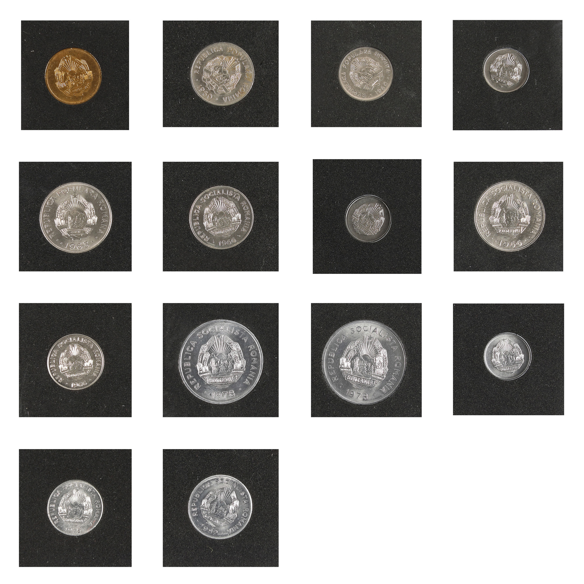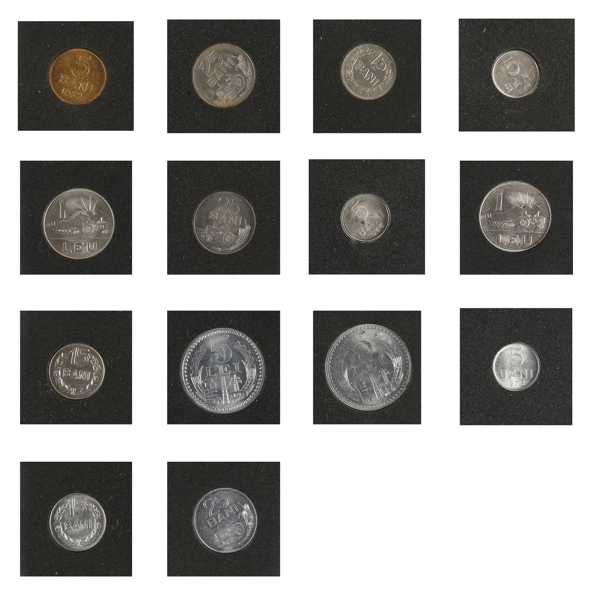 89. Lot format din paisprezece monede, 5 Bani 1957, 15 Bani, 25 Bani 1960, 5 Bani, 1 Leu 1963, 5 Bani, 15 Bani, 25 Bani, 1 Leu 1966, 5 Bani, 15 Bani 1975, 5 Lei rezervor cu picioare scurte, 5 Lei rezervor cu picioare lungi 1978, 25 Bani 1982