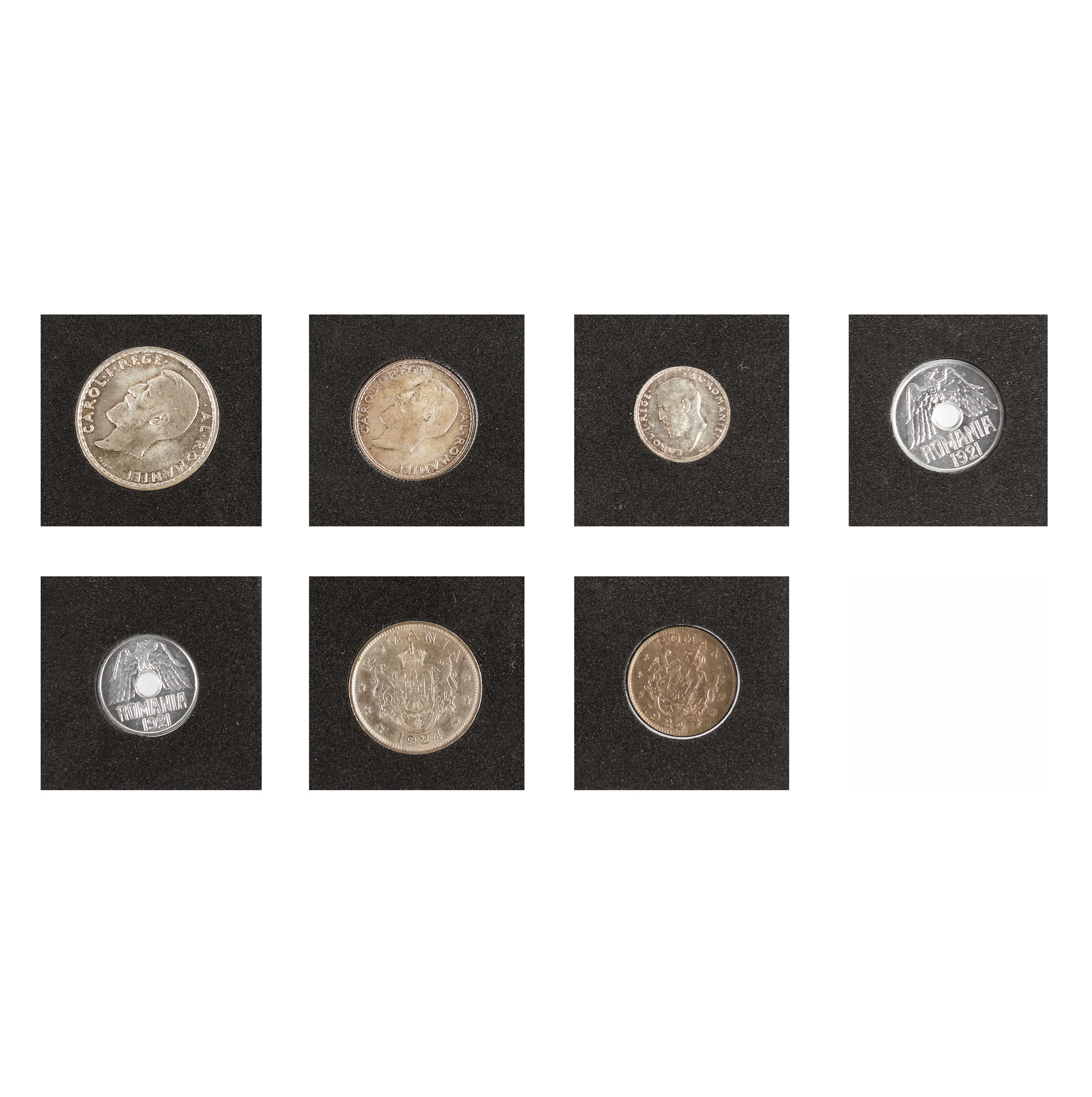76. Lot format din șapte monede, 50 Bani, 1 Leu, 2 Lei 1914, 25 Bani, 50 Bani 1921, 1 Leu, 2 Lei 1924