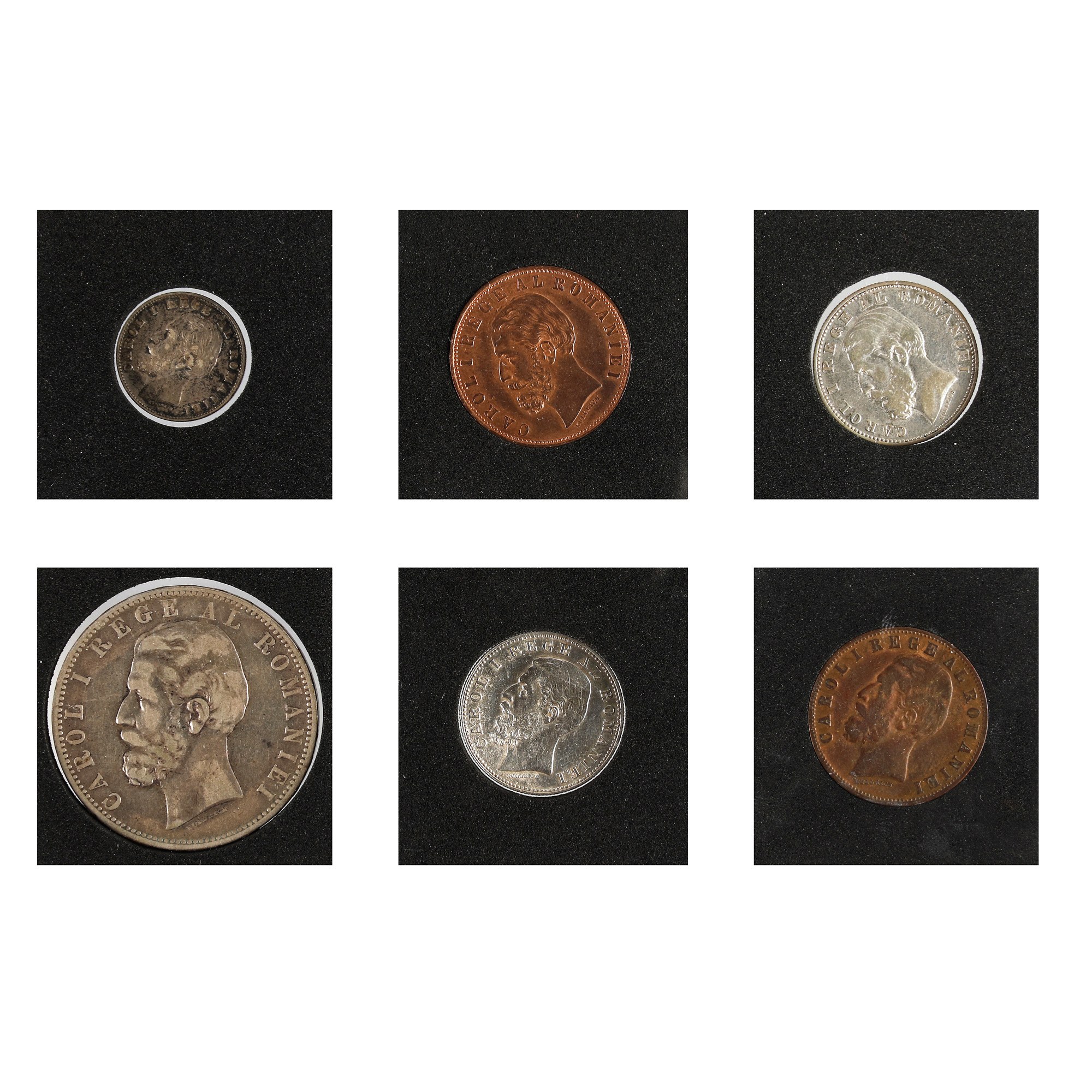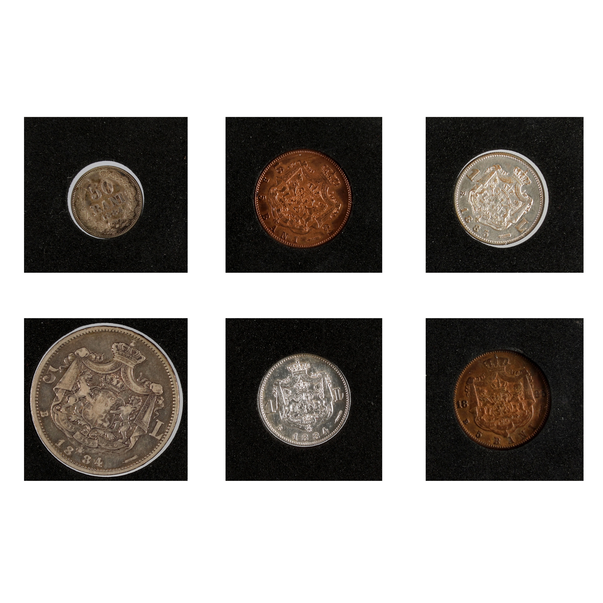 69. Lot format din șase monede, 5 Bani, 50 Bani, 1 Leu, 5 Lei 1884, 5 Bani, 1 Leu 1885