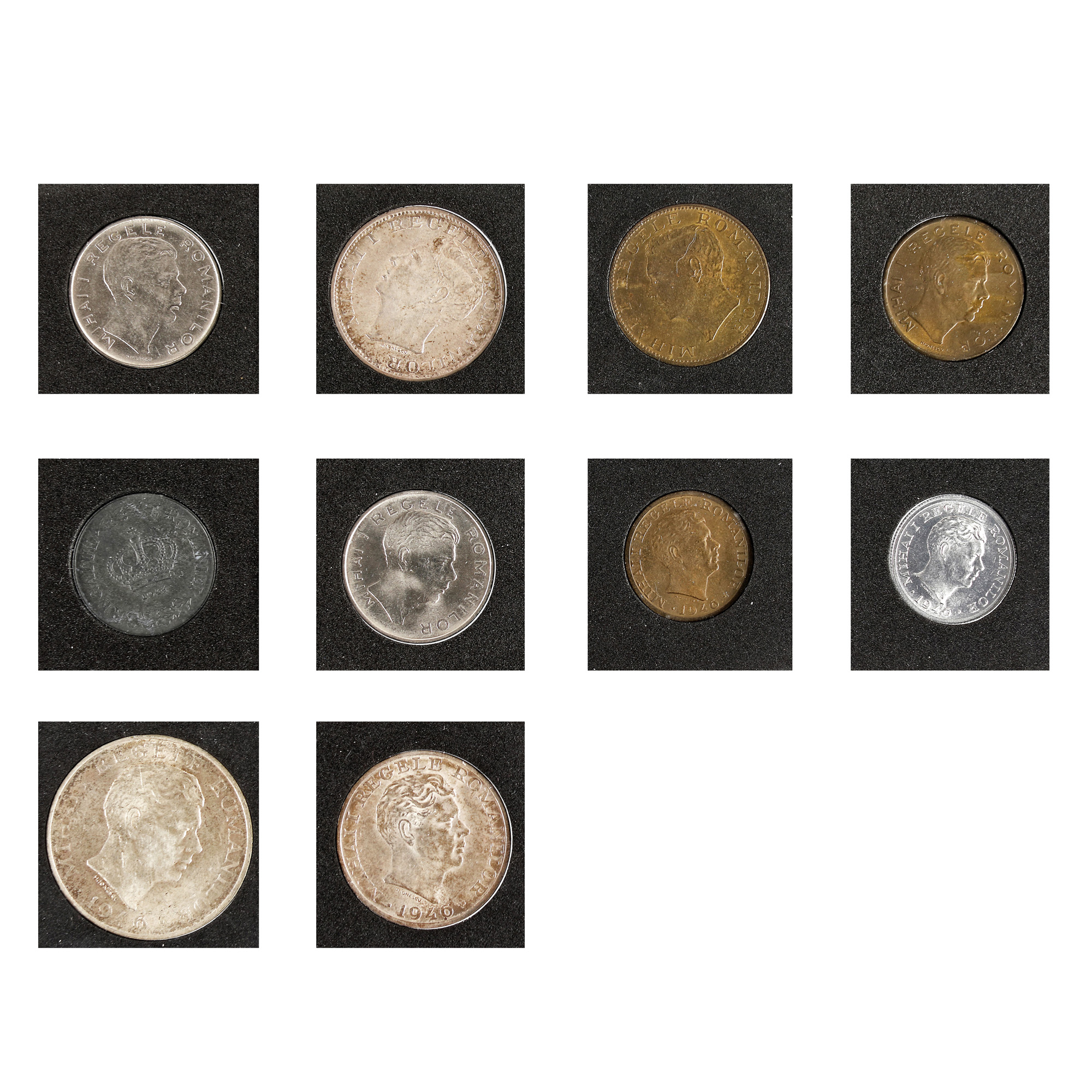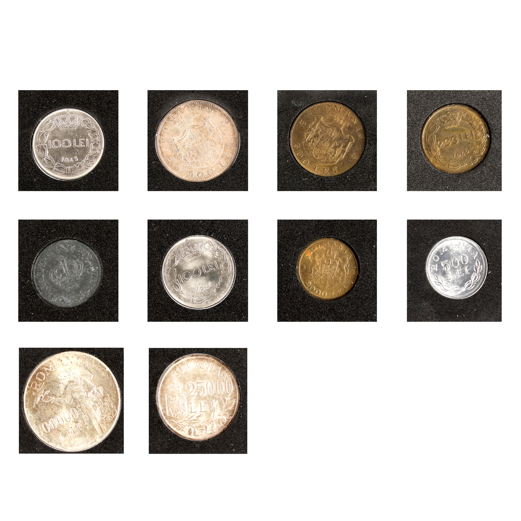 84. Lot format din zece monede, 100 Lei 1943, 20 Lei, 100 Lei, 500 Lei 1944, 200 Lei, 500 lei 1945, 500 Lei, 2000 Lei, 25000 Lei, 100000 Lei 1946