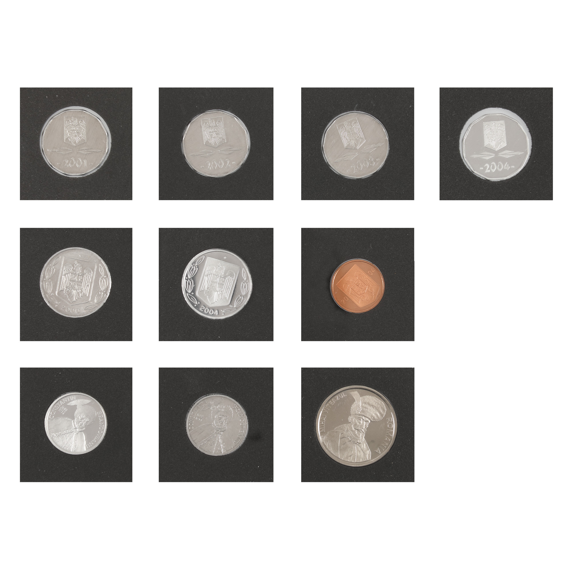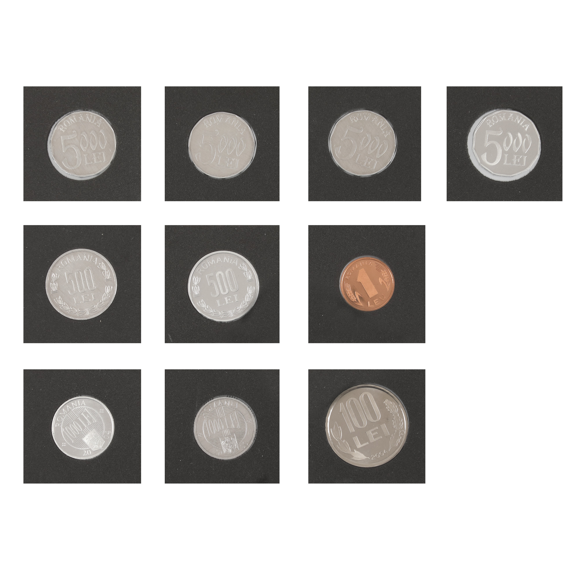 113. Lot format din zece monede, 500 Lei, 1000 Lei 2000, 5000 Lei 2001, 5000 Lei 2002, 5000 Lei 2003, 1 Leu, 100 Lei, 500 Lei, 1000 Lei, 5000 Lei 2004
