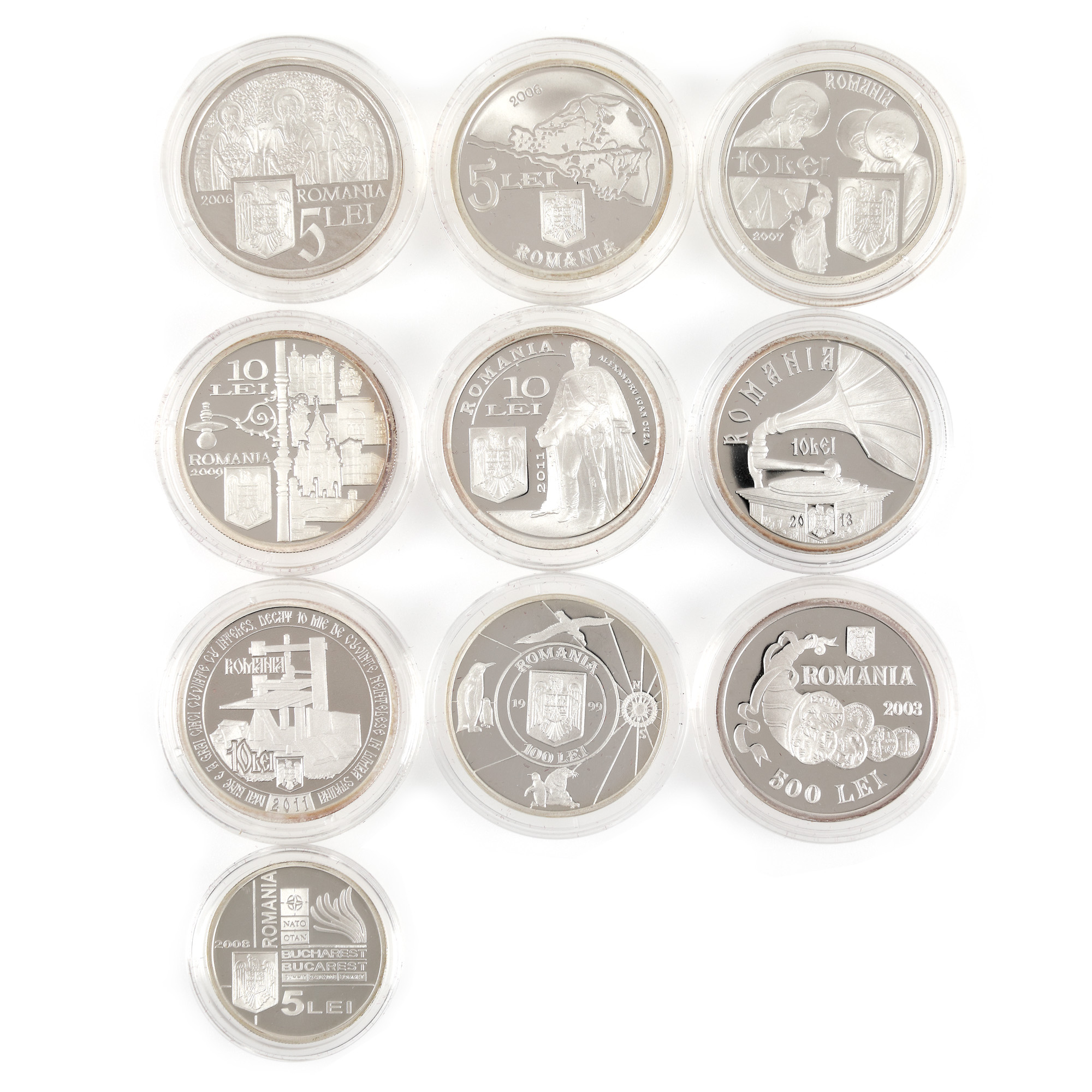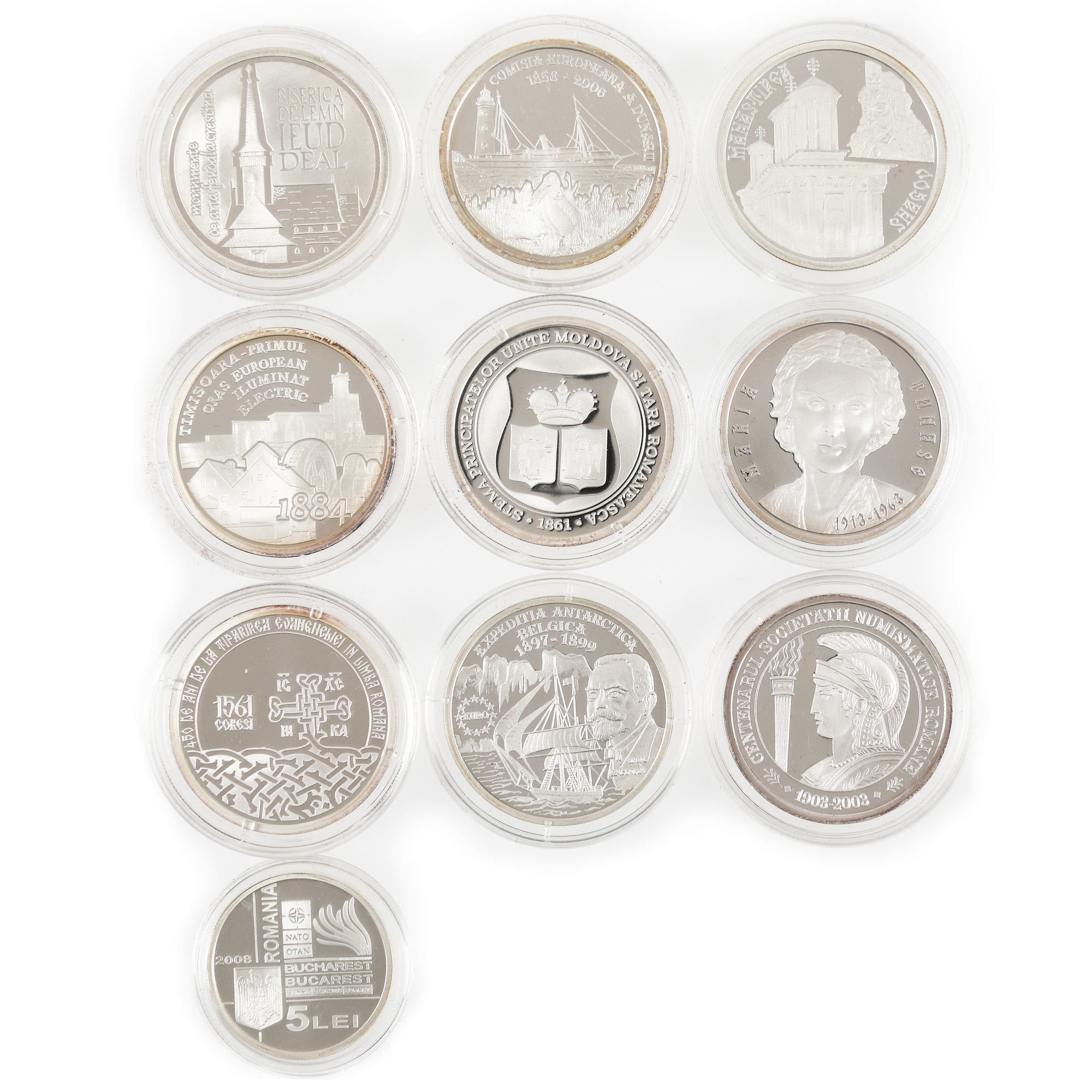 150 de ani de la înființarea Comisiei Europene a Dunării 2006, Summitul NATO 2008, 450 de ani de la tipărirea Evangheliei în limba română 2011, Expediția Antarctica Belgica 1999, 150 de ani de la crearea stemei Principatelor Unite Moldova și Țara Românească 2011, 100 de ani de la nașterea Mariei Tănase 2013, Mănăstirea Snagov 2007, Timișoara - Primul oraș european iluminat electric 2009, Monumente de artă feudală creștină - Biserica de lemn Ieud Deal 2006, Centenarul Societății Numismatice Române 2003