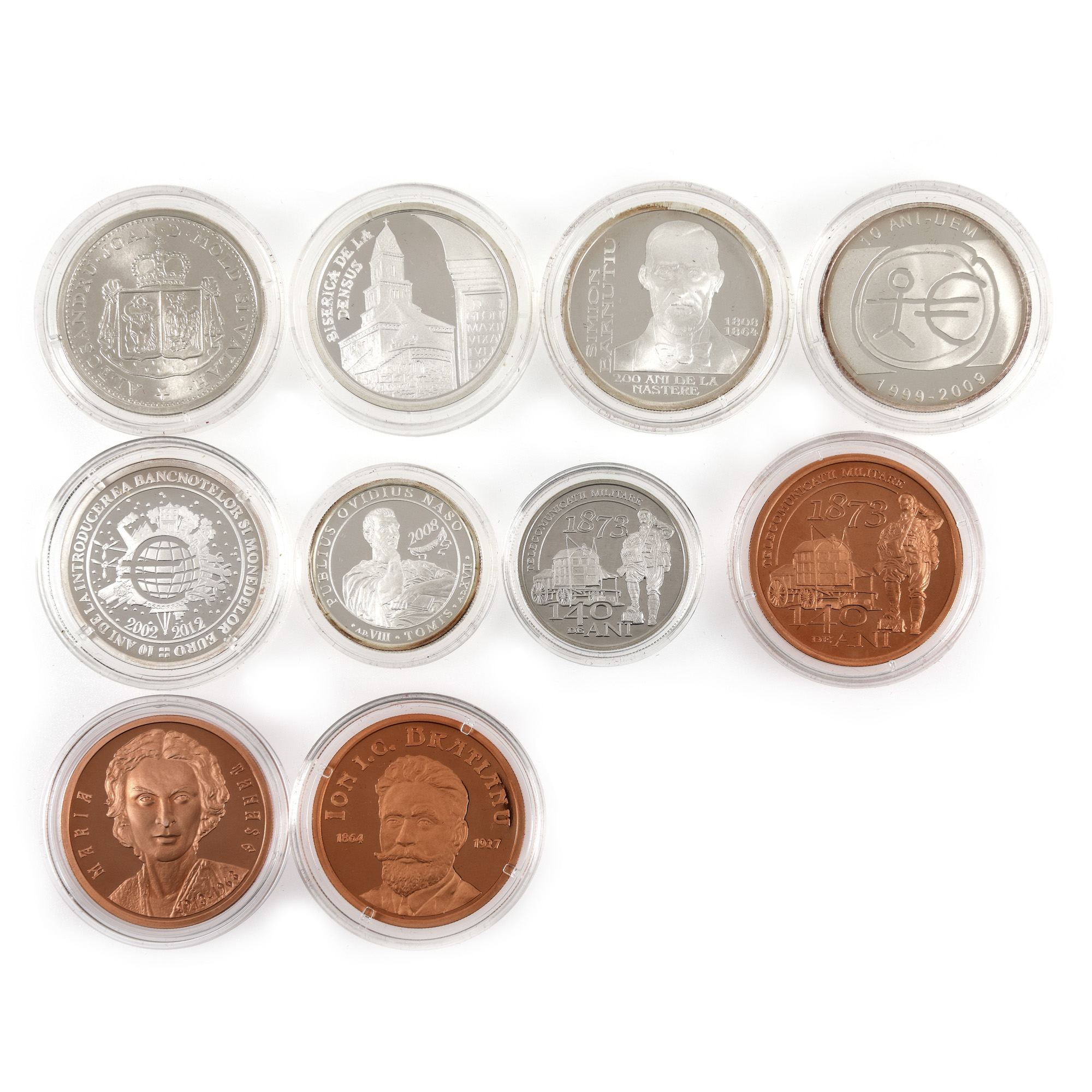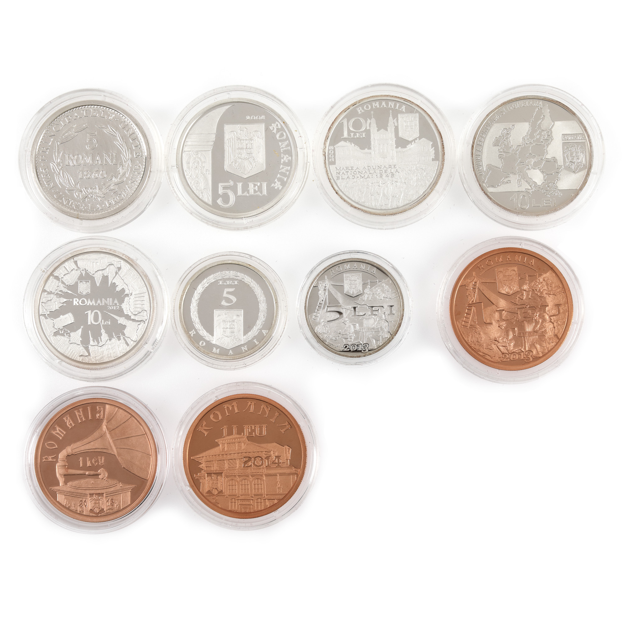 Maria Tănase 2013, 200 de ani de la nașterea lui Simion Bărnuțiu 2008, 2 x 140 de ani de telecomunicații militare 2013 tombac și argint, Proiect al monedei de 5 Români 1860 - A. I. Cuza, Ovidius Naso 2008, 10 ani de la introducerea bancnotelor și monedelor Euro 2012, Biserica de la Densuș 2006, Ion I. C. Brătianu 2014, 10 ani de la inființarea Uniunii Economice și Monetare 2009