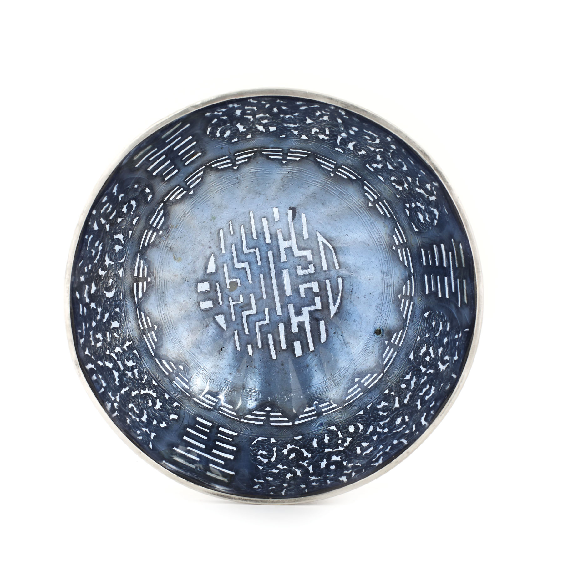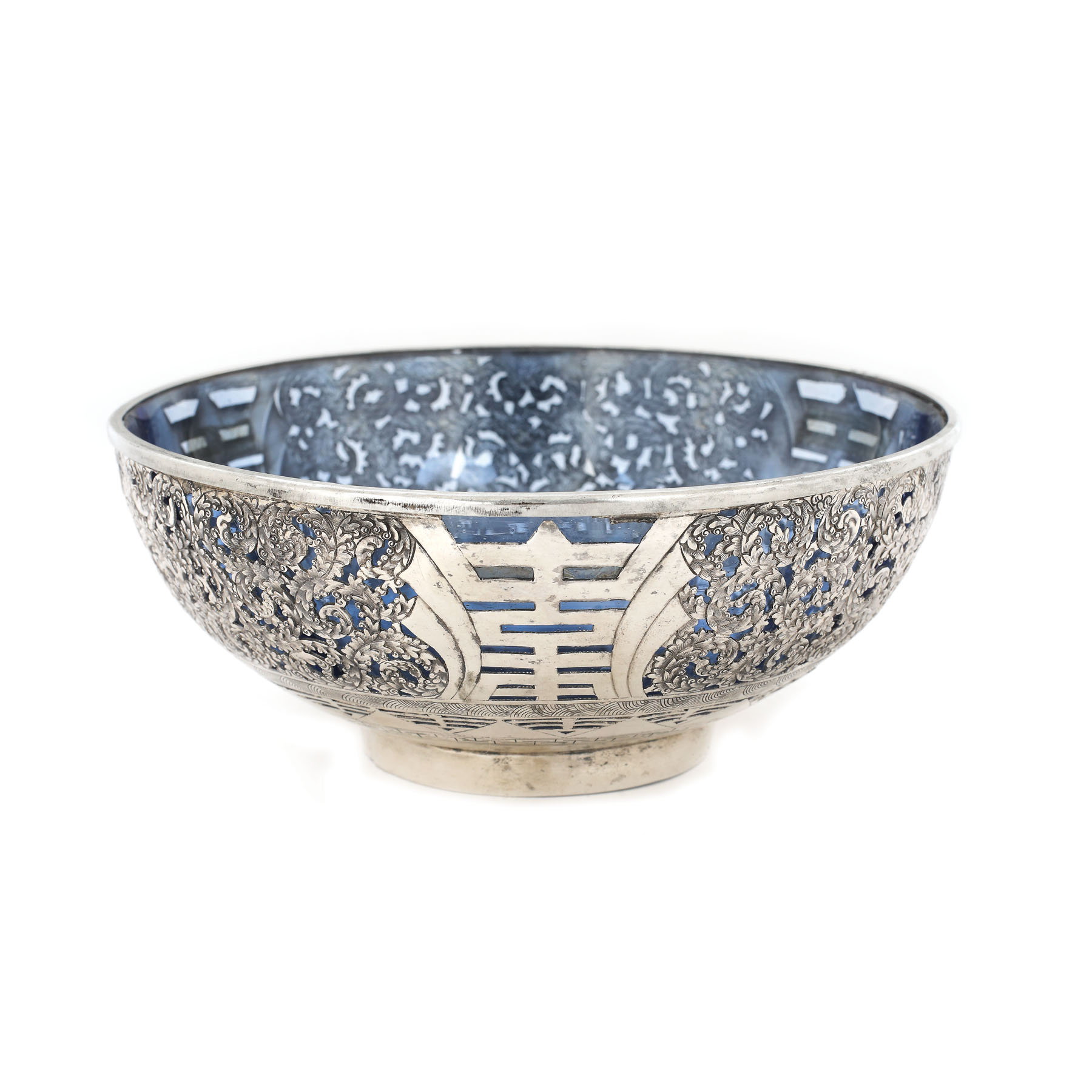 93. Bol din sticlă colbalt montată în argint, cu elemente florale traforate [Sec. XX]