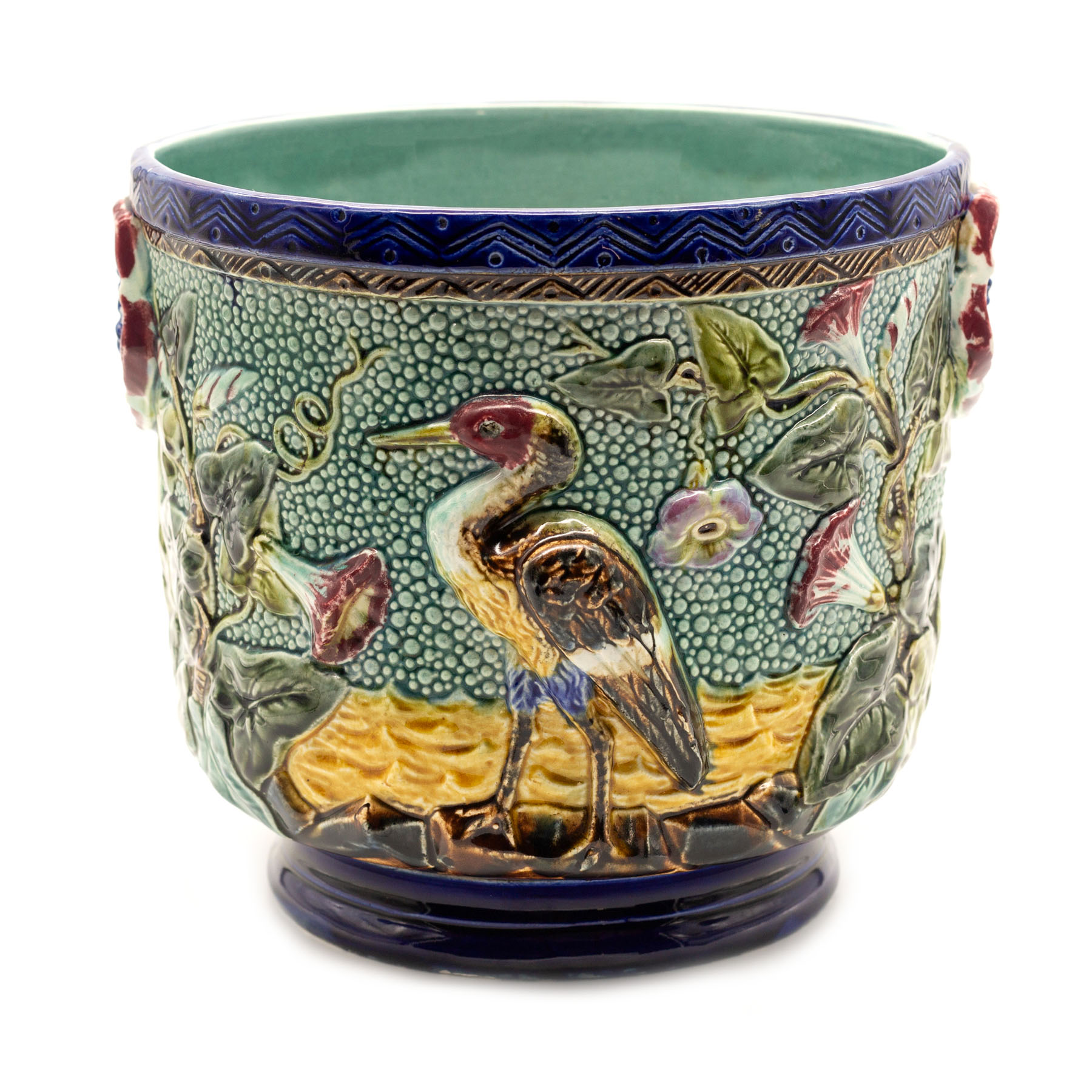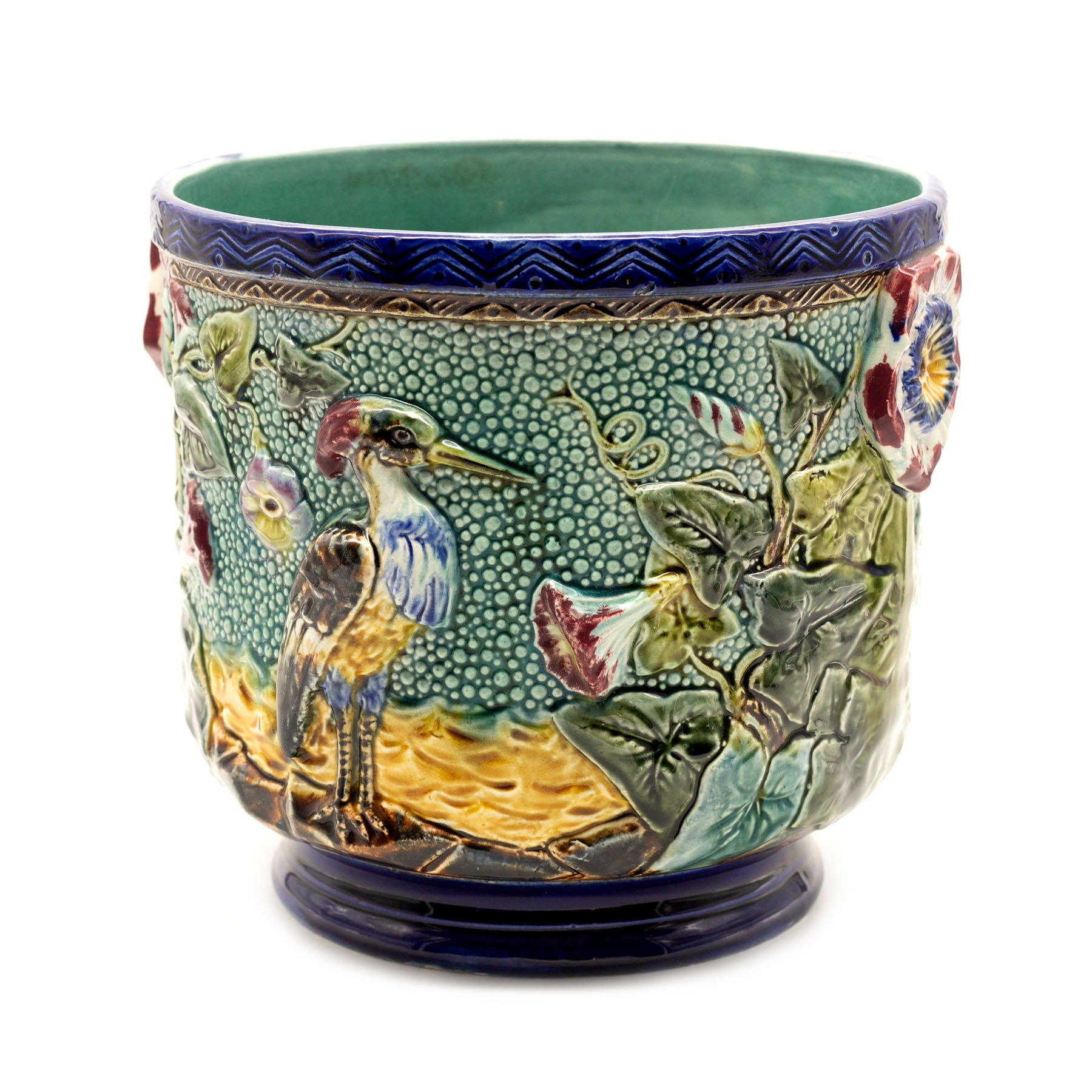 144. Cache-pot Art Nouveau din ceramică, pictat cu păsări și flori, începutul sec. XX