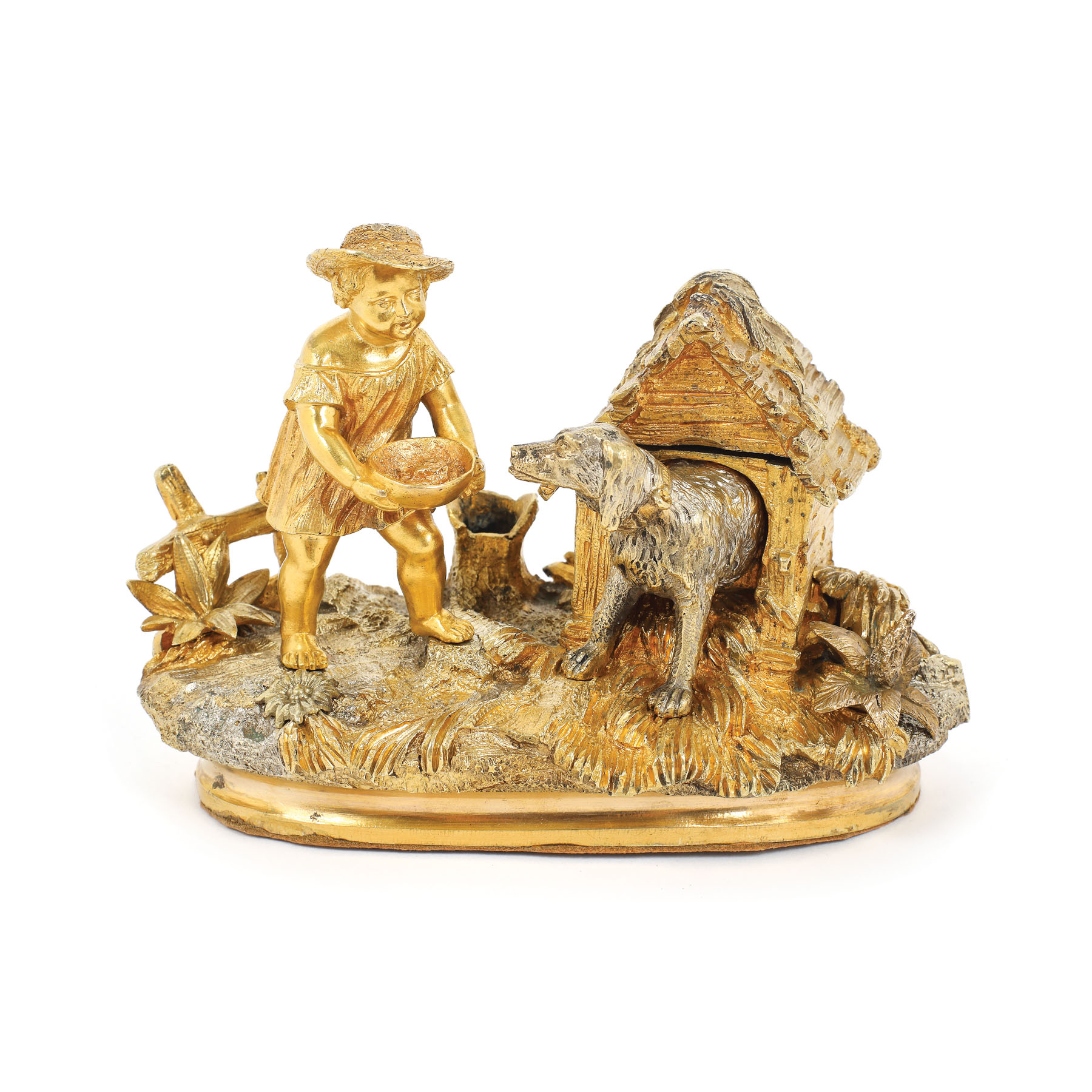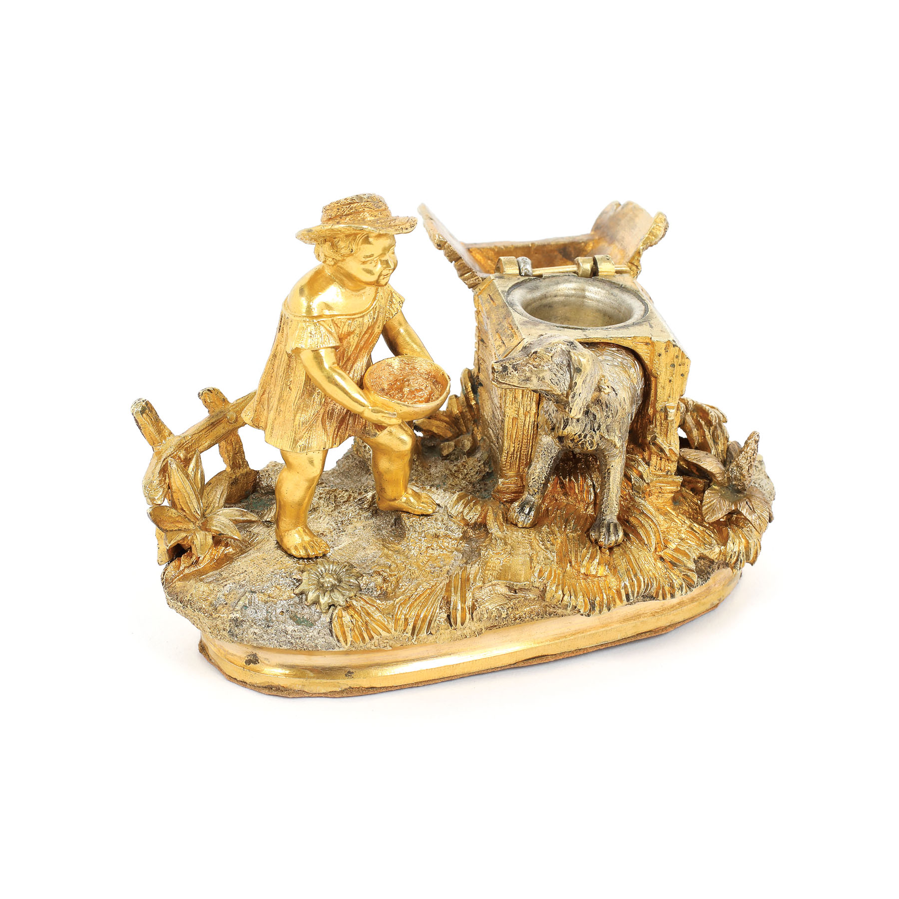 112. Encrieră din bronz parțial argintat și aurit, reprezentând un copilaș hrănindu-și câinele, sfârșitul sec. XIX