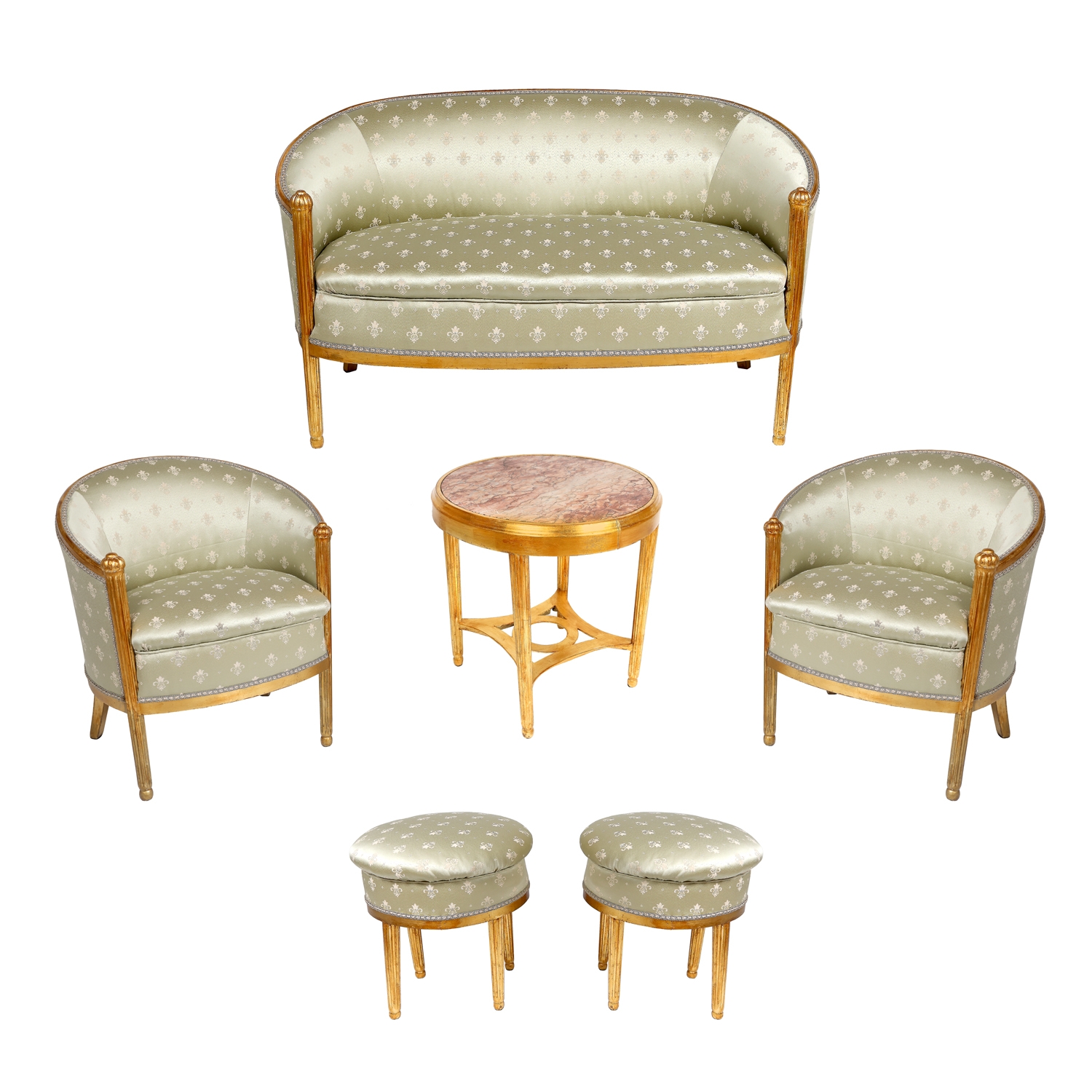 121. Garnitură pentru salon, formată din canapea, două fotolii, două taburete și o masă, sec. XIX