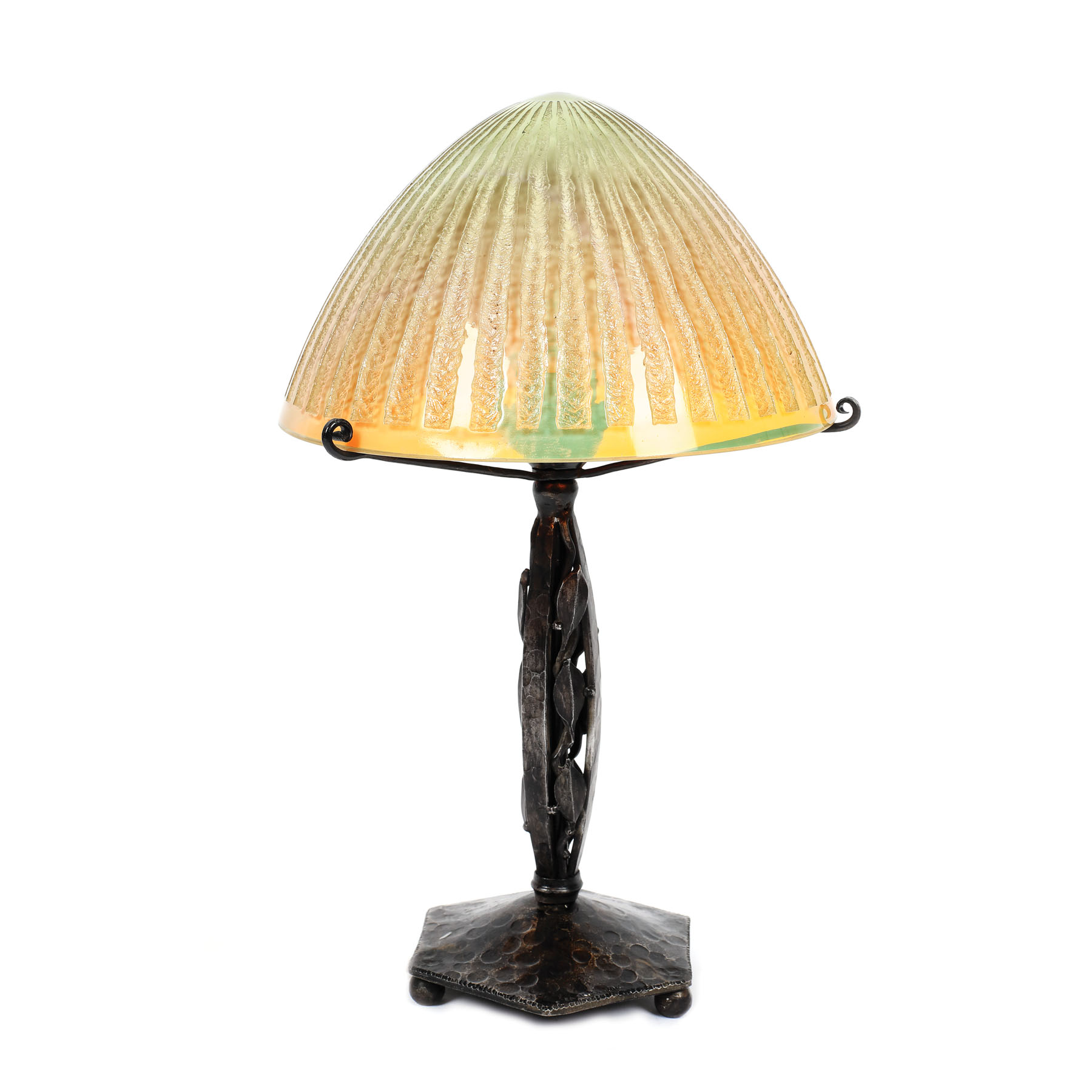 Lampă stil Art Deco, cu formă organică și elegantă, stilizată după cea a unei ciuperci, formă extrem de populară în design-ul de obiect Art Deco, și bază hexagonală. Piciorul fusiform, din fier forjat și ciocănit, este alcătuit din benzi alternante, pline și din foliaj stilizat în maniera specifică, ușor geometrizantă, a stilului. Suprafața întregului picior este prelucrată decorativ prin martelare. Abajurul din sticlă, pe care sunt gravate cu acid caneluri radiante, evidențiază un spectaculos degradé de la roșu la verde atunci când lampa este aprinsă. Louis Katona (1850-1933) a fost unul dintre cei mai apreciați manufacturieri de obiecte de artă decorativă din fier forjat, reușind să combine o estetică impresionistă cu acest material nu tocmai delicat. Majoritatea creațiilor sale valorifică interesul pe care stiluri precum Art Nouveau sau Art Deco l-au avut, la finalul secolului XIX și începutul secolului XX, pentru valențele decorative ale fierului forjat, material foarte popular în design-ul epocii. Daum Nancy este una dintre cele mai faimoase manufacturi de sticlă artistică din Franța, competitor valoros al atelierelor Gallé, pe care le-au și depășit în aprecierea publicului după decesul lui Emile Gallé, în 1904. Producția de obiecte de artă din sticlă a atelierului Daum, în majoritatea ei în stilurile Art Nouveau și Art Deco, a început în jur de 1890, manufactura devenind repede un vârf în domeniu la finalul secolului XIX și în primele decenii ale secolului XX, poziție pe care o păstrează și în prezent.