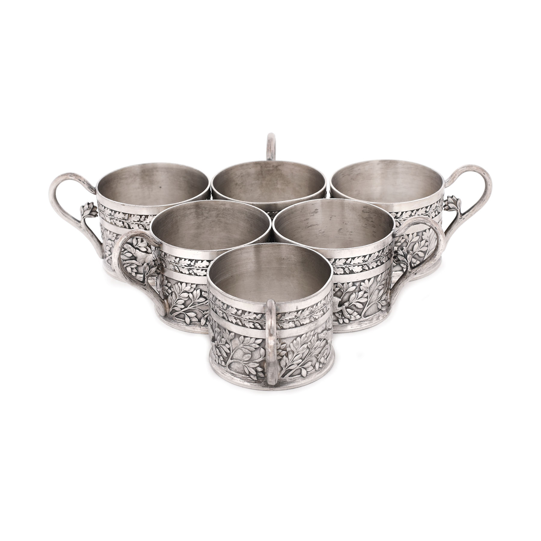 102. Set WMF de șase suporturi pentru pahare, cu poansonul magazinului Frații Roller, decorat cu scene de vânătoare, începutul sec. XX