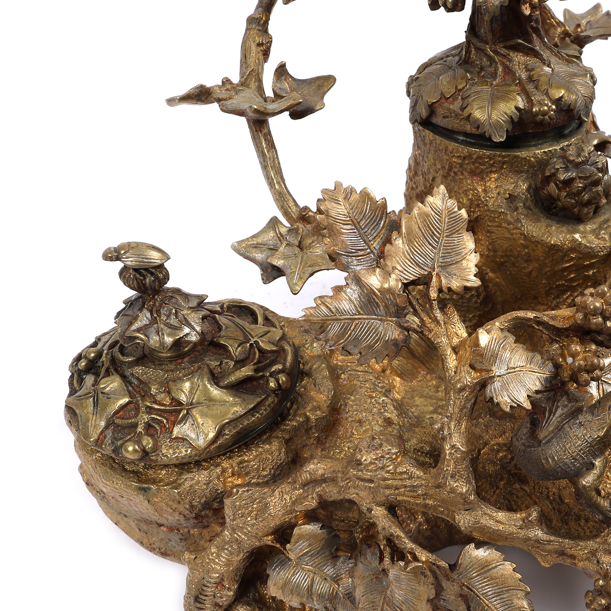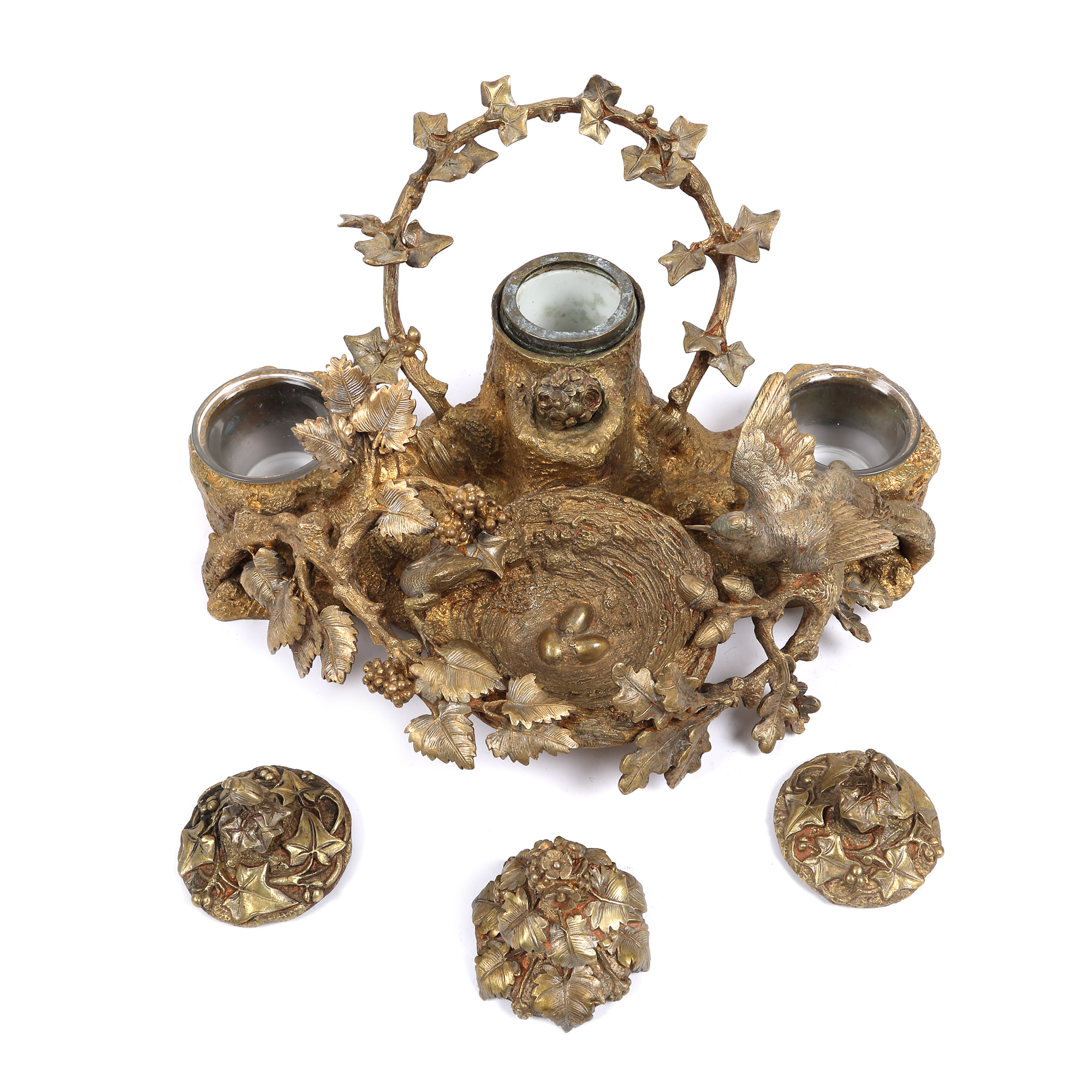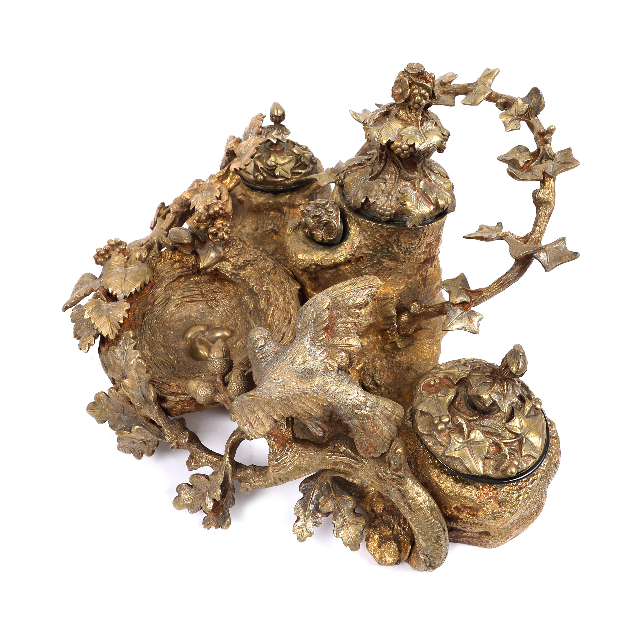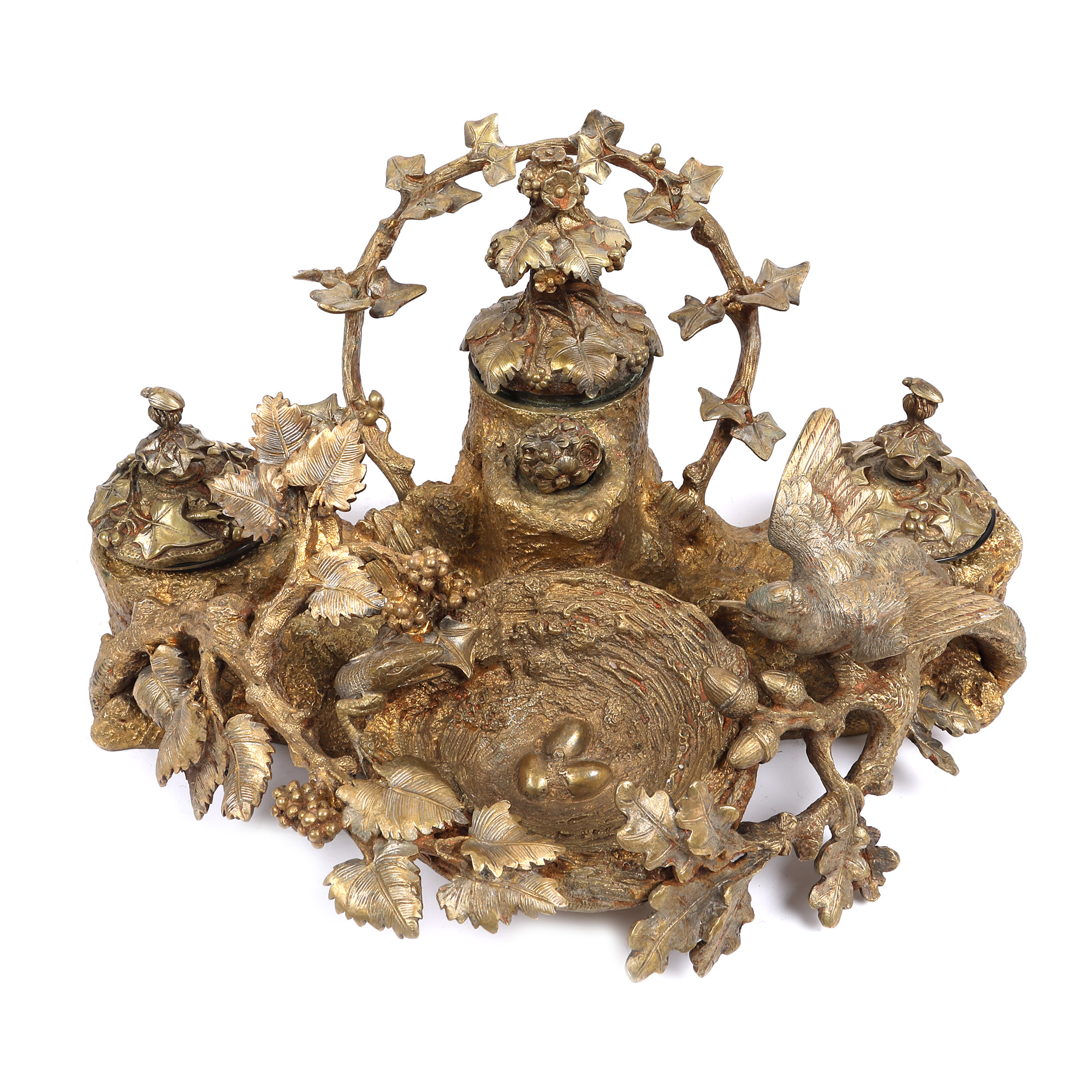 134. Encrieră din bronz, decorată cu rândunică aparându-și cuibul, sec. XIX
