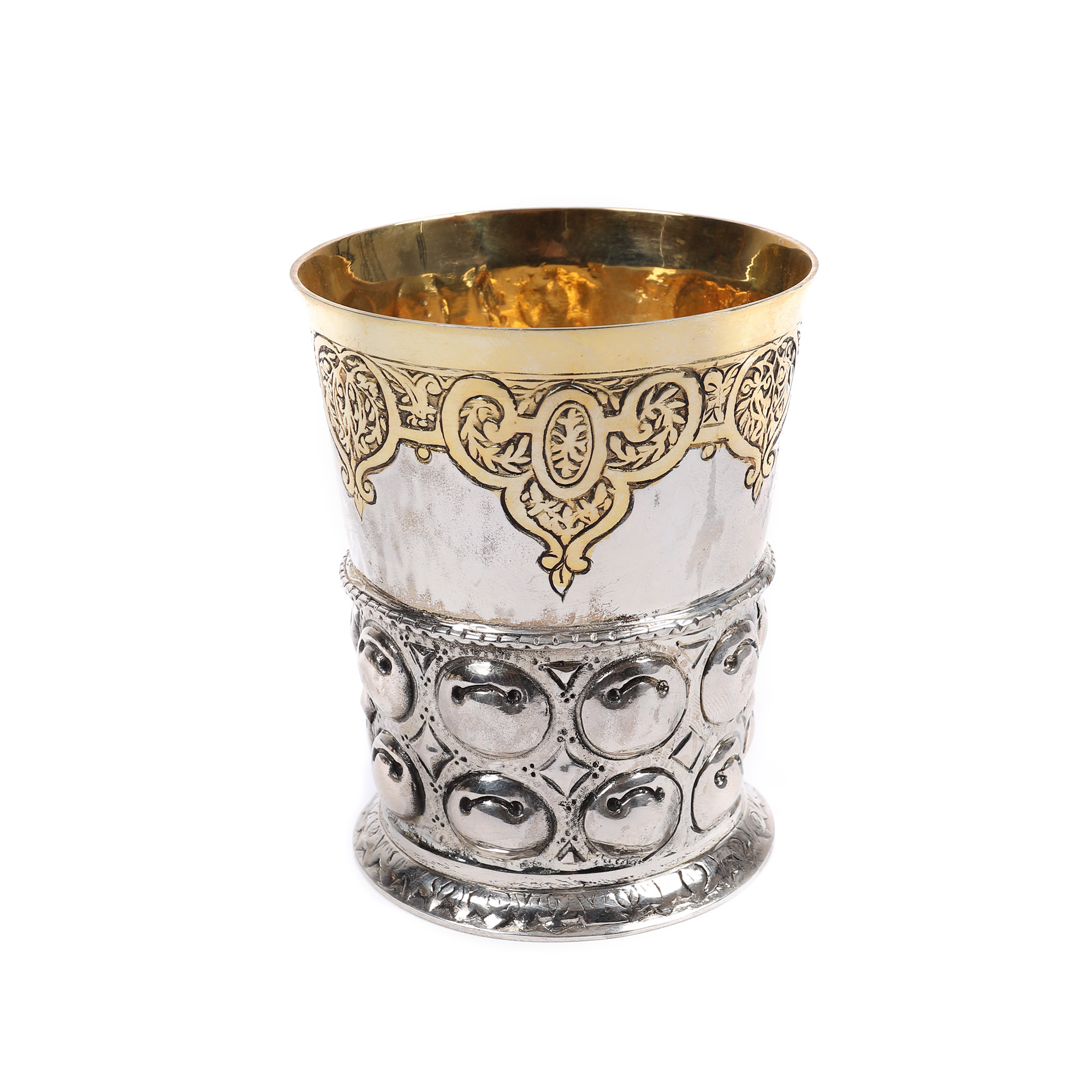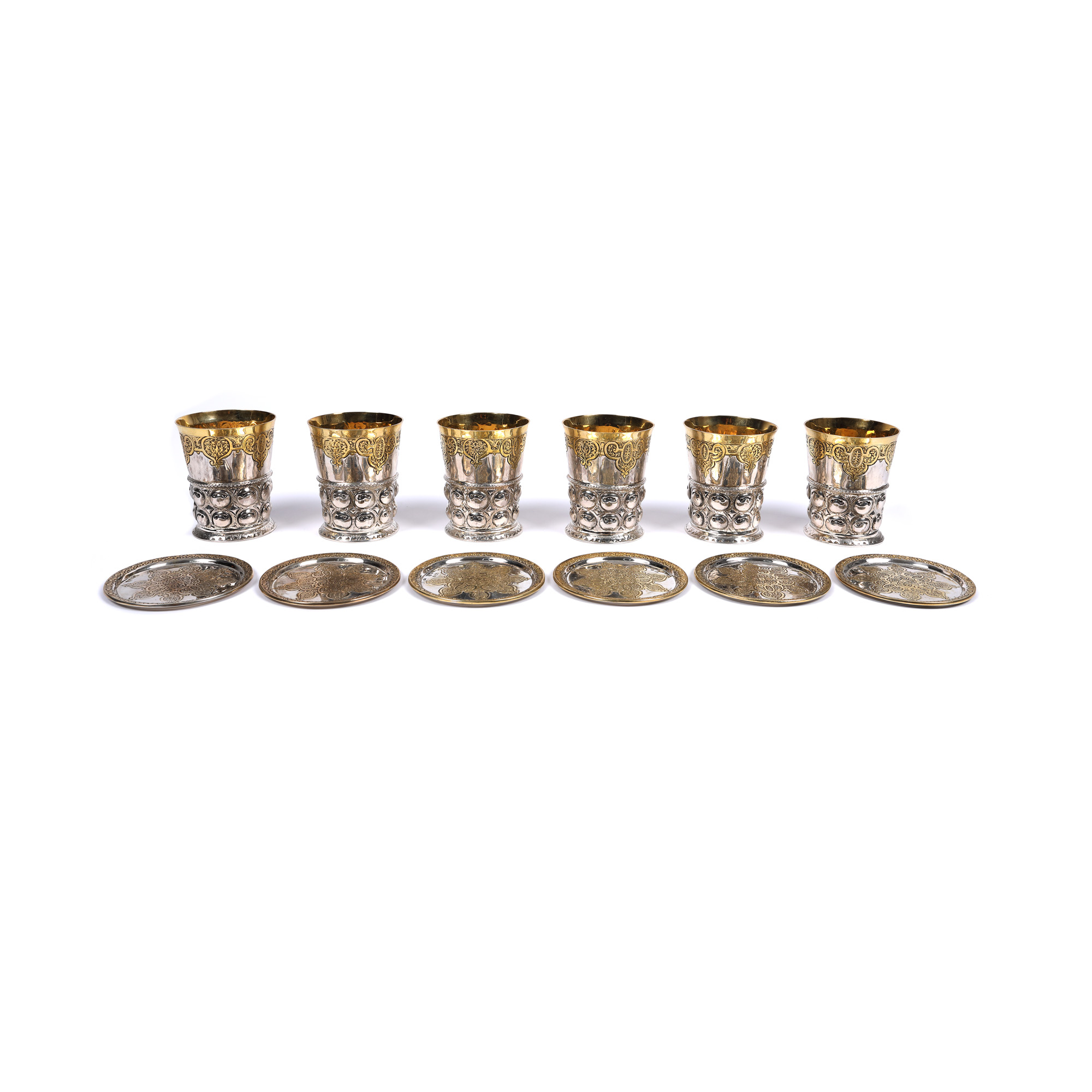 144. Set din argint, parțial aurit, format din șase pahare cu farfurie