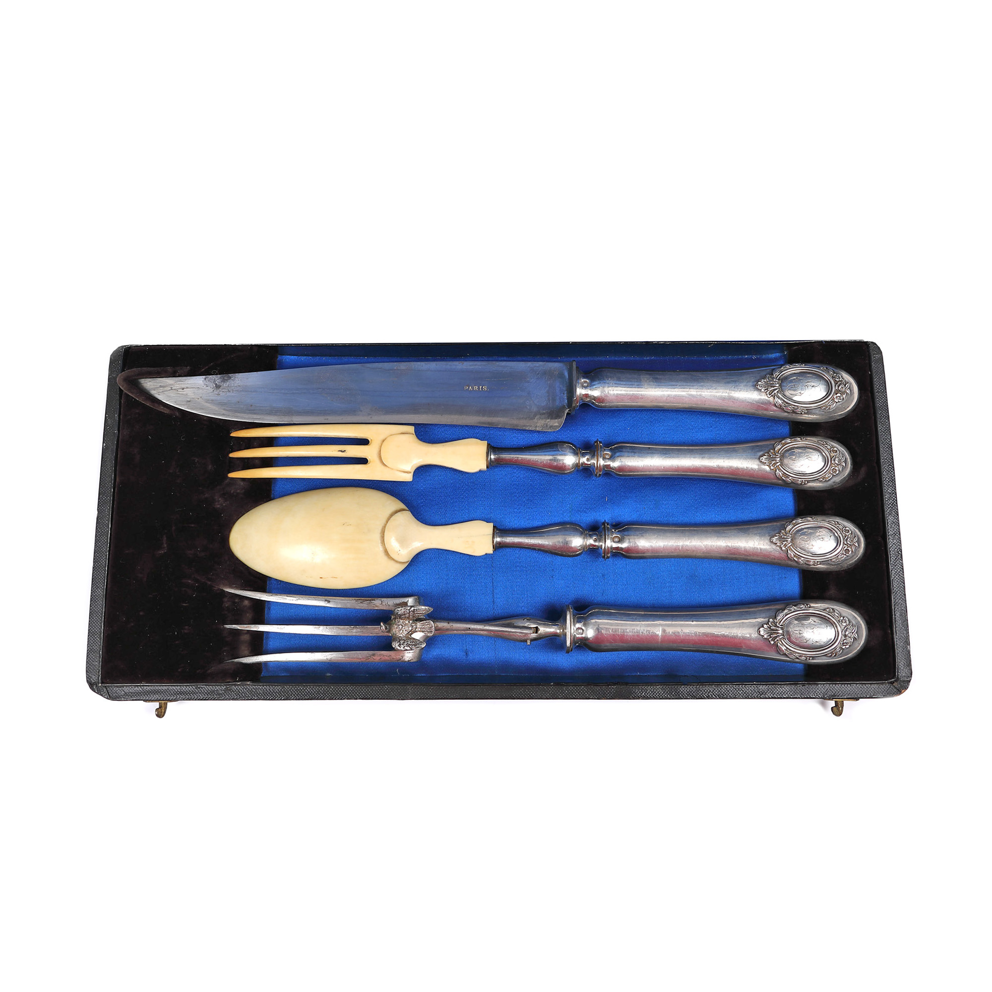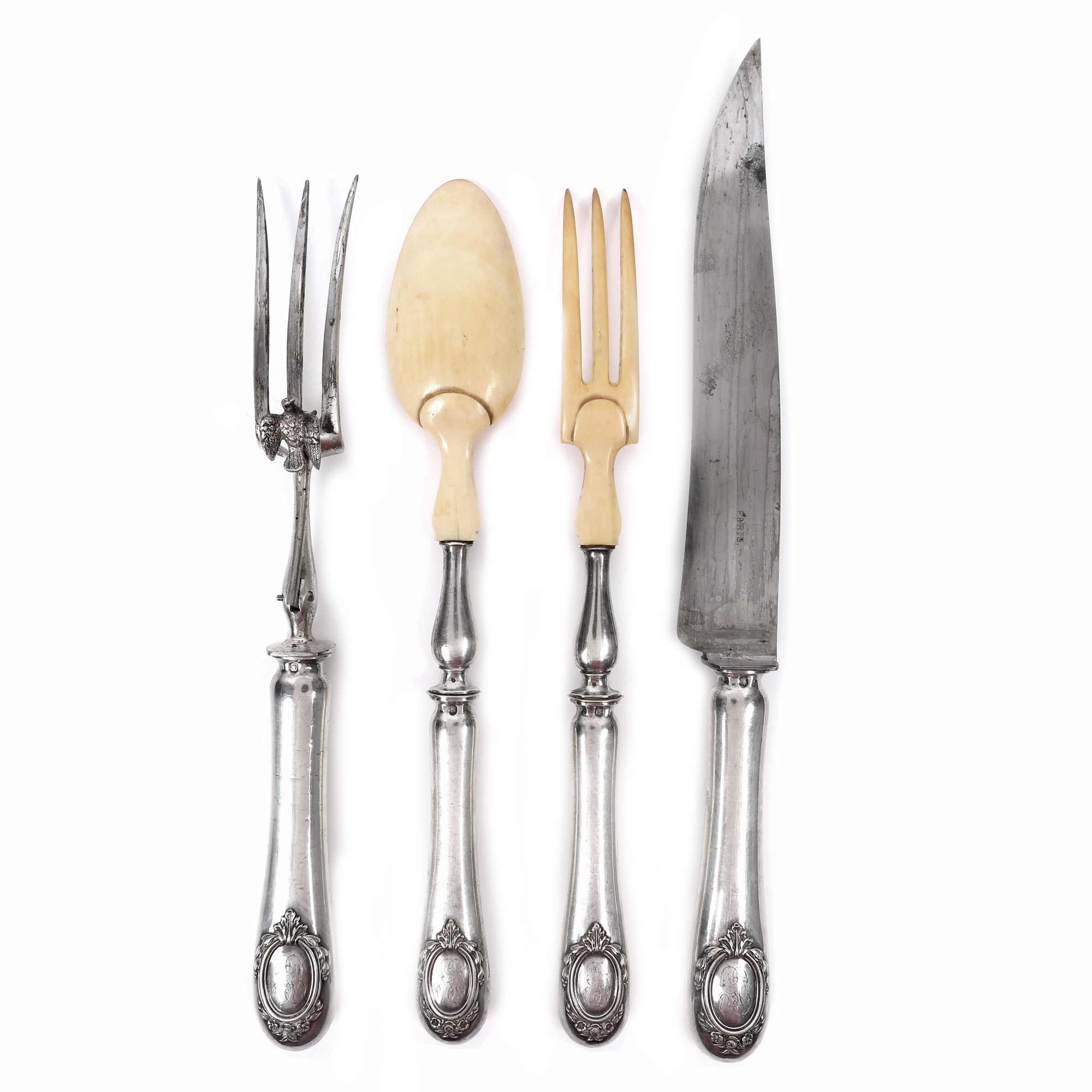 128. Set din argint și fildeș, format din lingură, cuțit și pereche de furculițe, sfârșitul sec. XIX