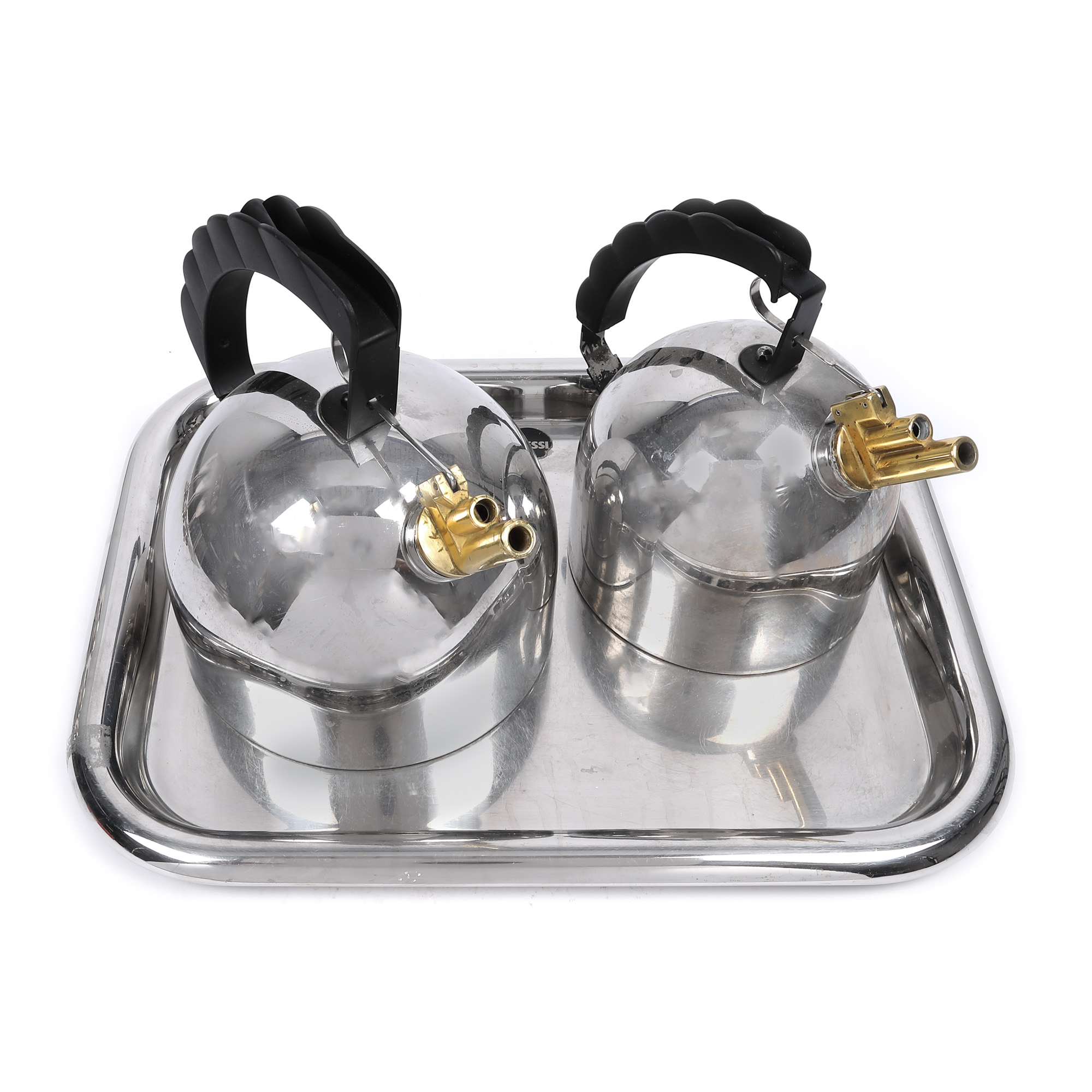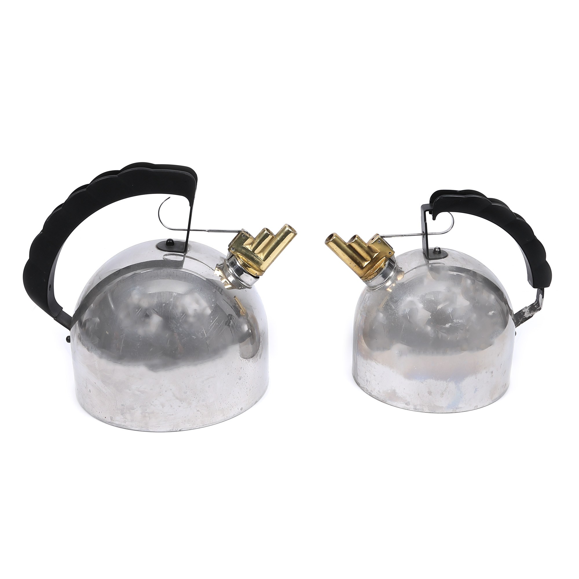 79. Set în stil Postmodernist, format din pereche de ceainice și tavă, design Richard Sapper pentru Alessi [Cca. 1980]