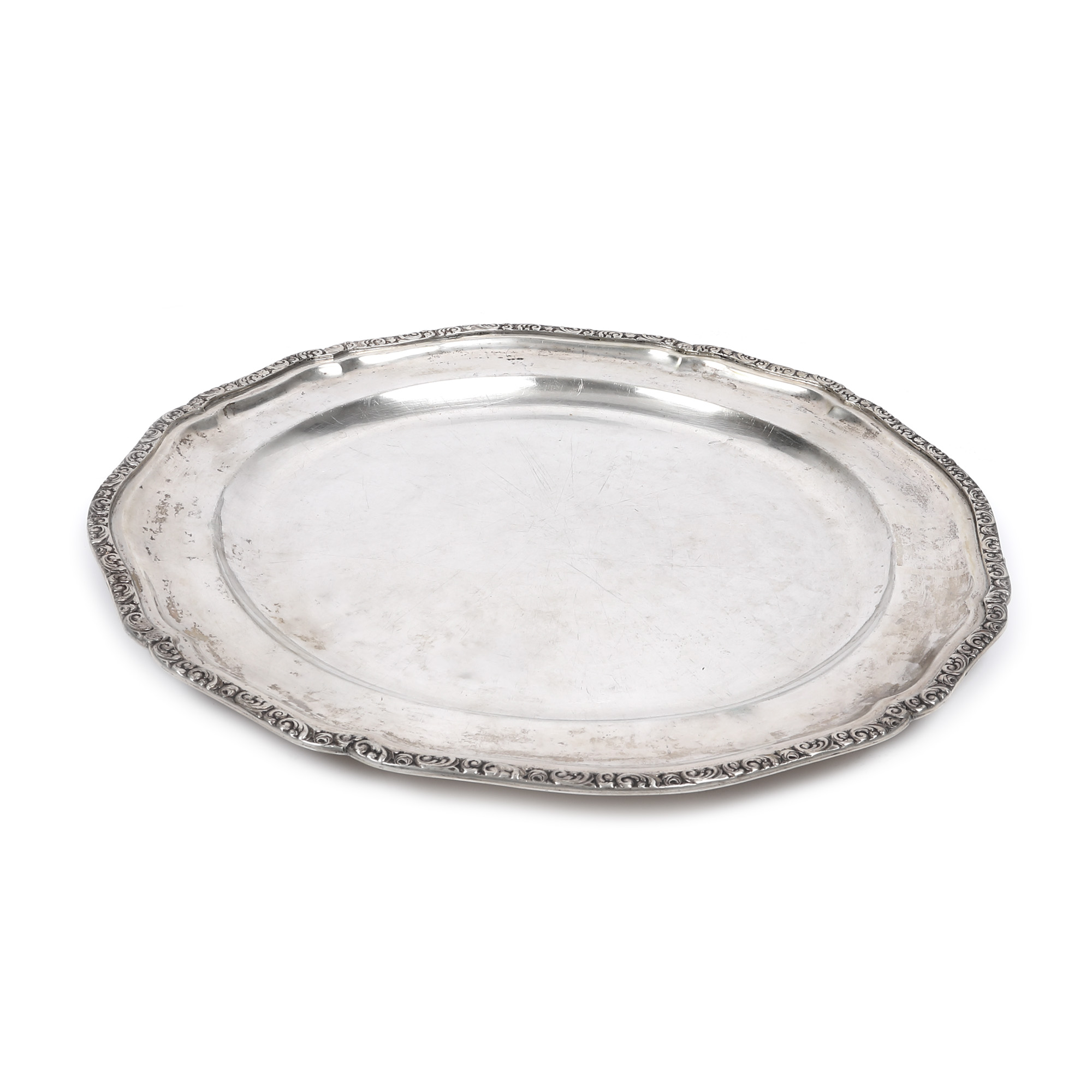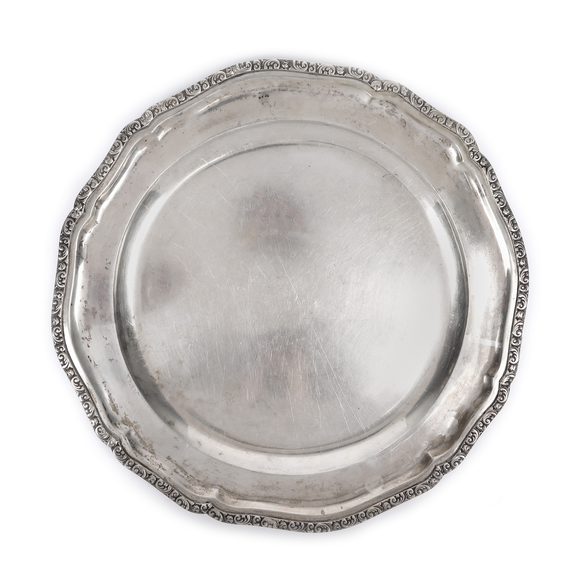 105. Tavă din argint, cu bordura decorată floral, perioada interbelică