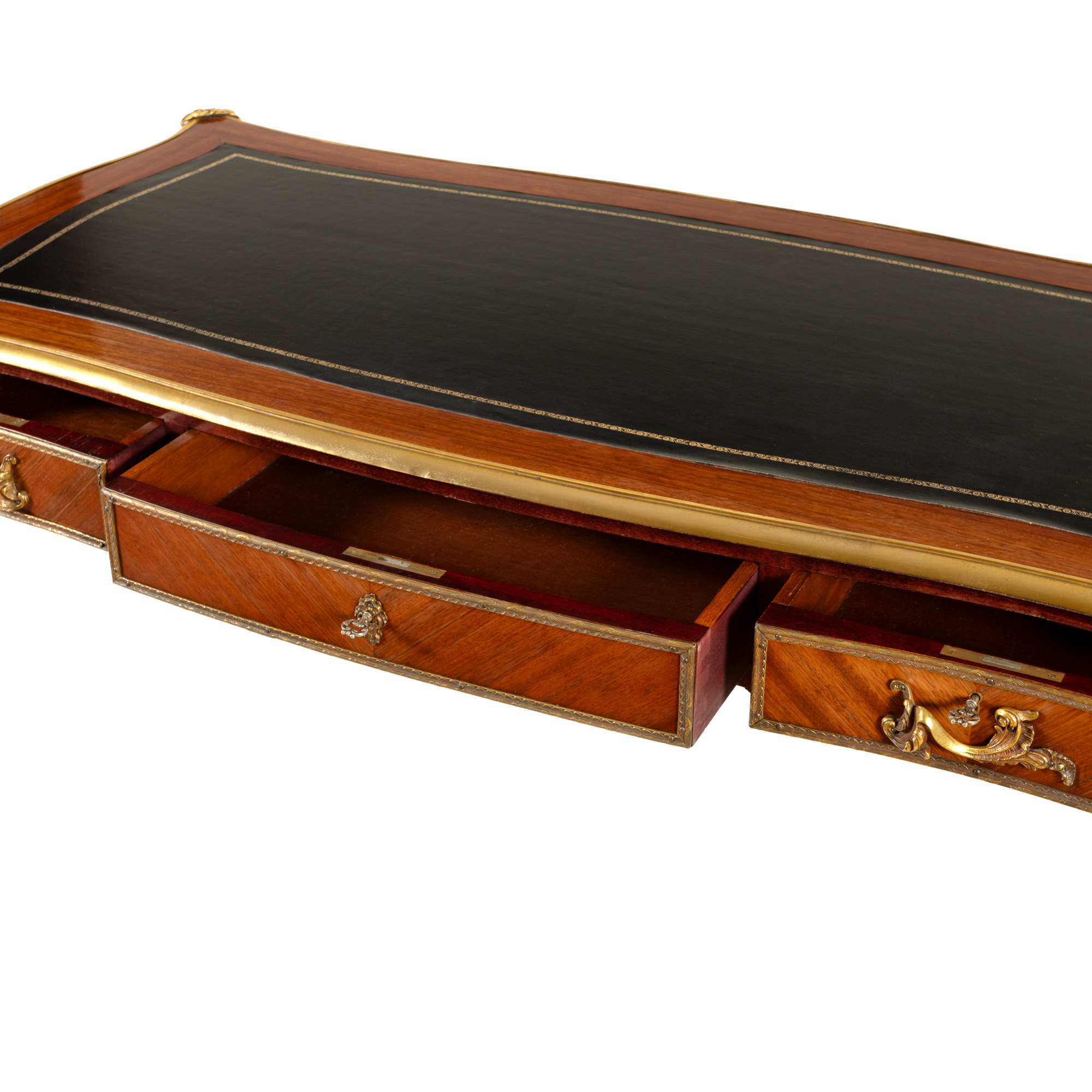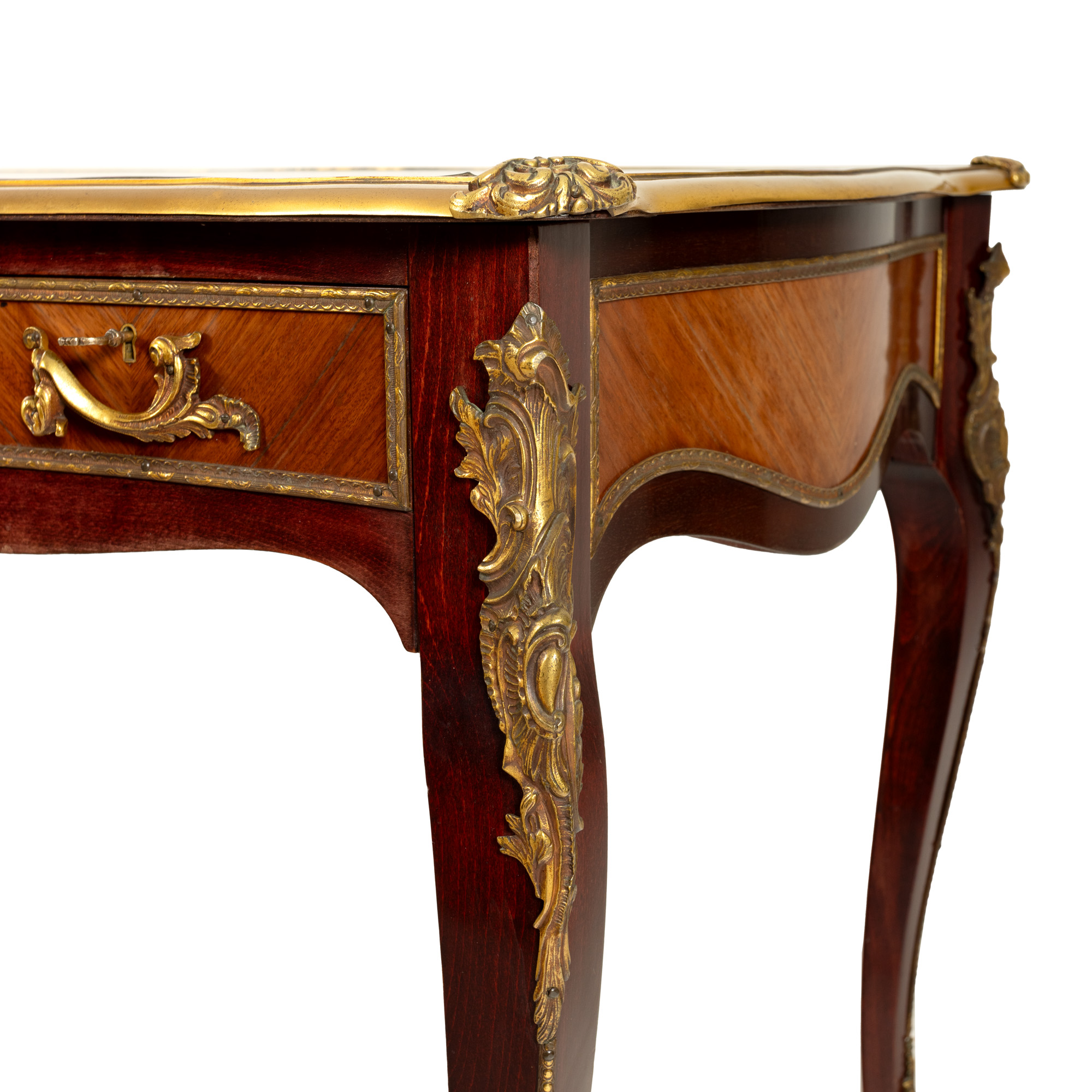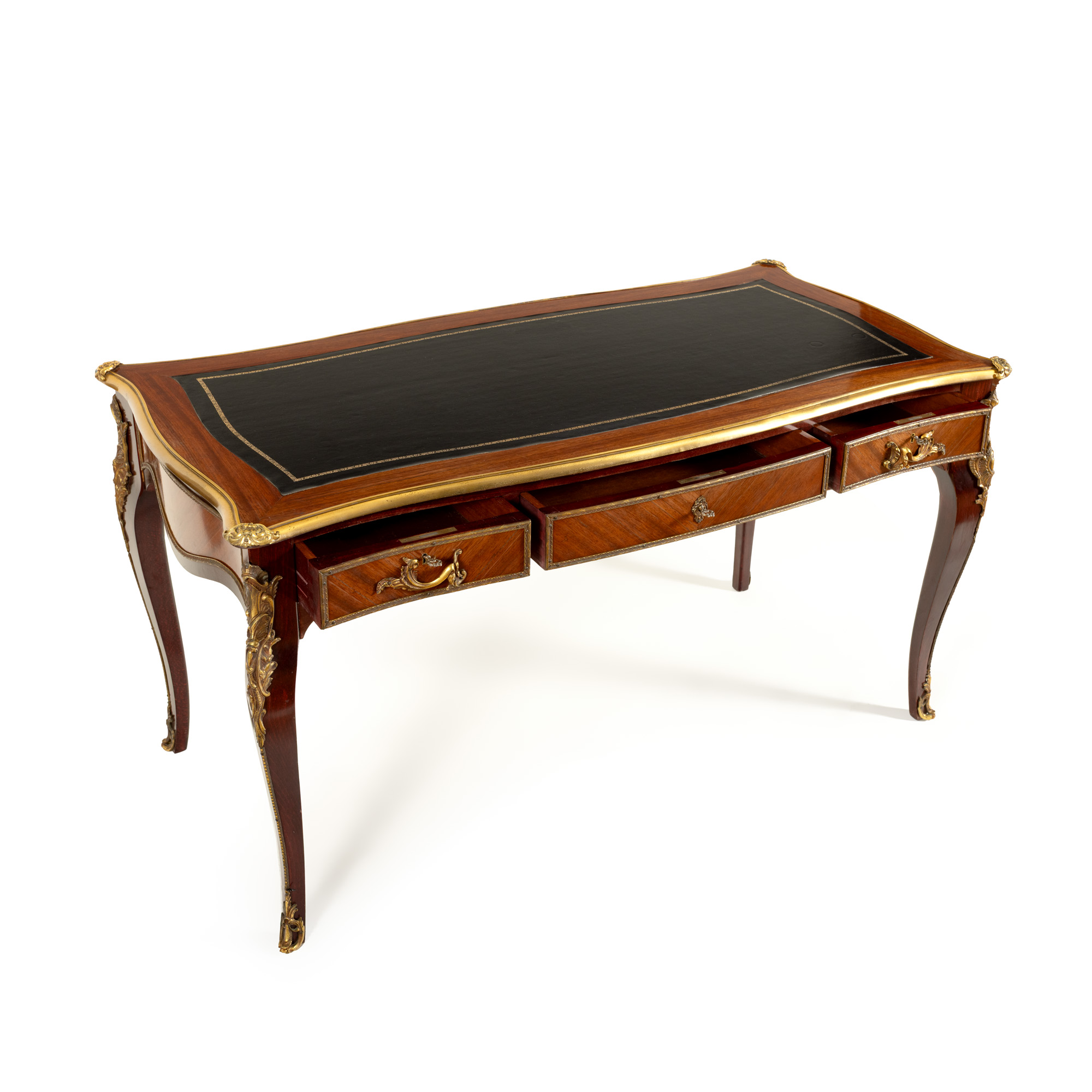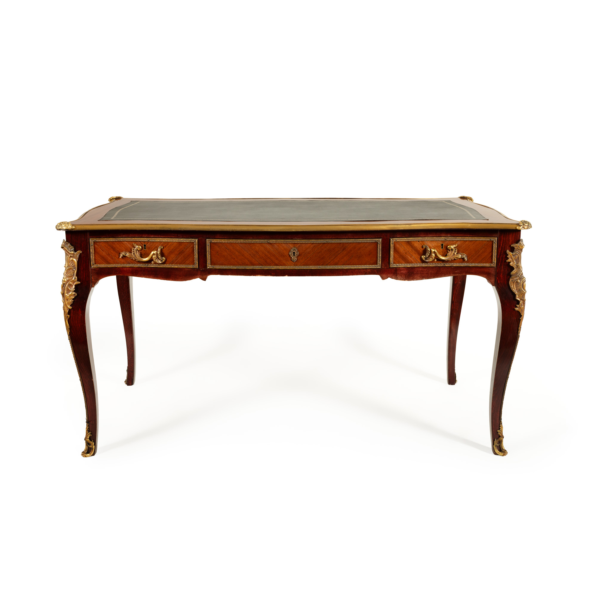 38. Birou în manieră Louis XV, din lemn de nuc, cu blat din piele aurită și aplicații din bronz, începutul sec. XX